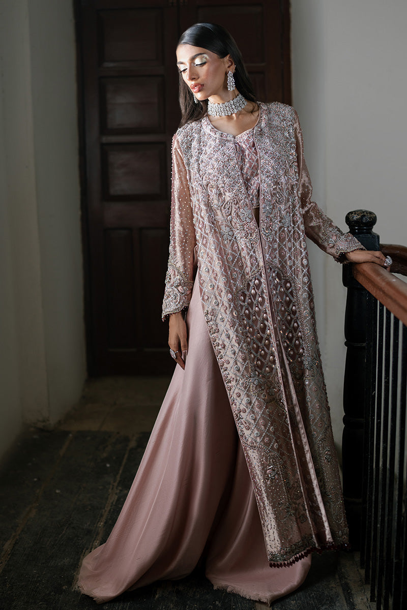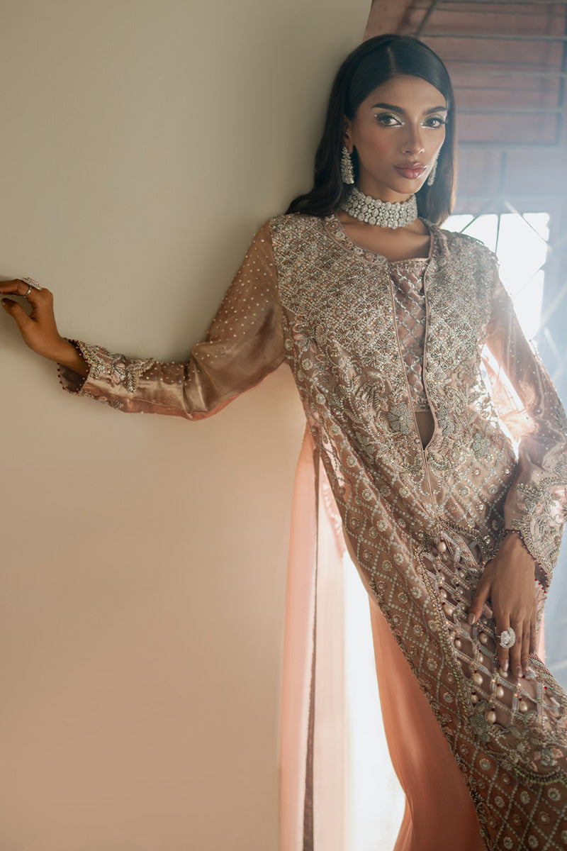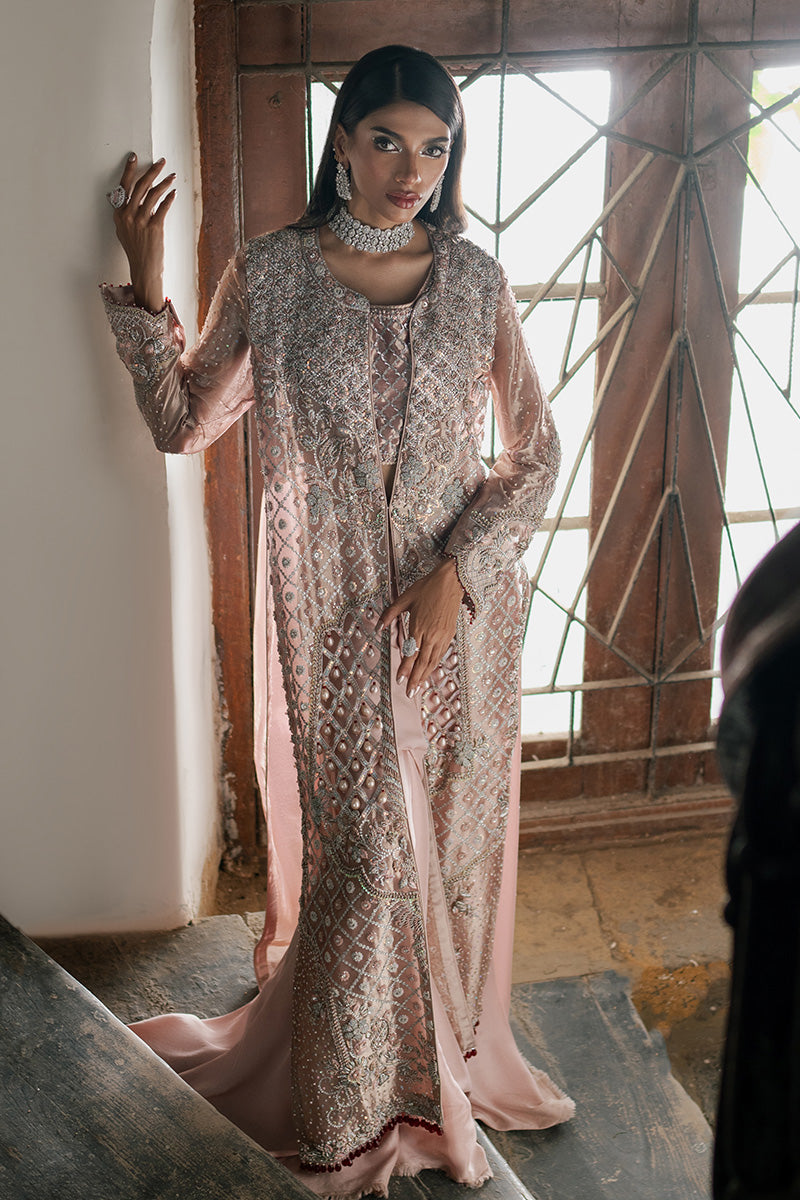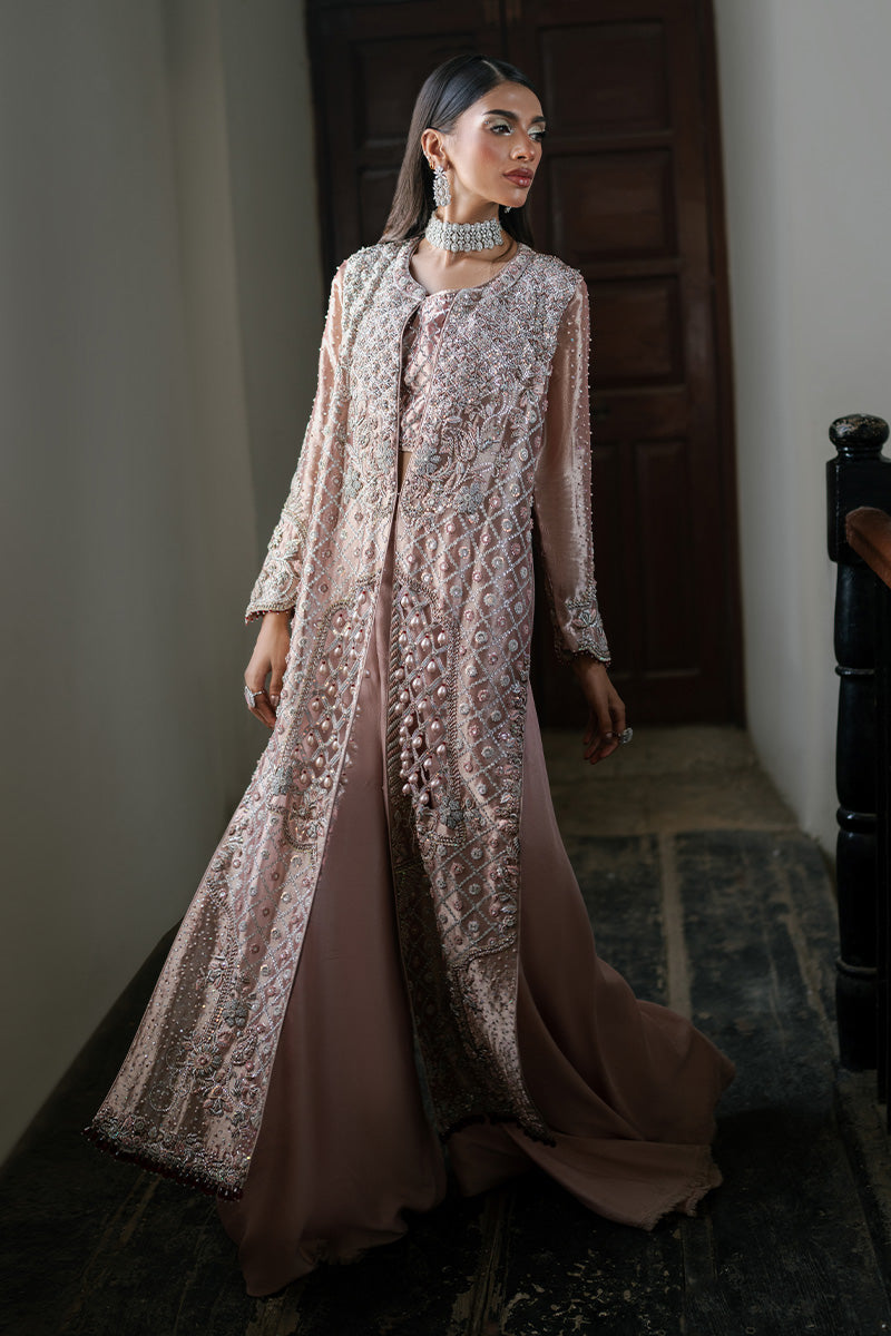 A long laame blush pink front open jacket. Heavy embellished front with cut work detailing. Comes with an intricate motif at the back. Paired with handworked bodice. Flowy silk sharara completes the look .