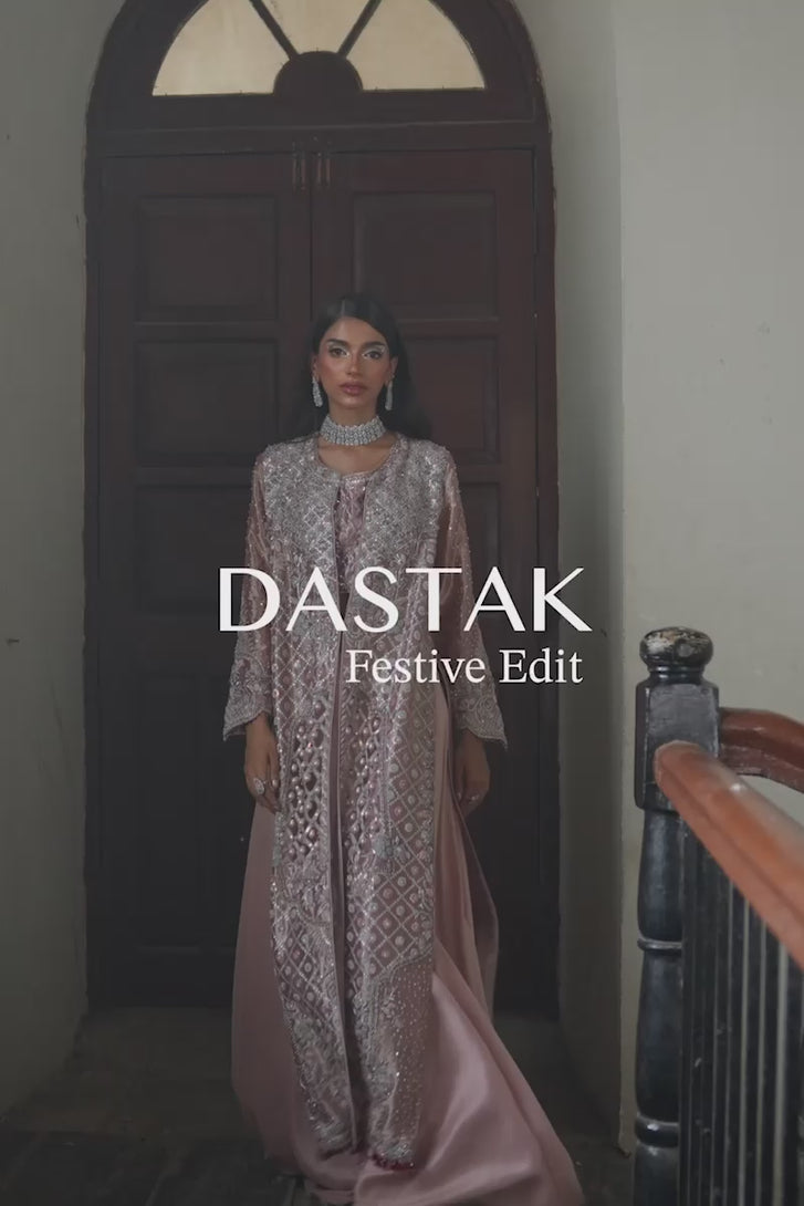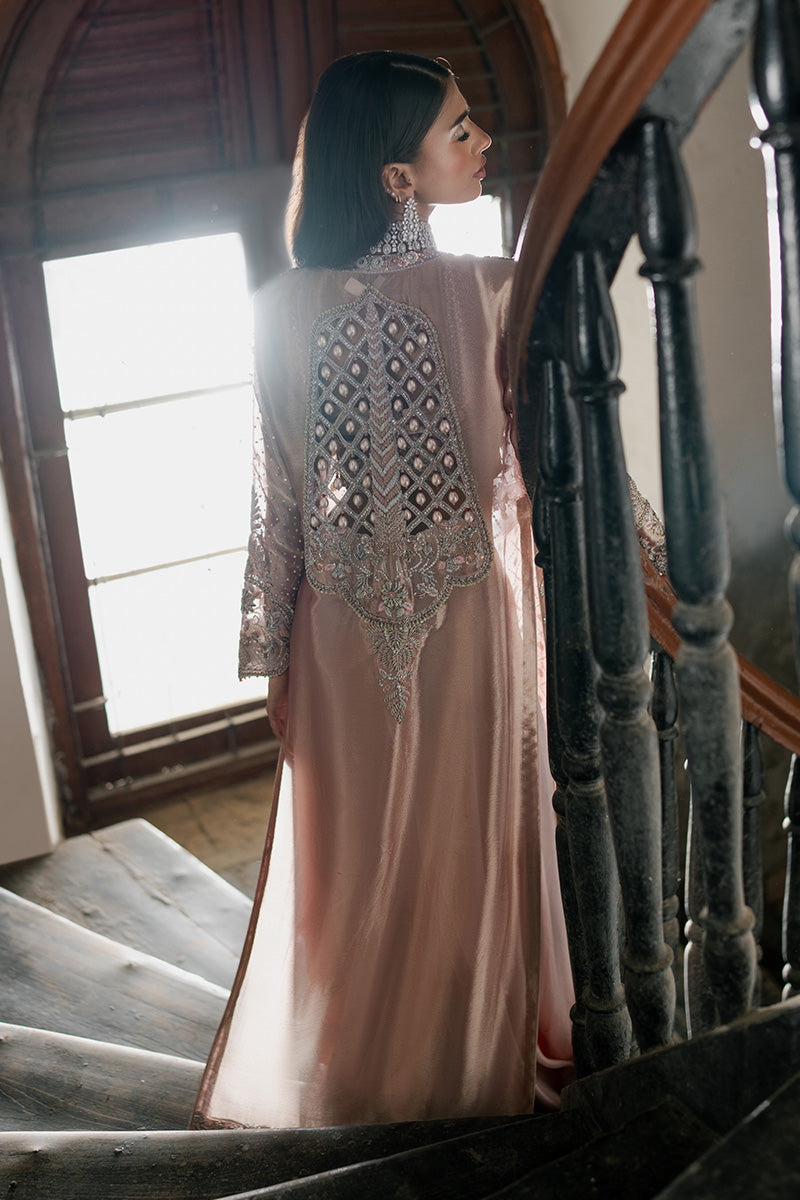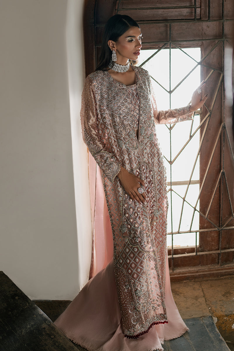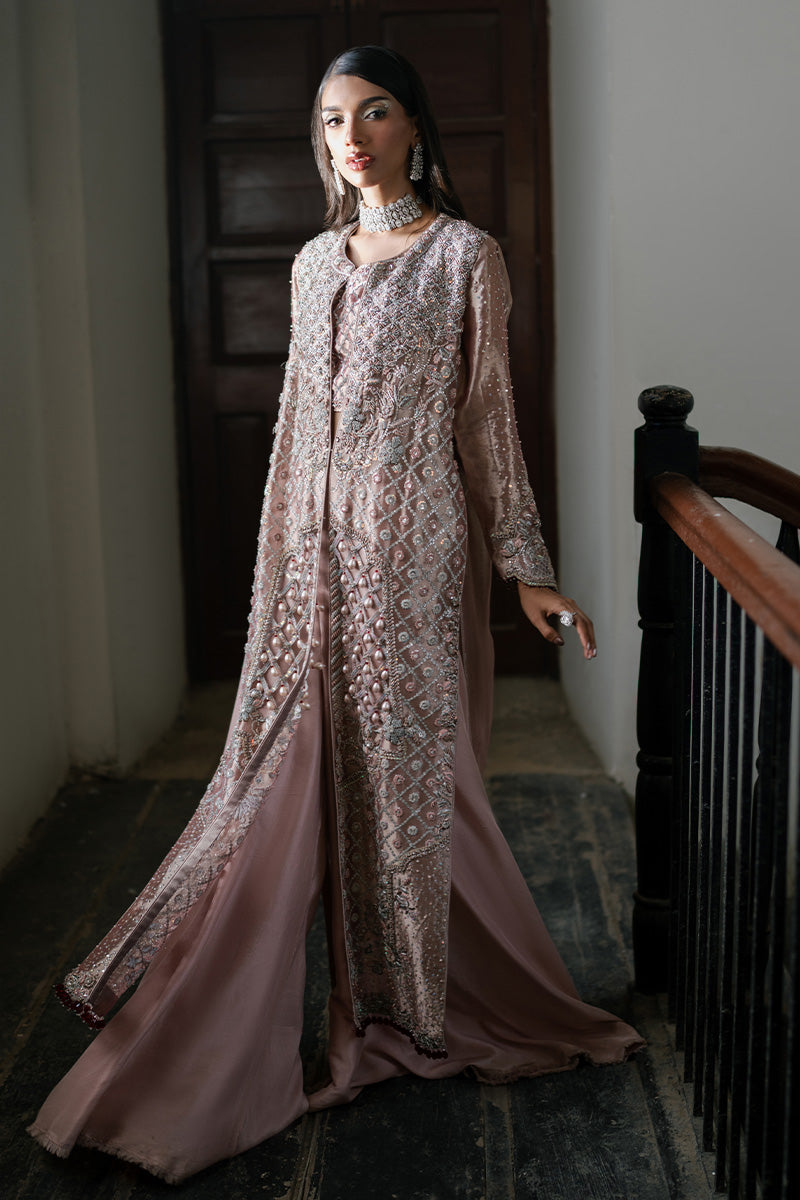 A long laame blush pink front open jacket. Heavy embellished front with cut work detailing. Comes with an intricate motif at the back. Paired with handworked bodice. Flowy silk sharara completes the look .