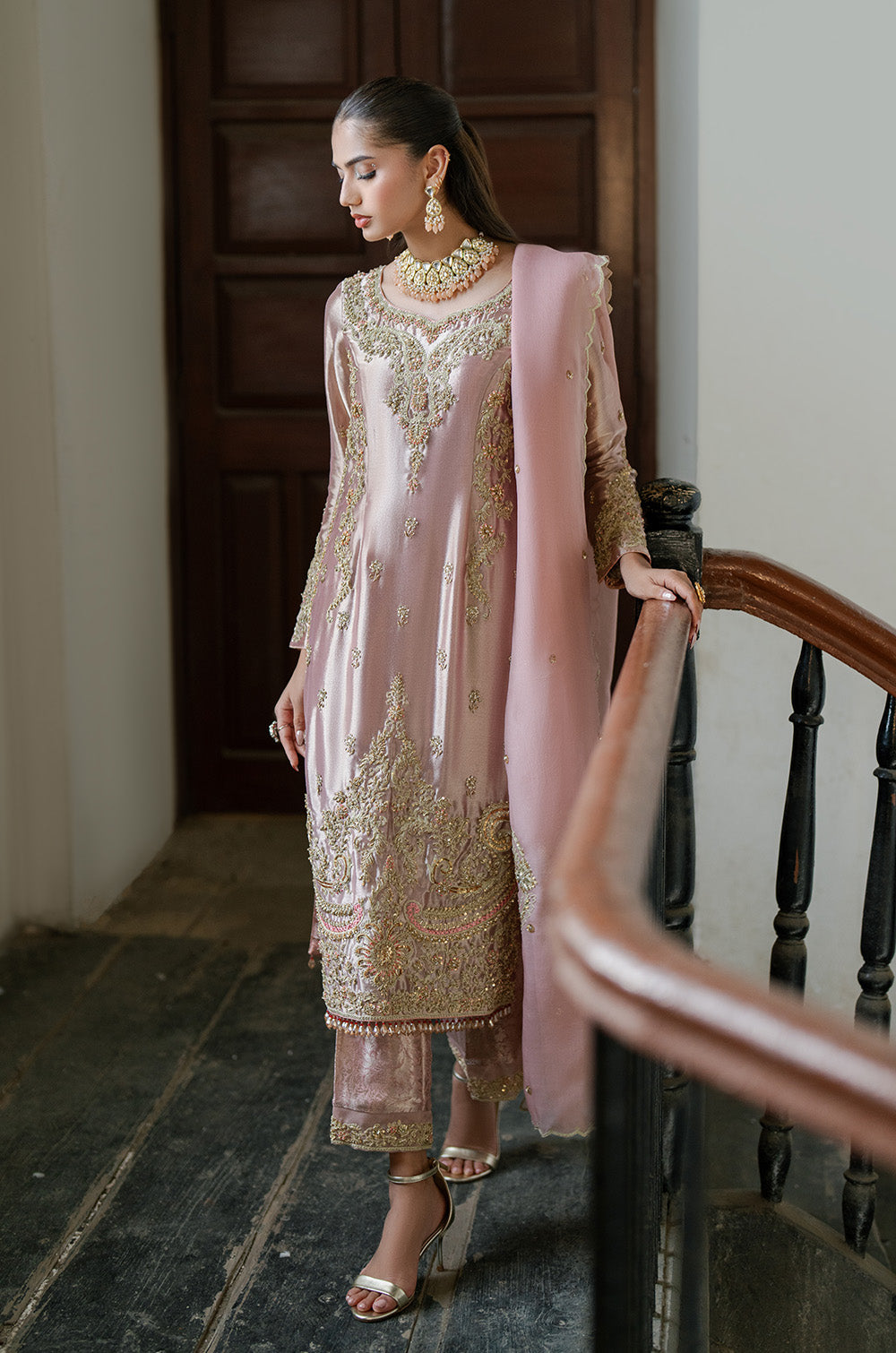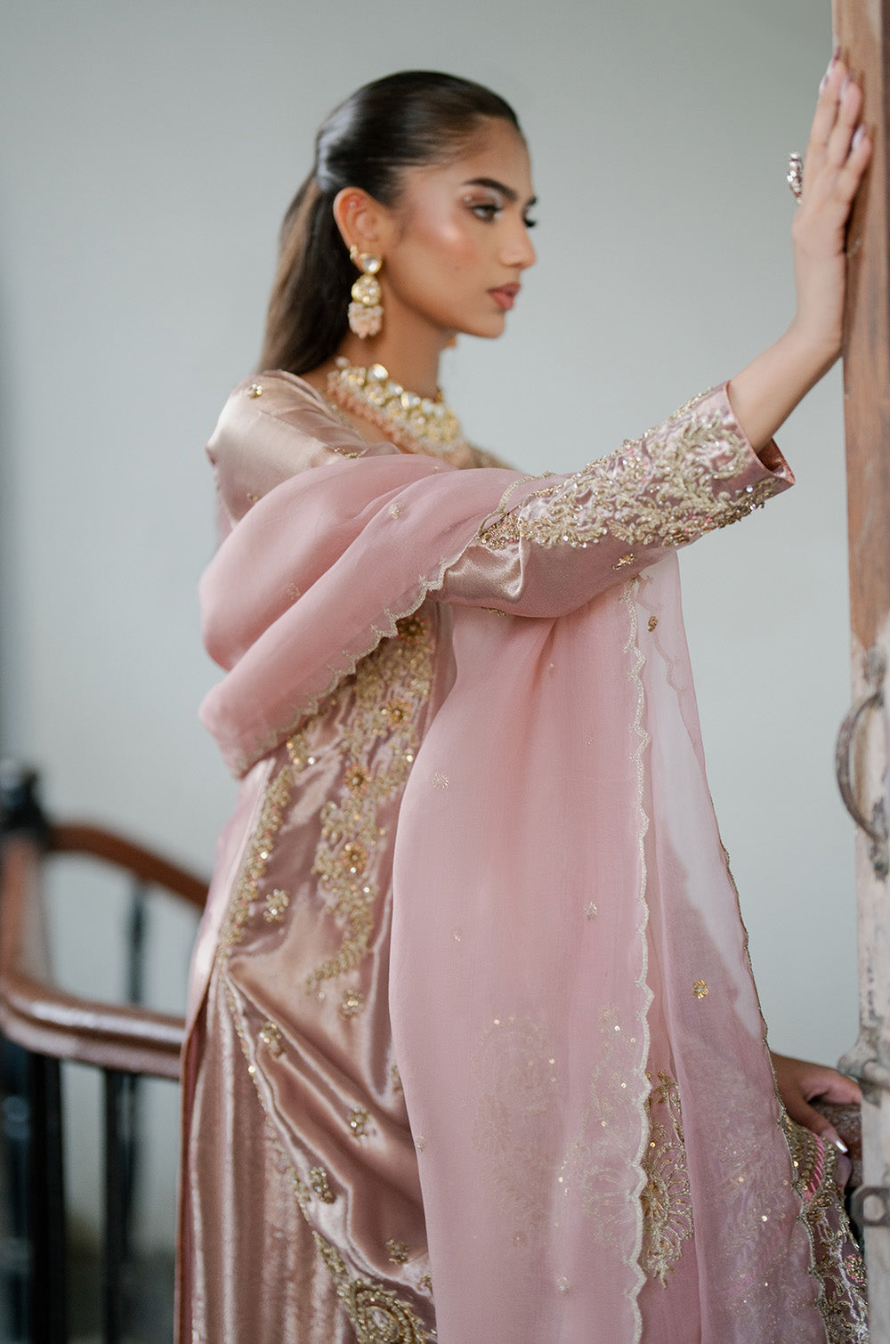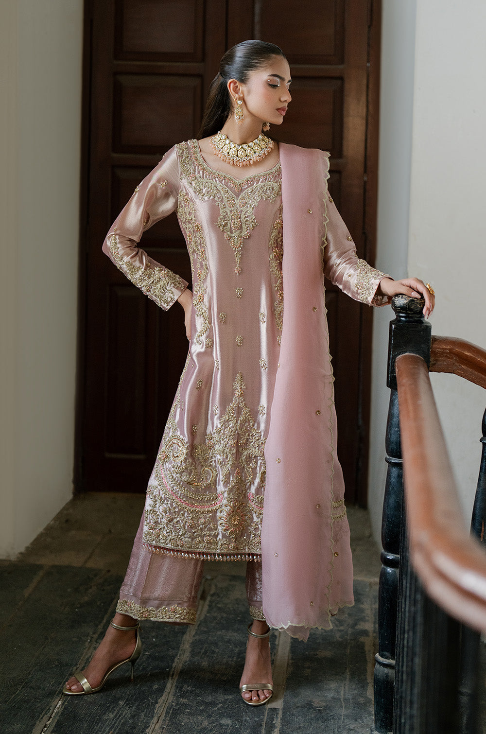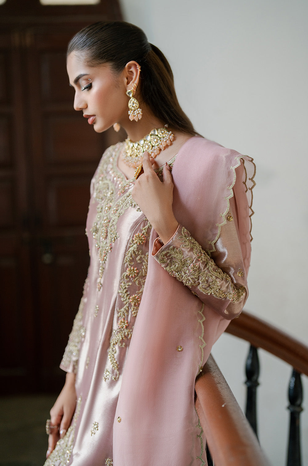 A straight laame long shirt in hues of pink enhanced with marori work all over. Comes with a nicely finished scalloped organza duppata along with work details. Paired with jamawar izaar pants finnishes with heavy worked border.