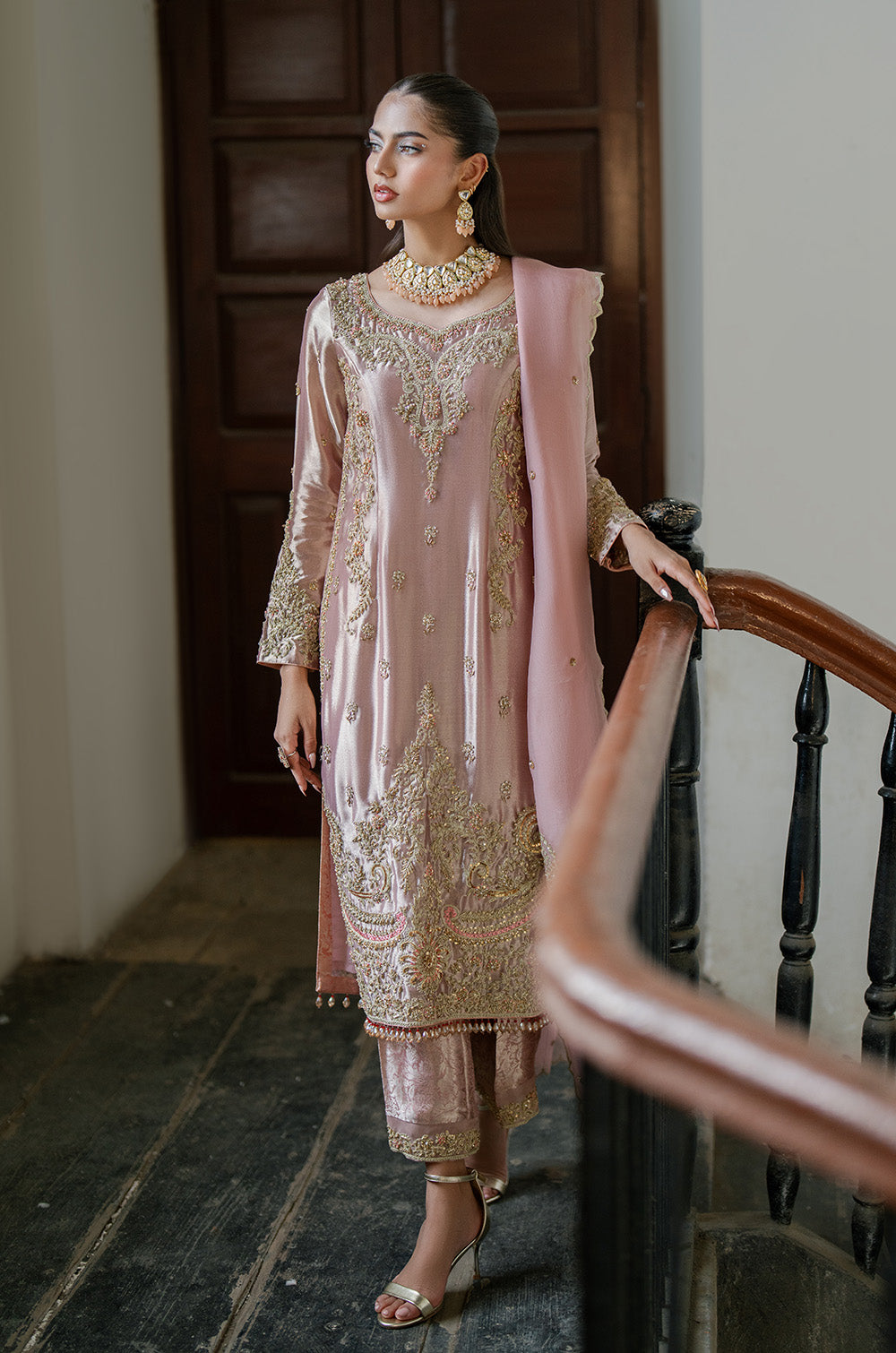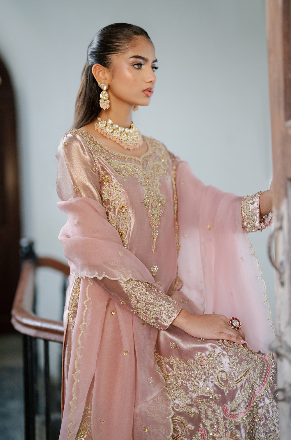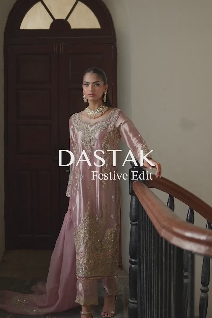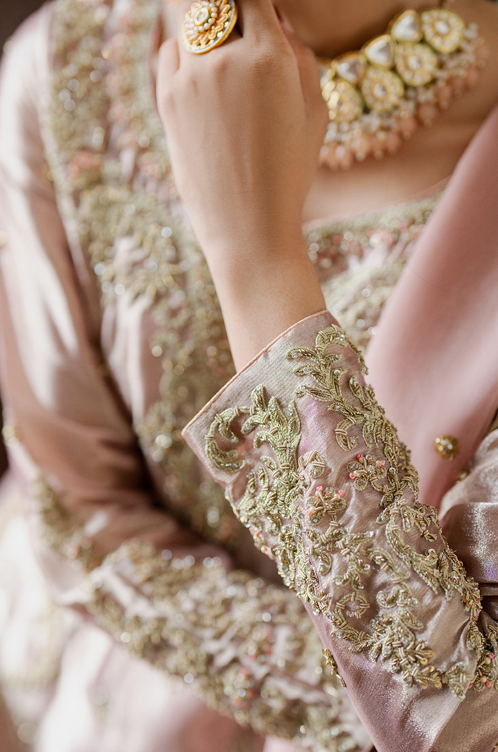 A straight laame long shirt in hues of pink enhanced with marori work all over. Comes with a nicely finished scalloped organza duppata along with work details. Paired with jamawar izaar pants finnishes with heavy worked border.