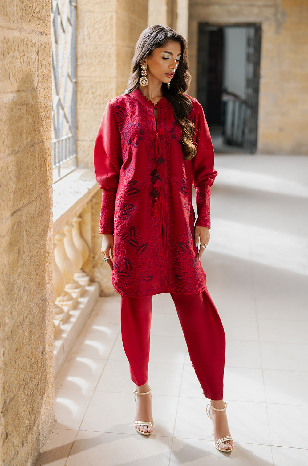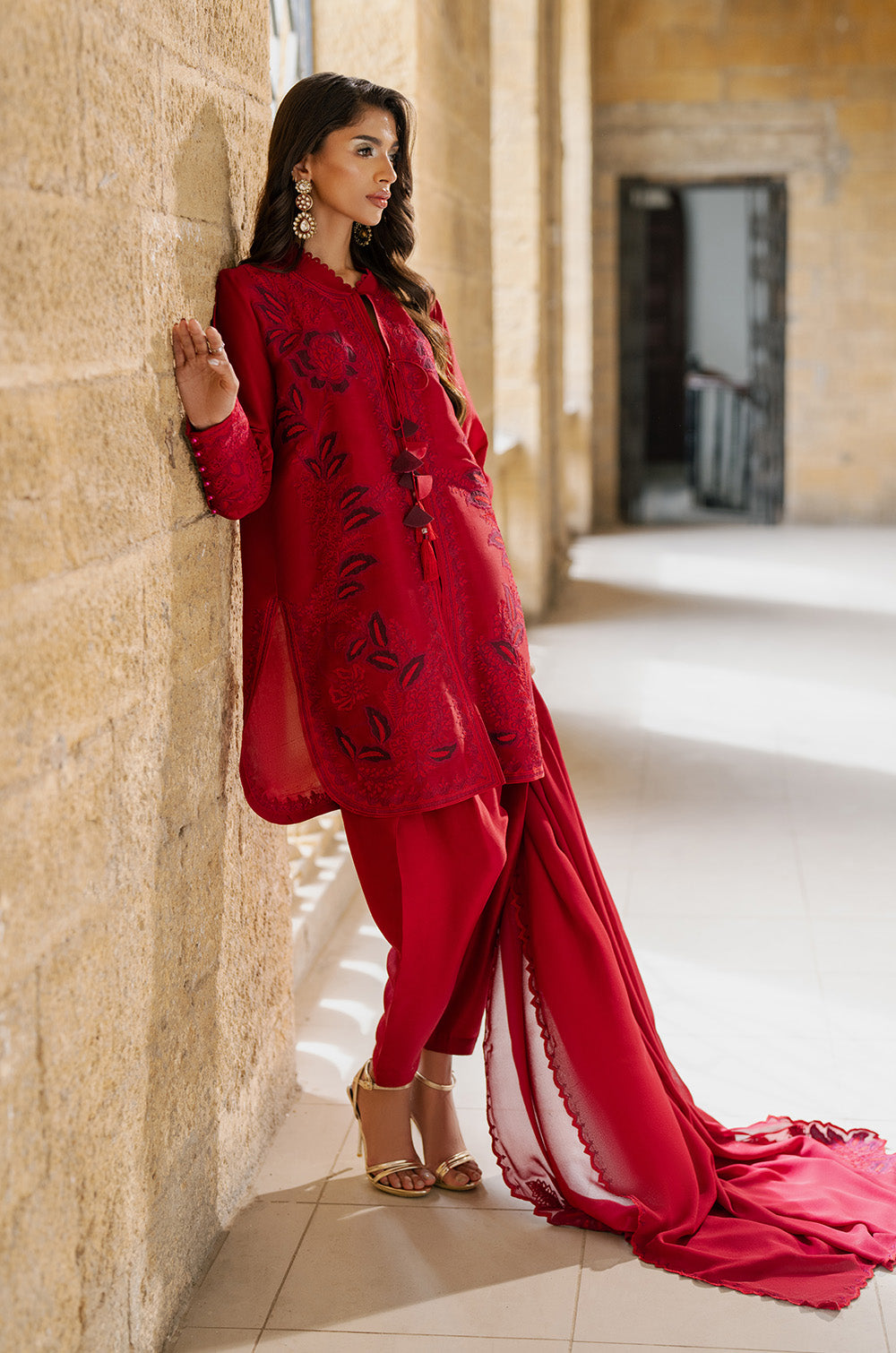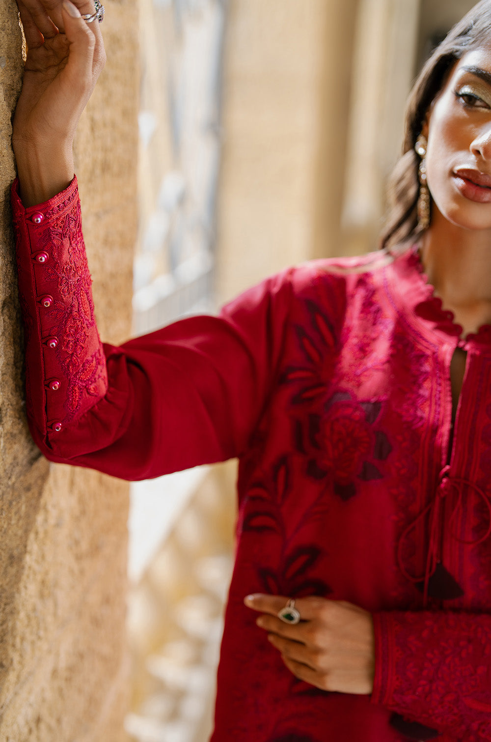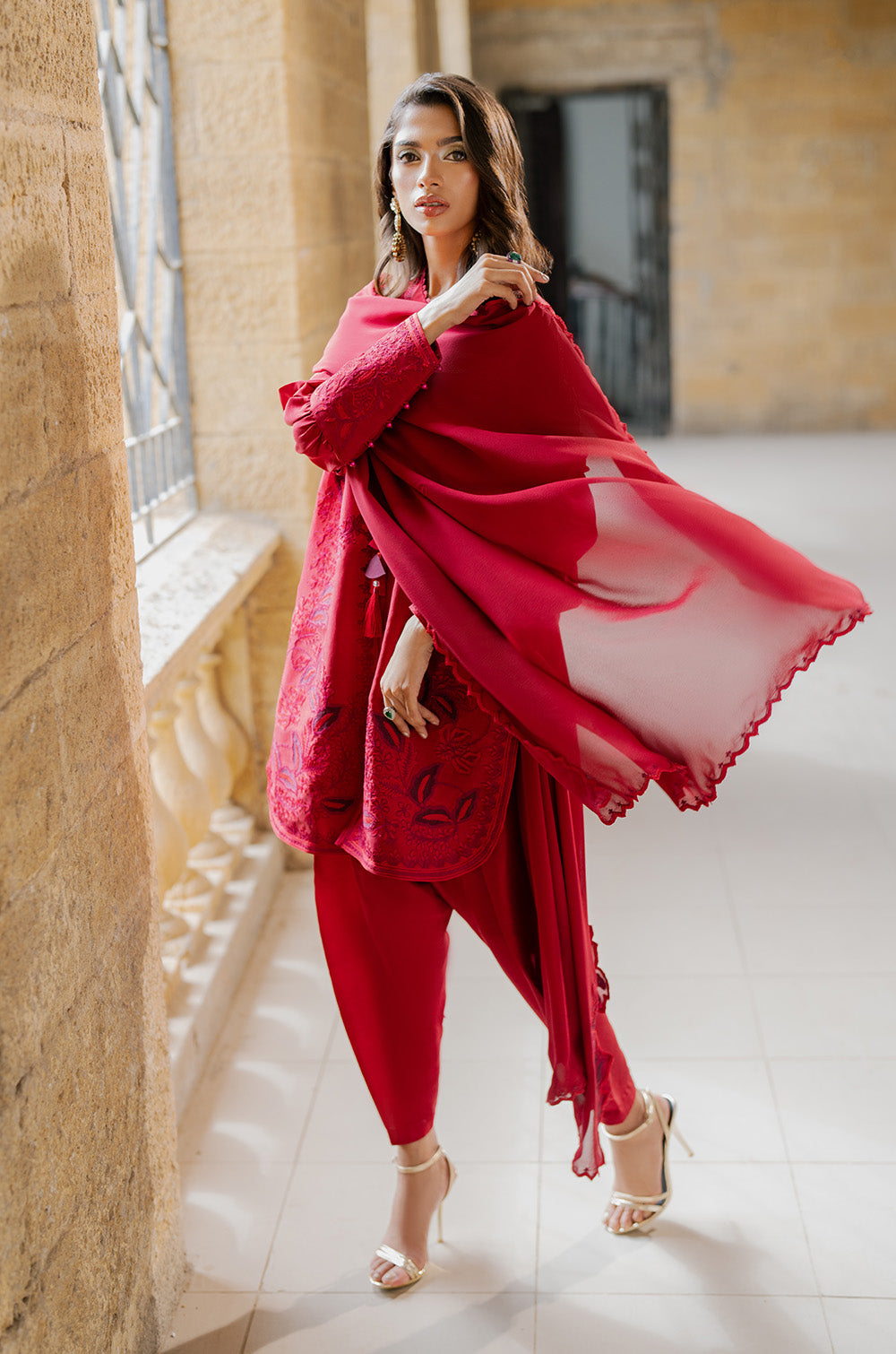 KYRA is a whimsical pure raw silk front open shirt in enchanting red and maroon hues, with contemporary floral Applique and Ari work details. Paired with Pure raw silk shalwar and georgette chiffon dupatta