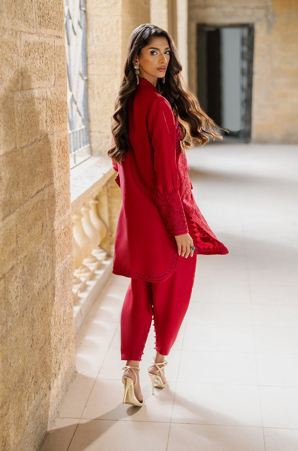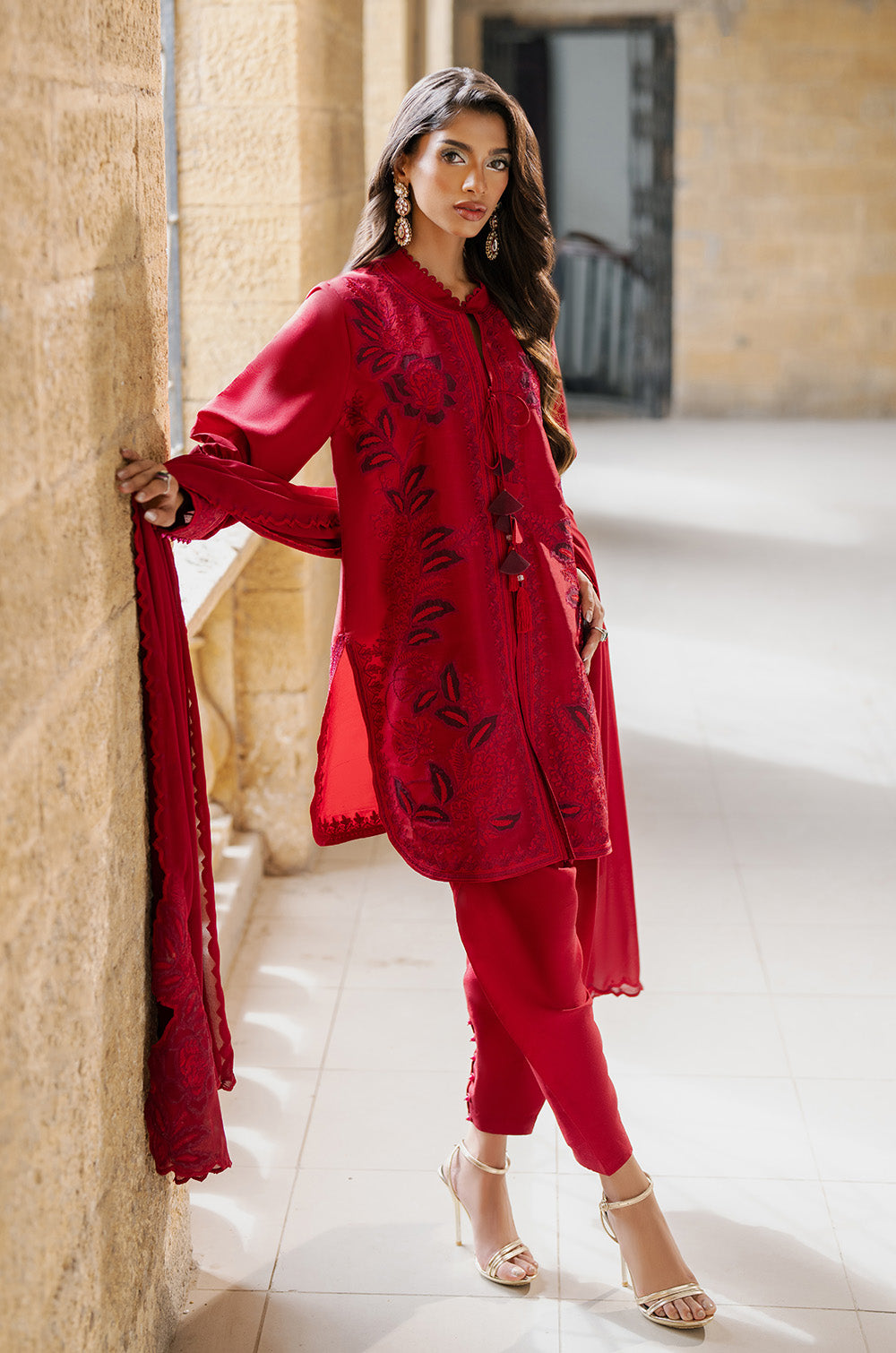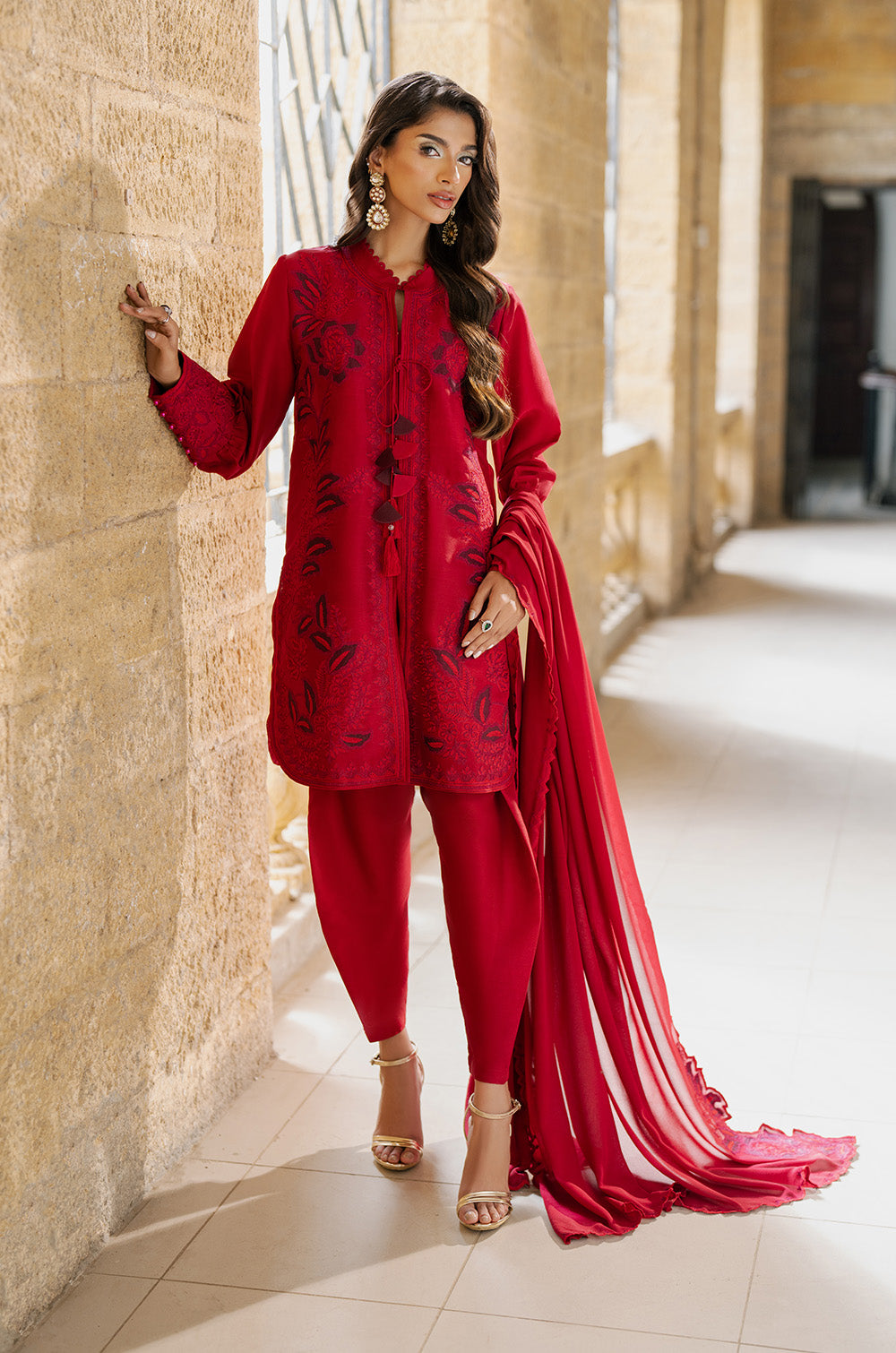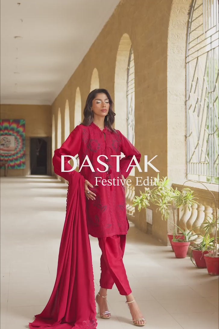 KYRA is a whimsical pure raw silk front open shirt in enchanting red and maroon hues, with contemporary floral Applique and Ari work details. Paired with Pure raw silk shalwar and georgette chiffon dupatta