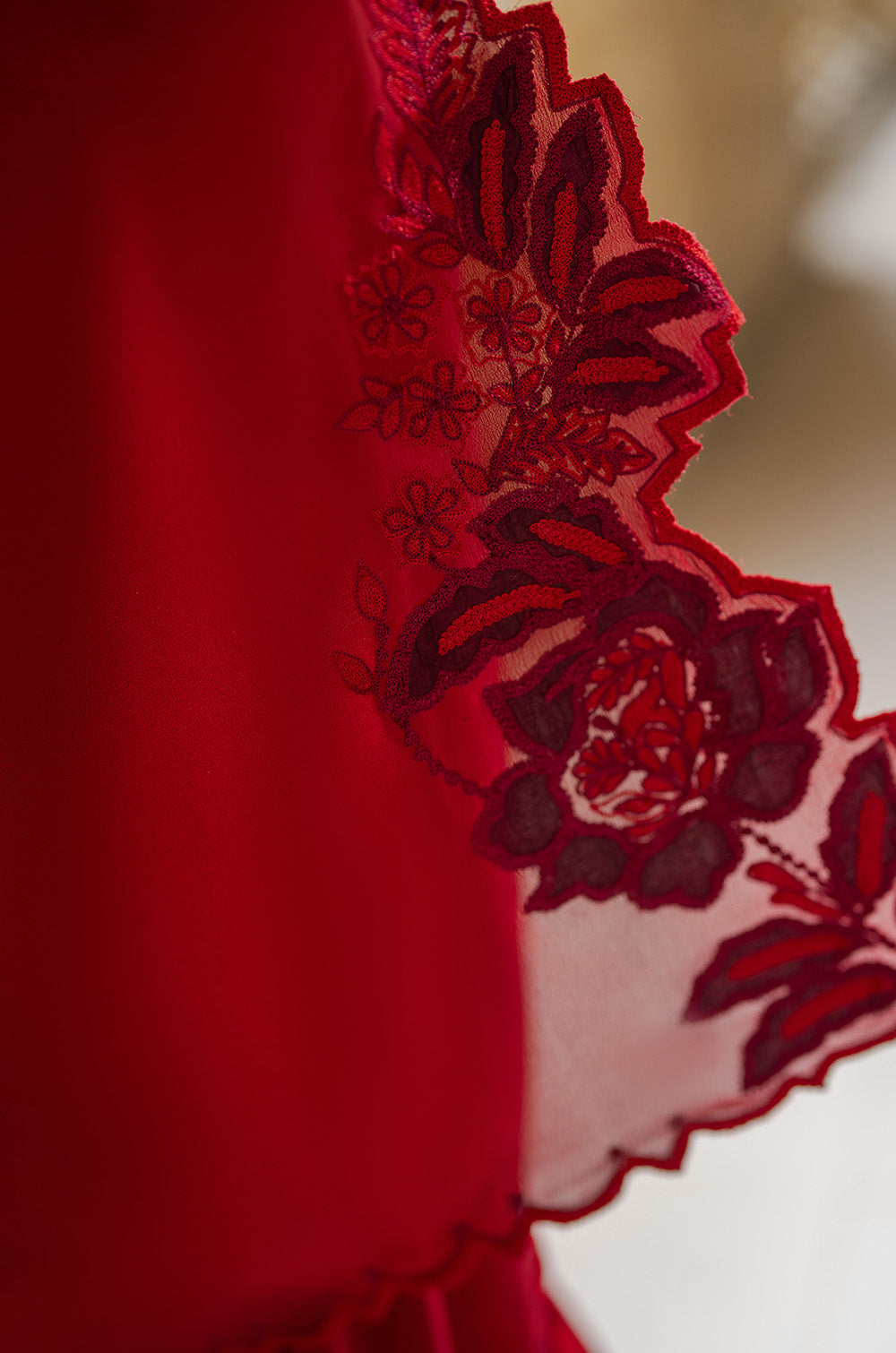 KYRA is a whimsical pure raw silk front open shirt in enchanting red and maroon hues, with contemporary floral Applique...