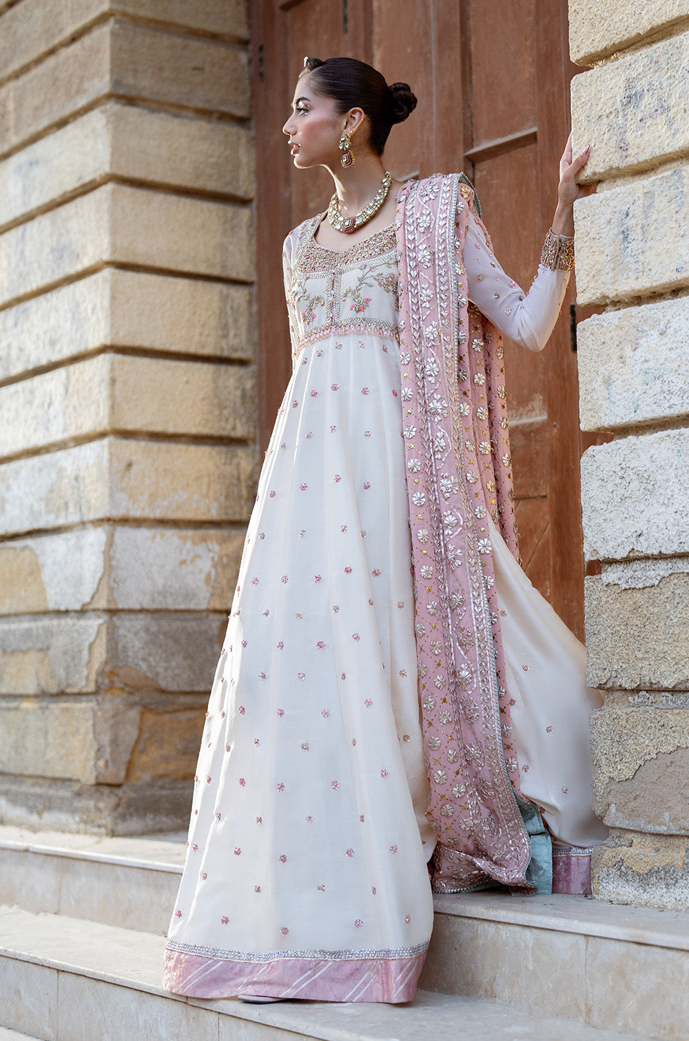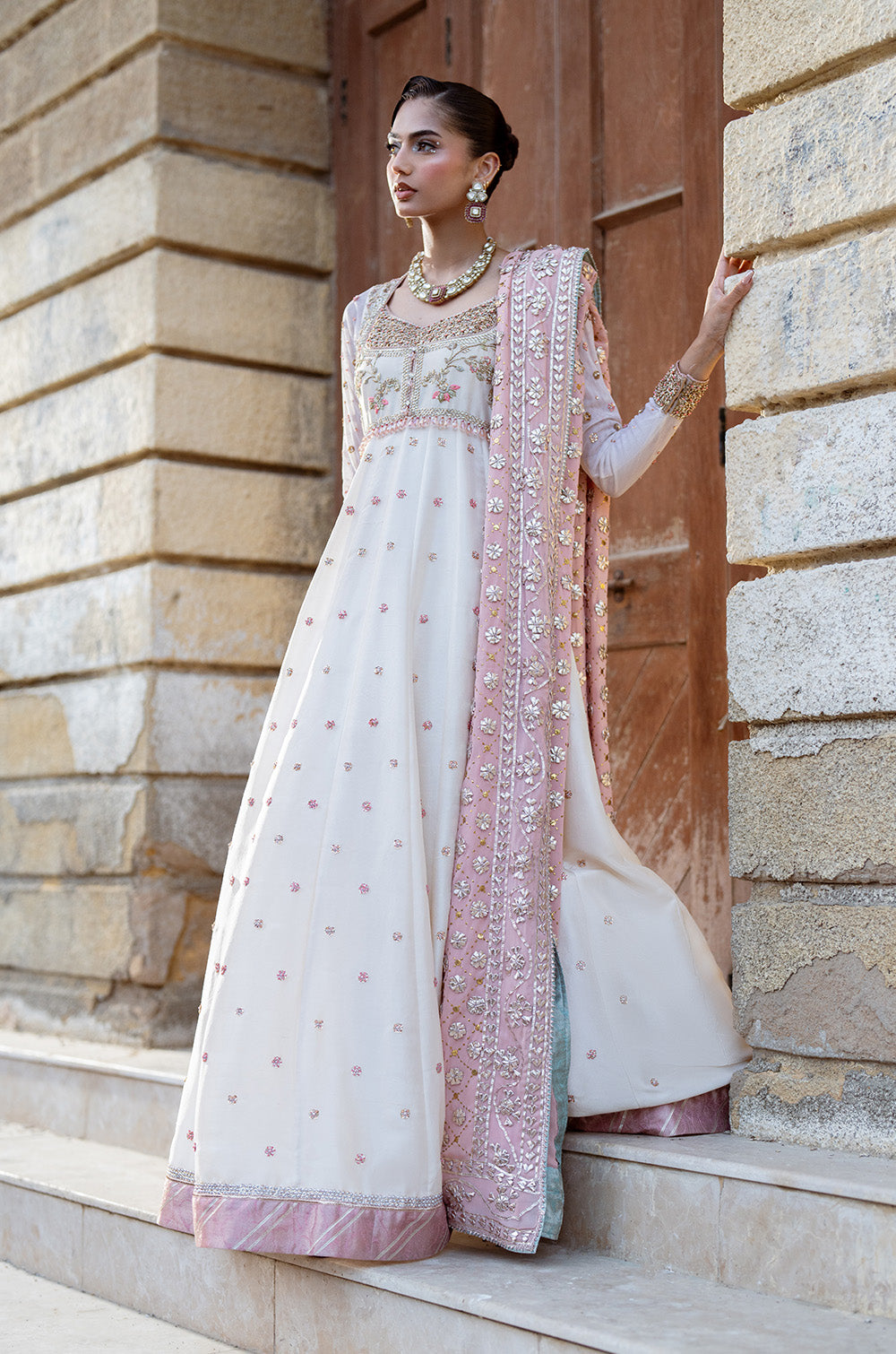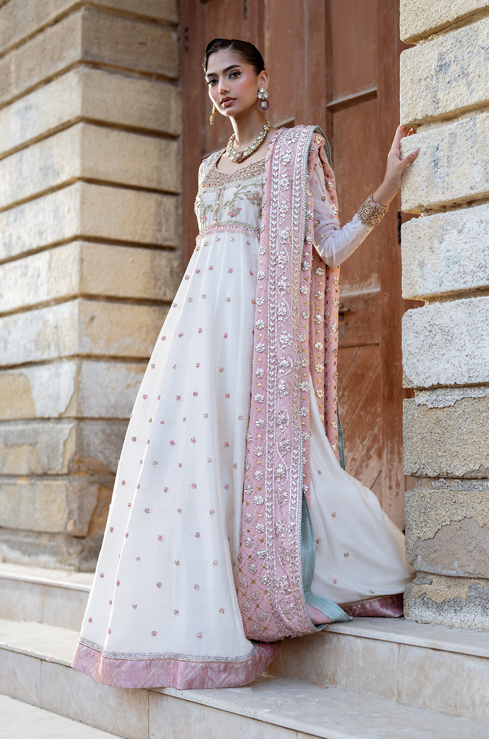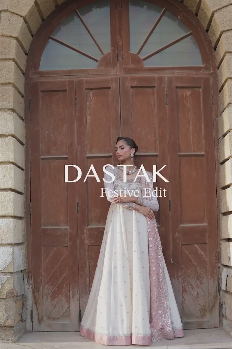 This exquisite raw silk panelled peshwas is complimented by a traditional body adorned with intricate hand embellished work. Net sleeves with border and chhan completes the look. This peshwas can additionally be paired with a heavy kamdaani and gota chaadar. This ensemble combines tradition and royalty together.