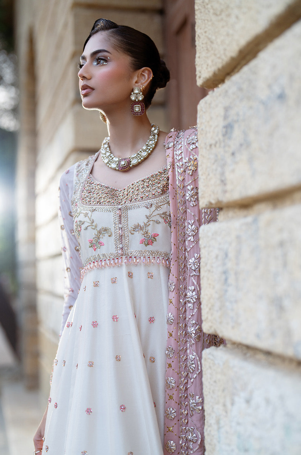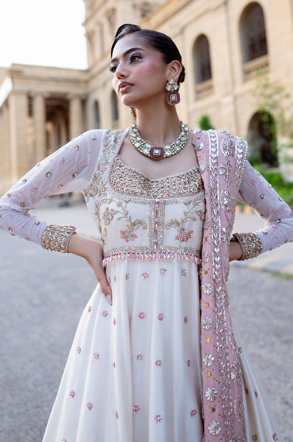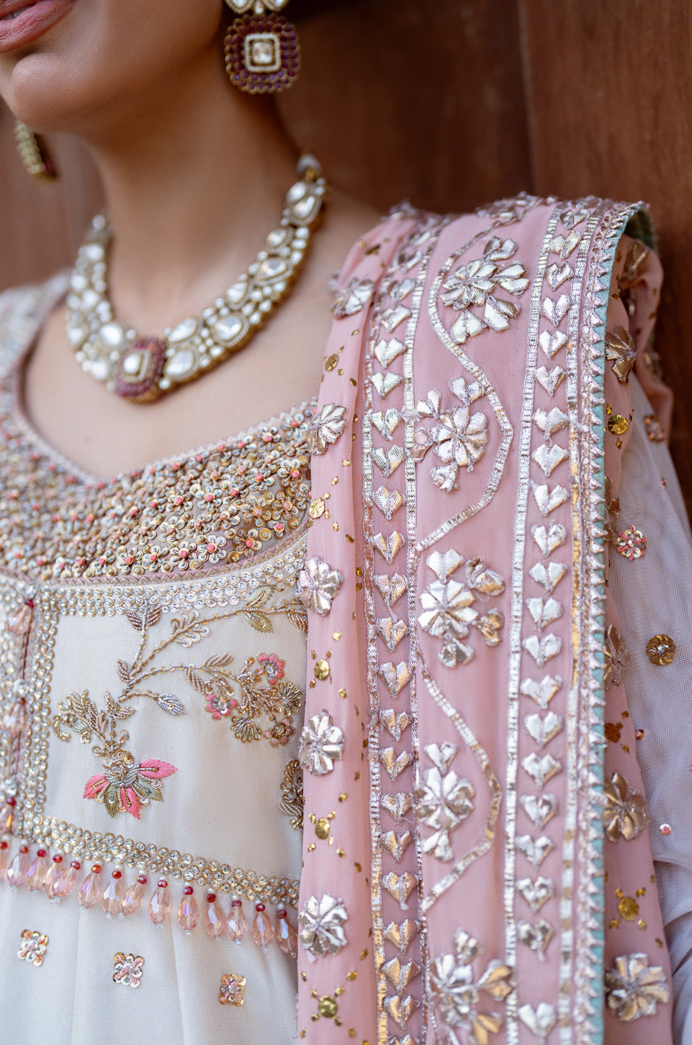 This exquisite raw silk panelled peshwas is complimented by a traditional body adorned with intricate hand embellished work. Net sleeves with border and chhan completes the look. This peshwas can additionally be paired with a heavy kamdaani and gota chaadar. This ensemble combines tradition and royalty together.