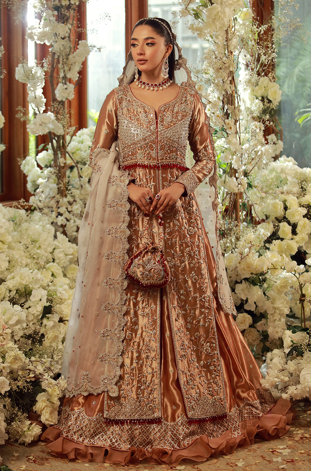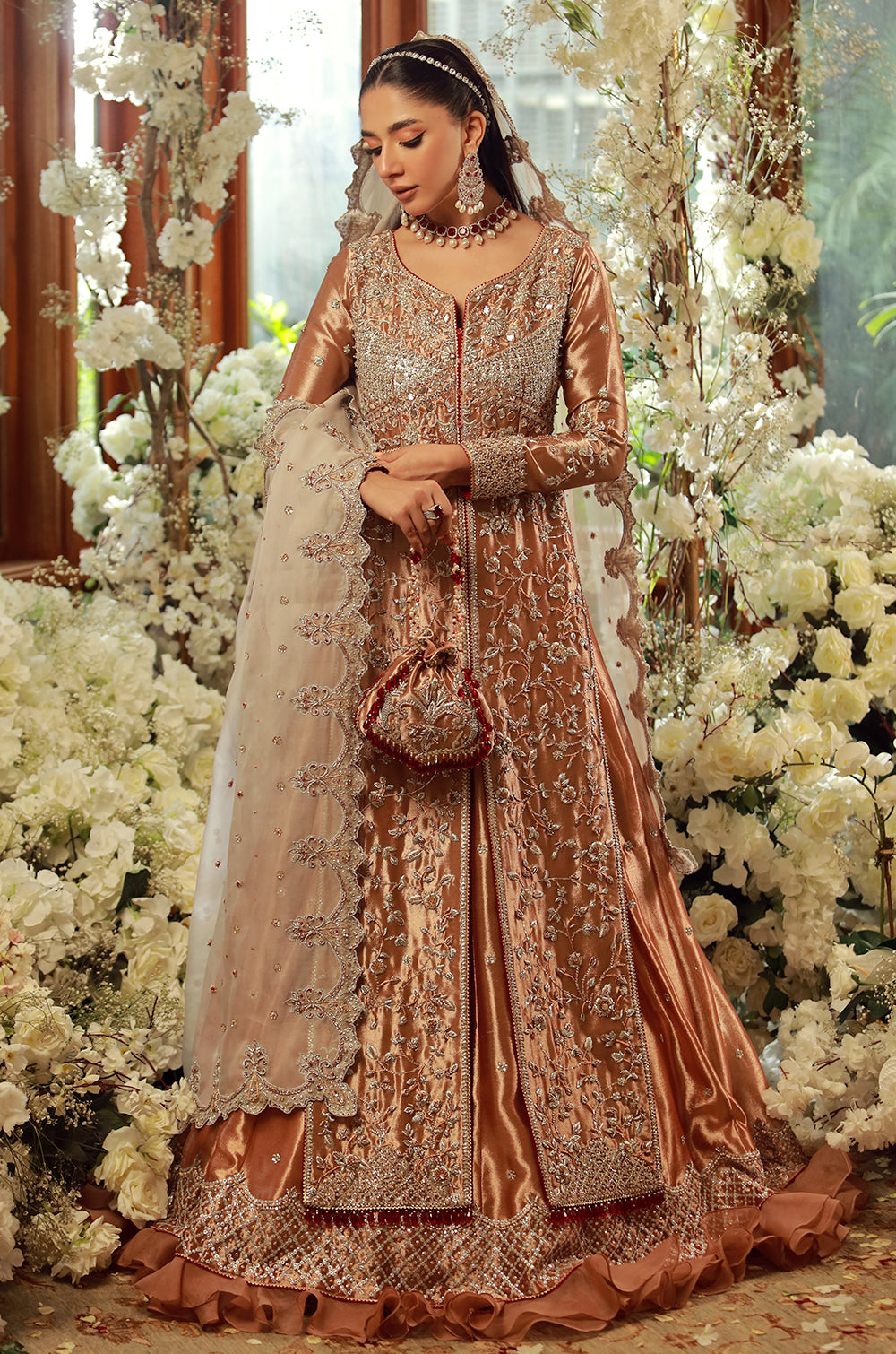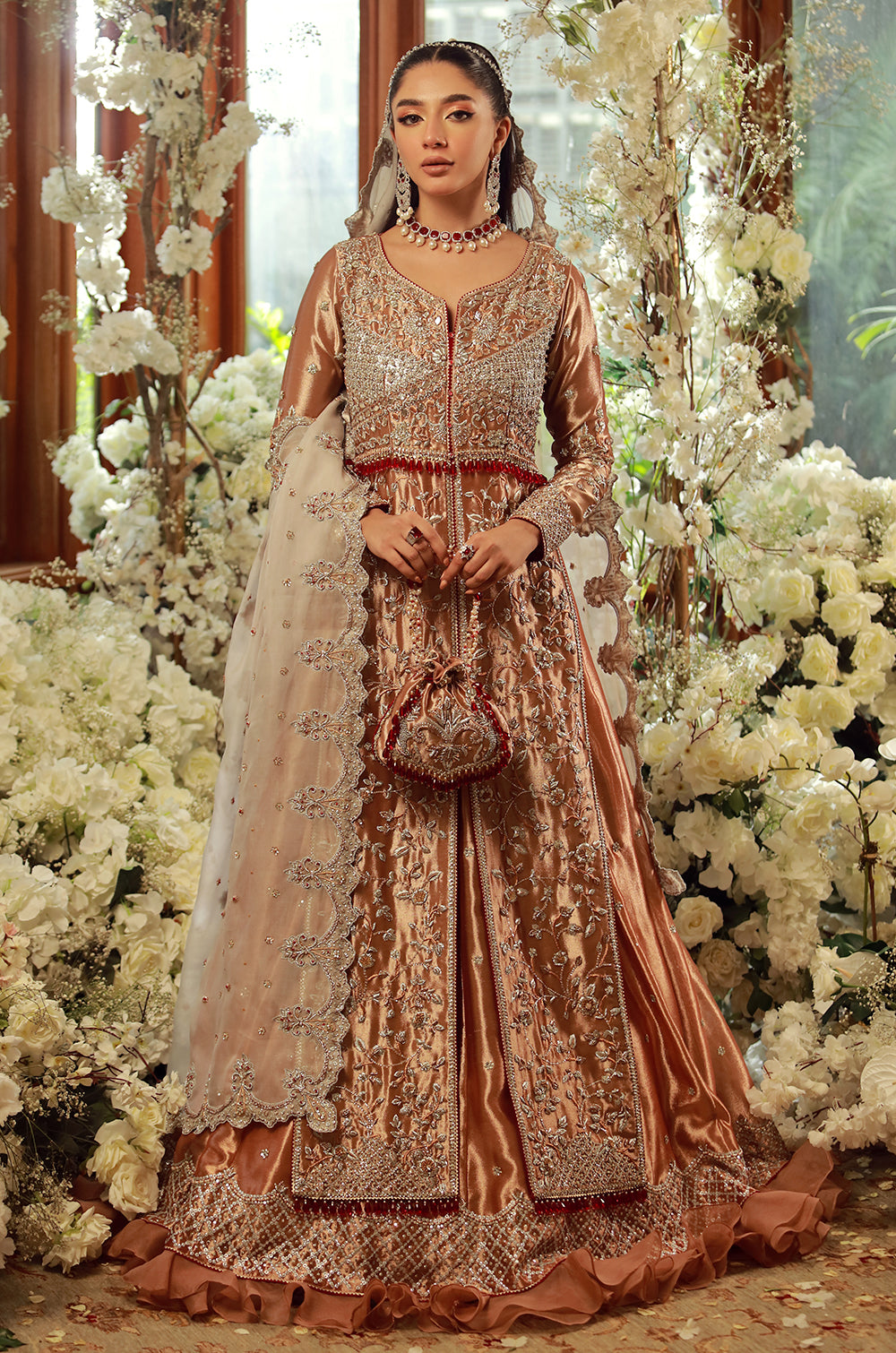 A joyous symphony of traditional crafts and modern sensibilities, the Mehermaa bridal features our signature front open cut shirt in a rich coppery hue and is hand embellished in zardozi and crystals . Comes with the option of two dupattas elegantly draped for an opulent effect. Handmade Pouch completes the look.