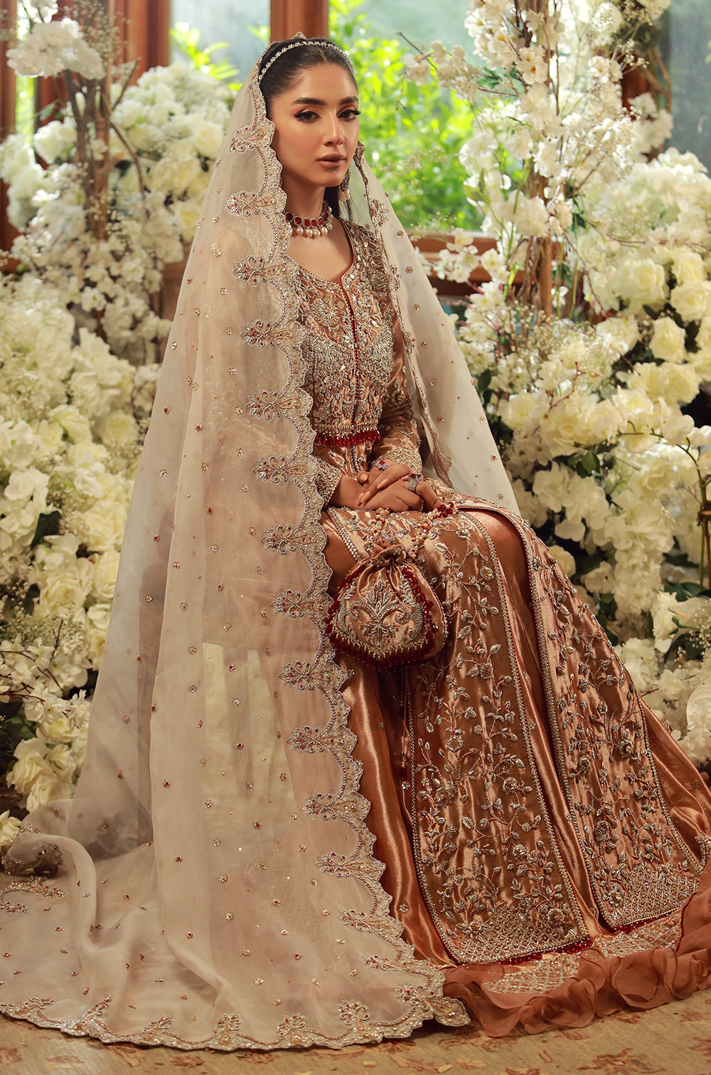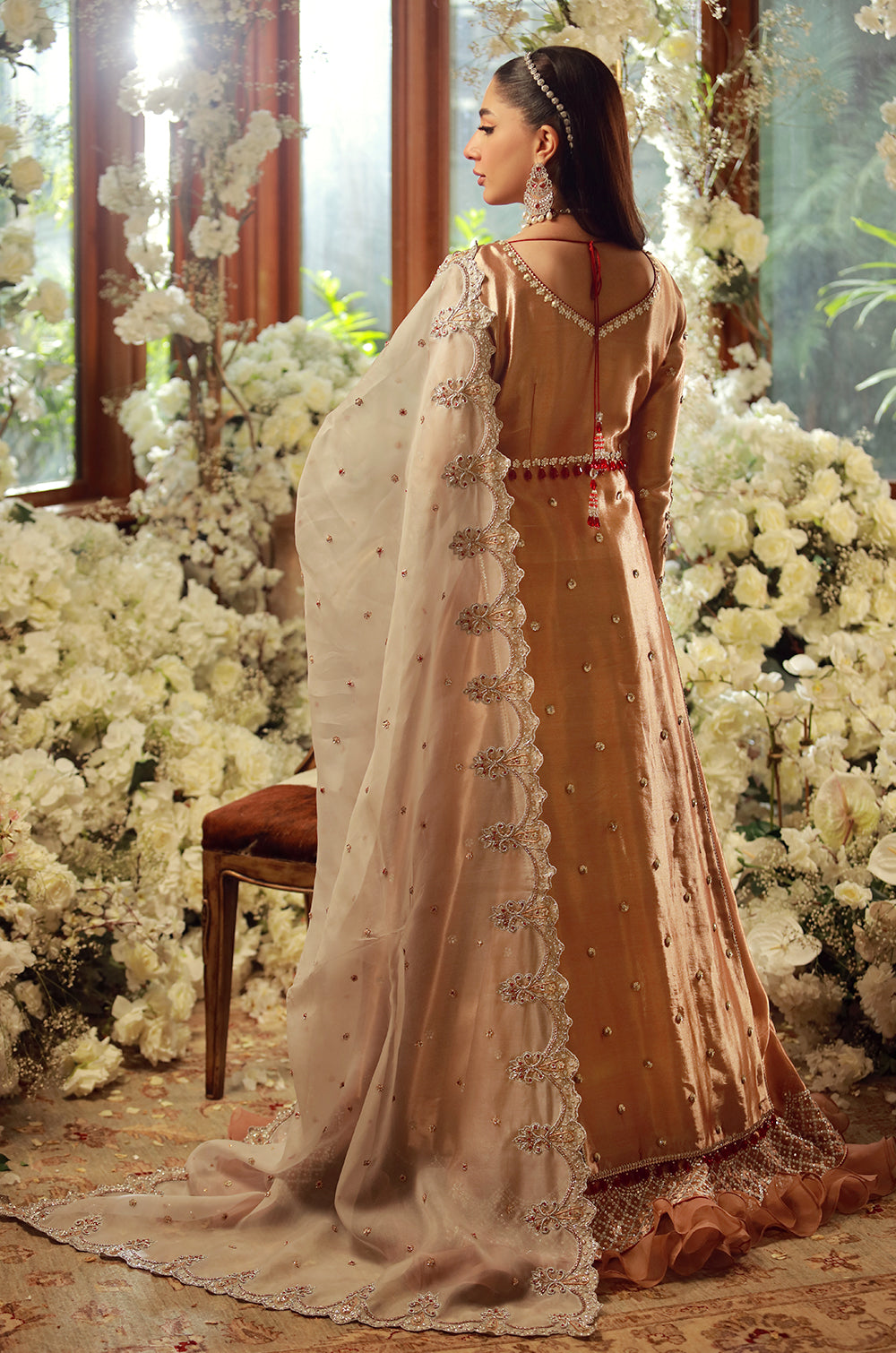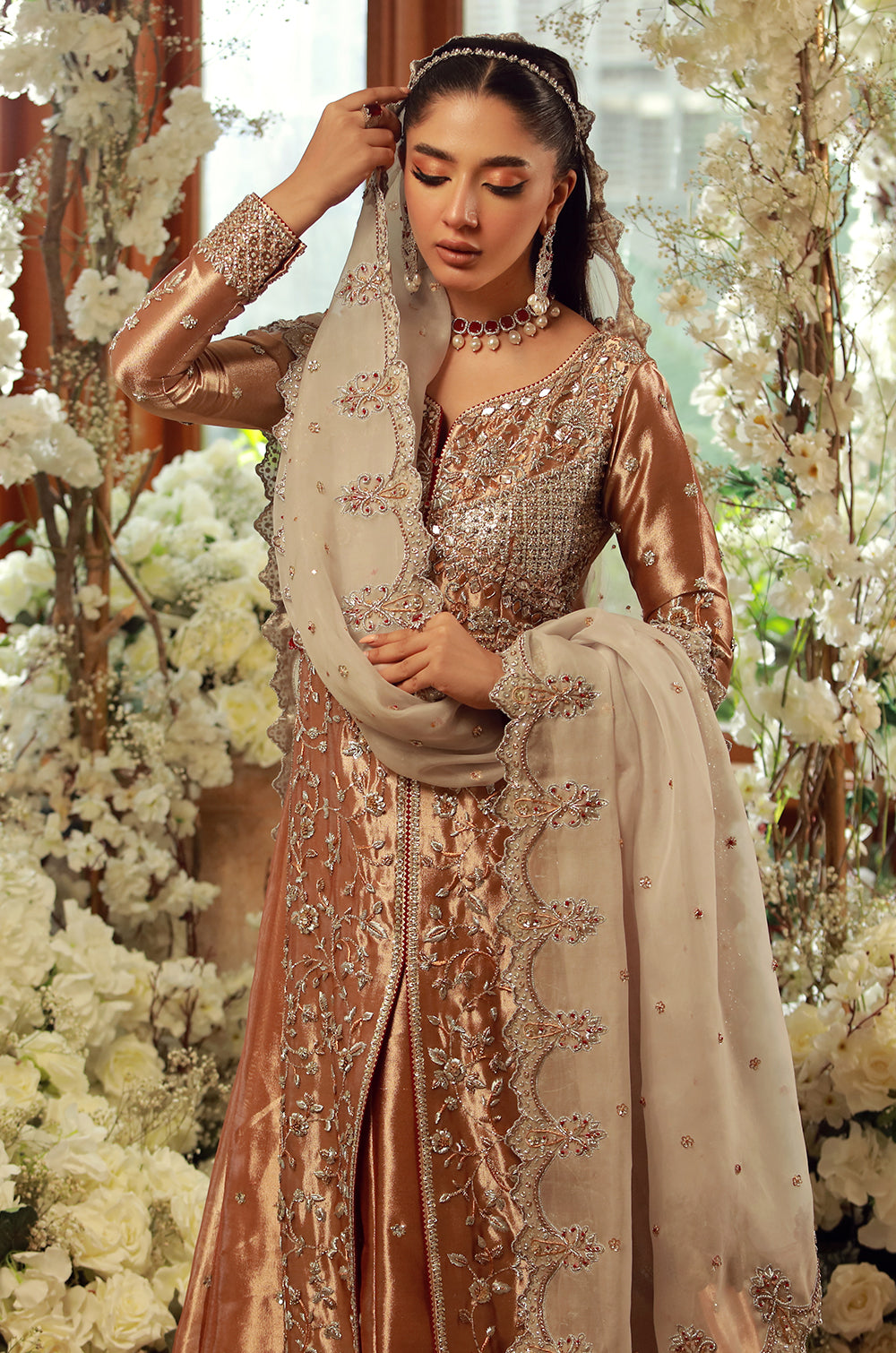 A joyous symphony of traditional crafts and modern sensibilities, the Mehermaa bridal features our signature front open cut shirt in a rich coppery hue and is hand embellished in zardozi and crystals . Comes with the option of two dupattas elegantly draped for an opulent effect. Handmade Pouch completes the look.