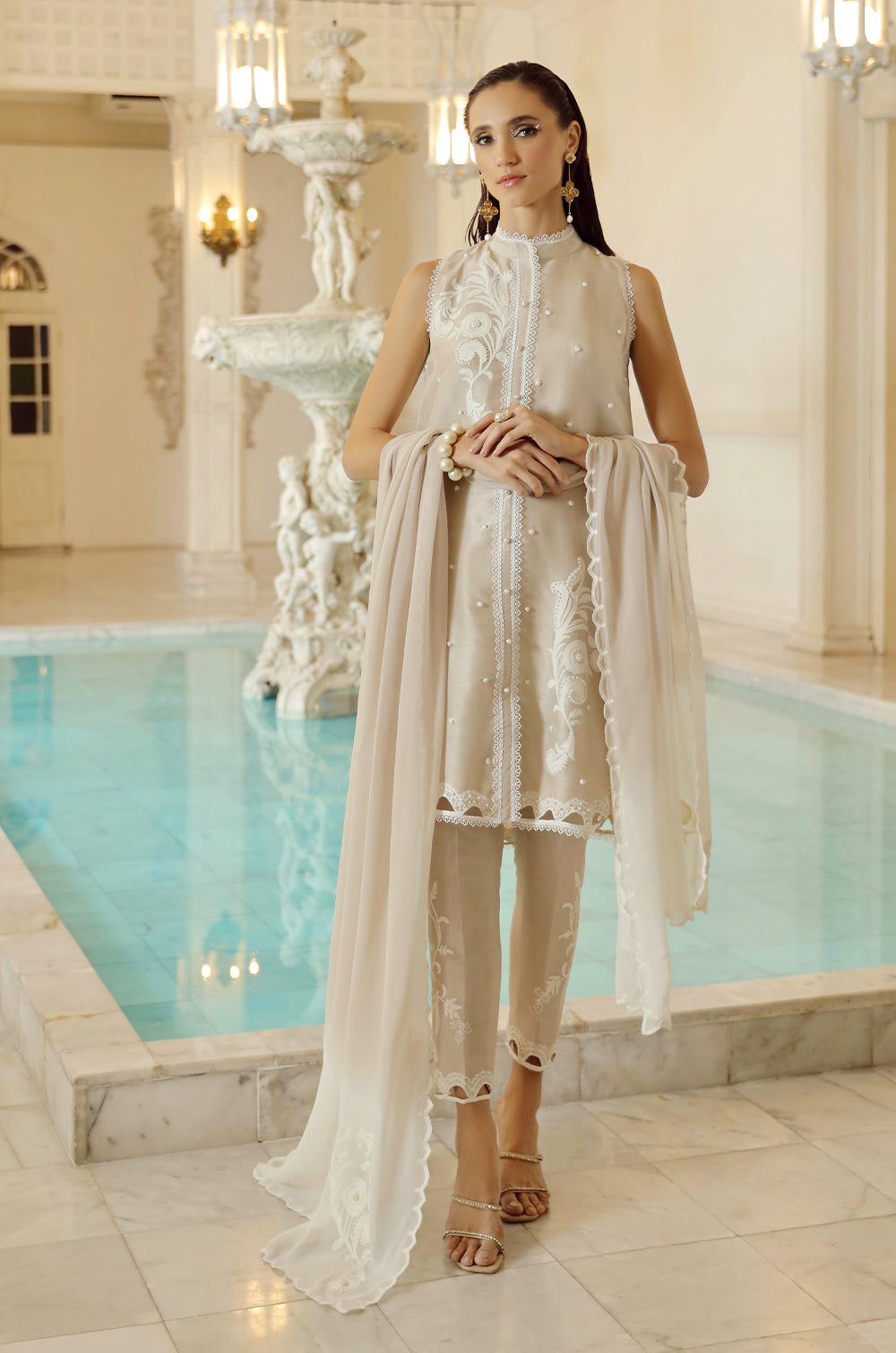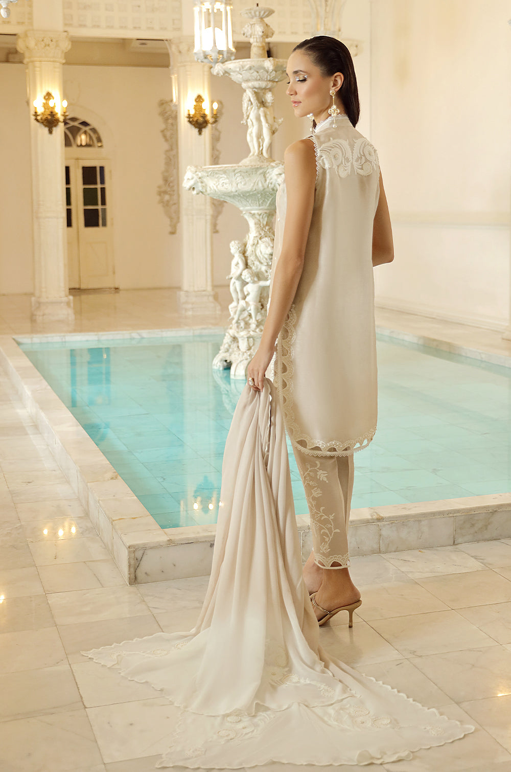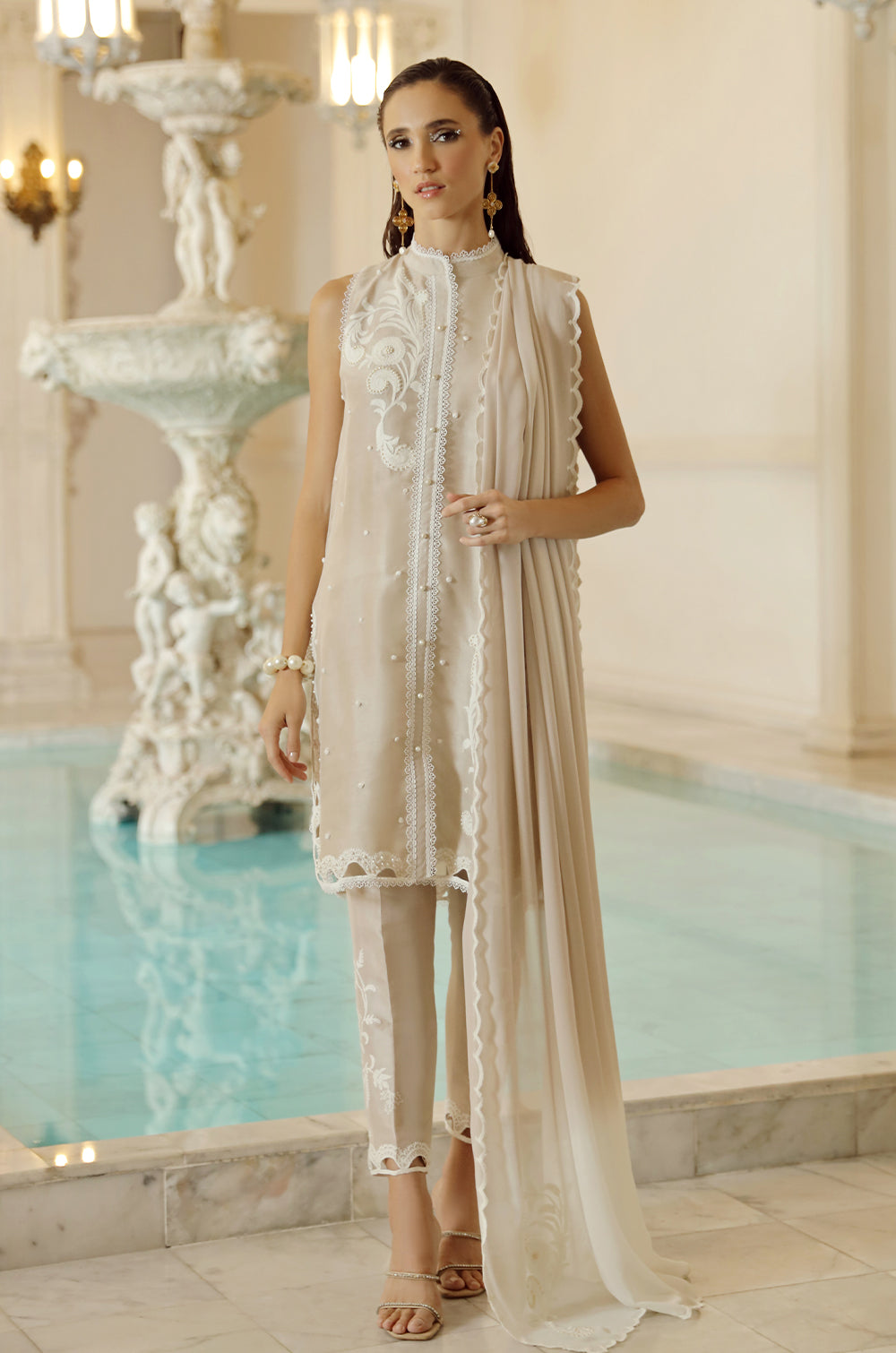 A beige tone rawsilk front open, round daman shirt with laces and pearl embellishments along with white embroidery in the front and back panels. Paired with rawsilk straight pants with thread and pearl work and a chiffon dupatta with motifs and scallops.