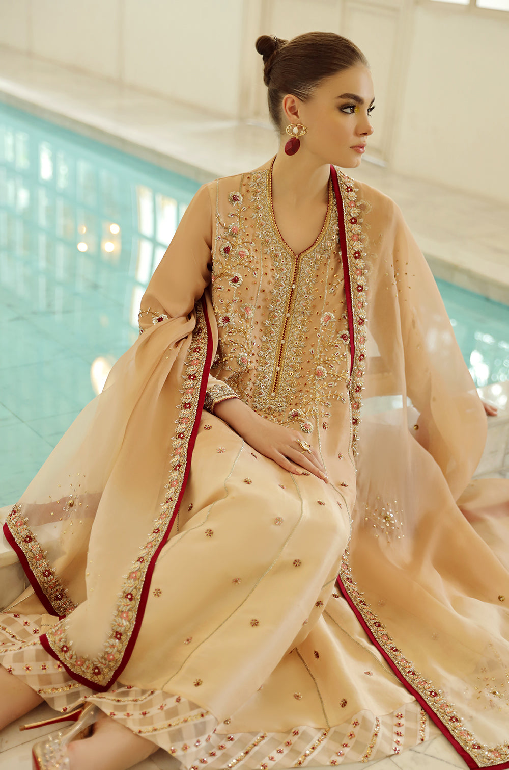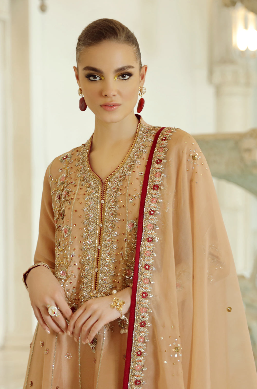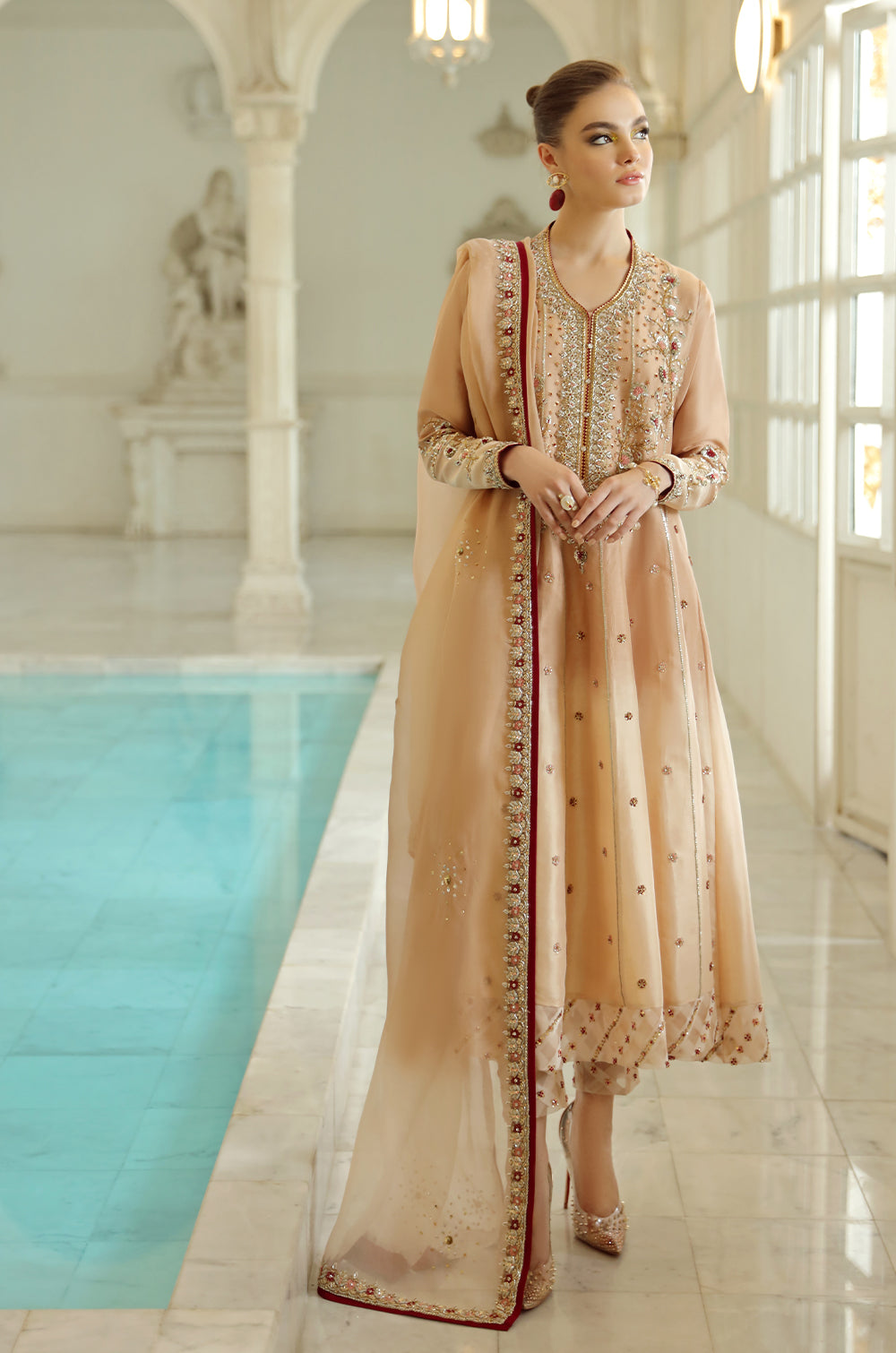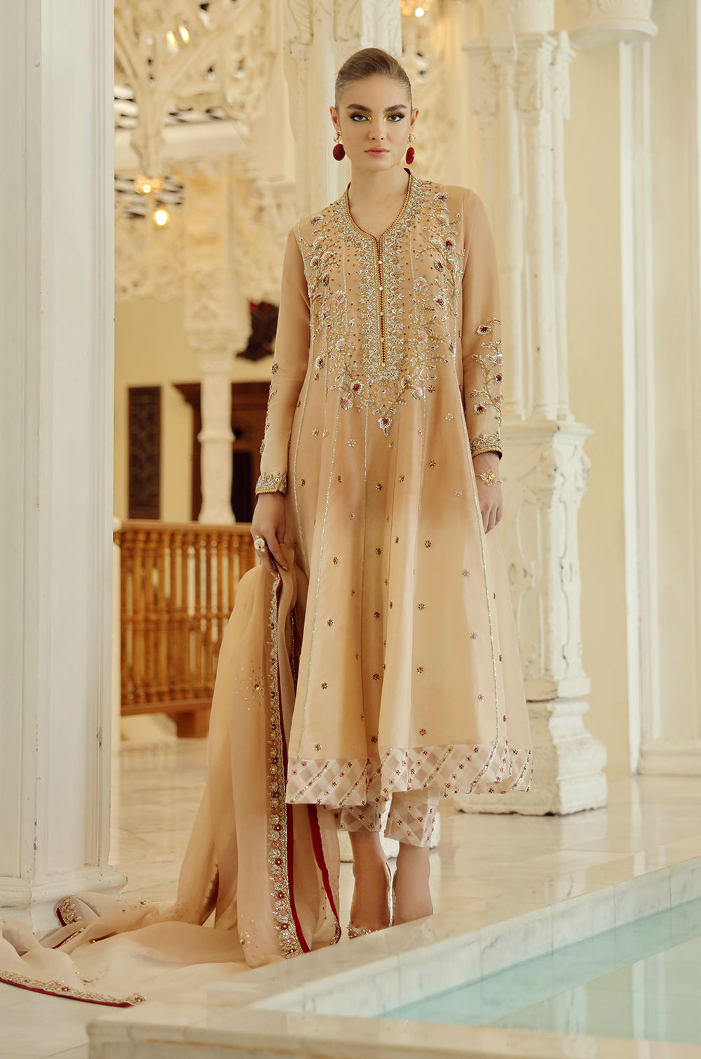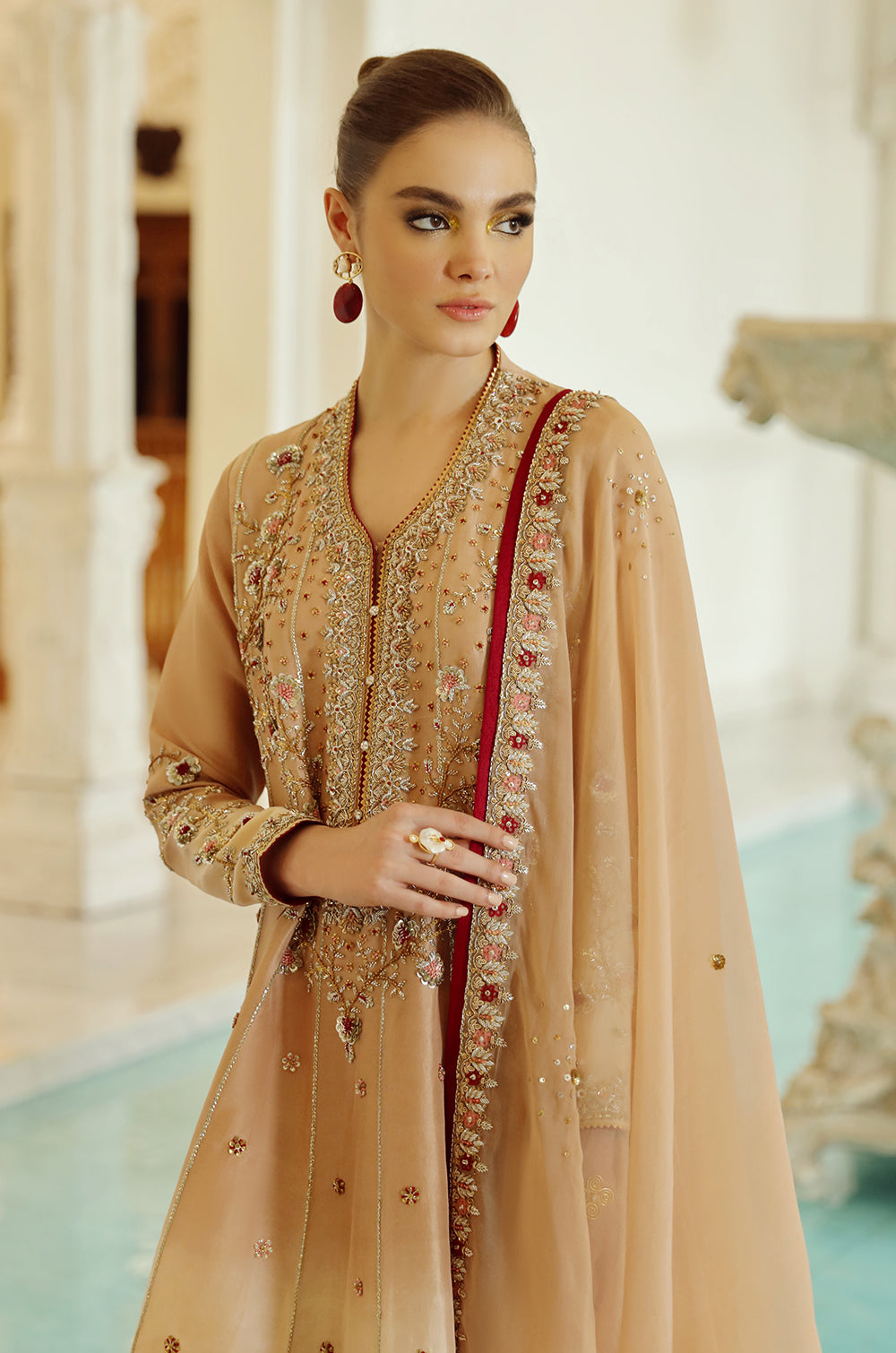 A classic ombre kalidaar with handworked intricate neckline and zardozi bootis all over it. Paired with rawsilk pants with fabric manipulated finishing. Accented with a pure organza duppata with four sided borders and bootis scattered all over.