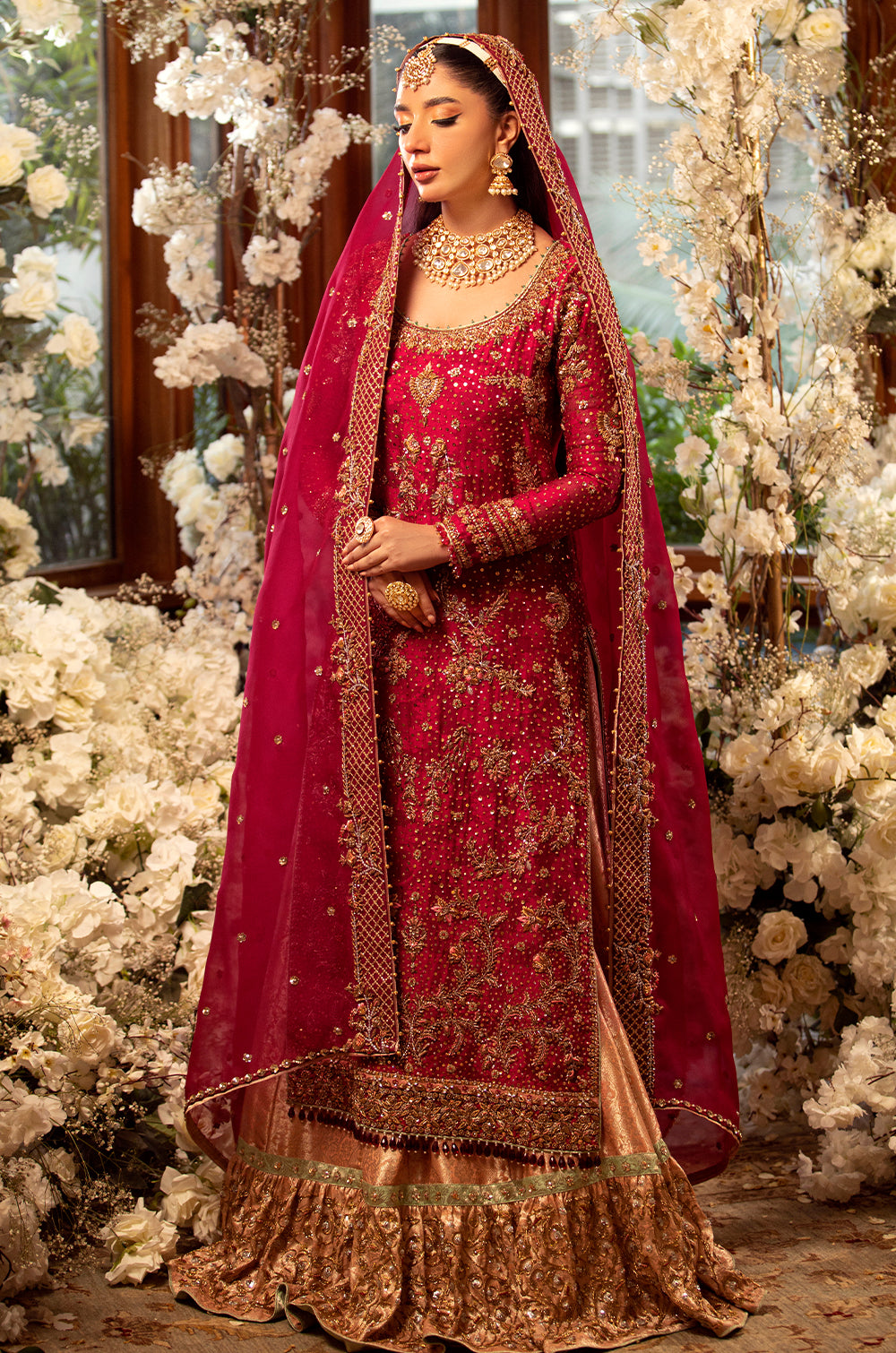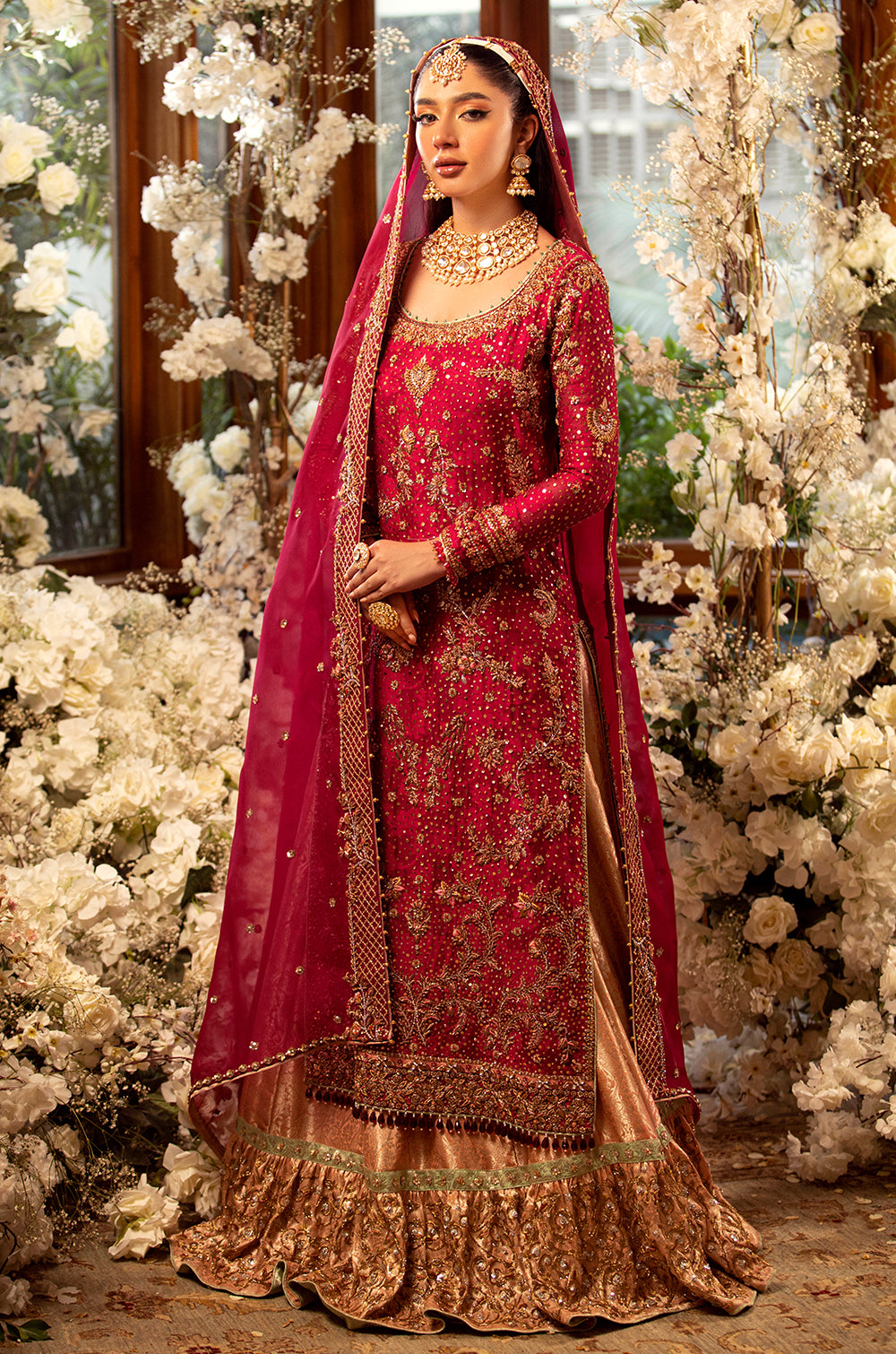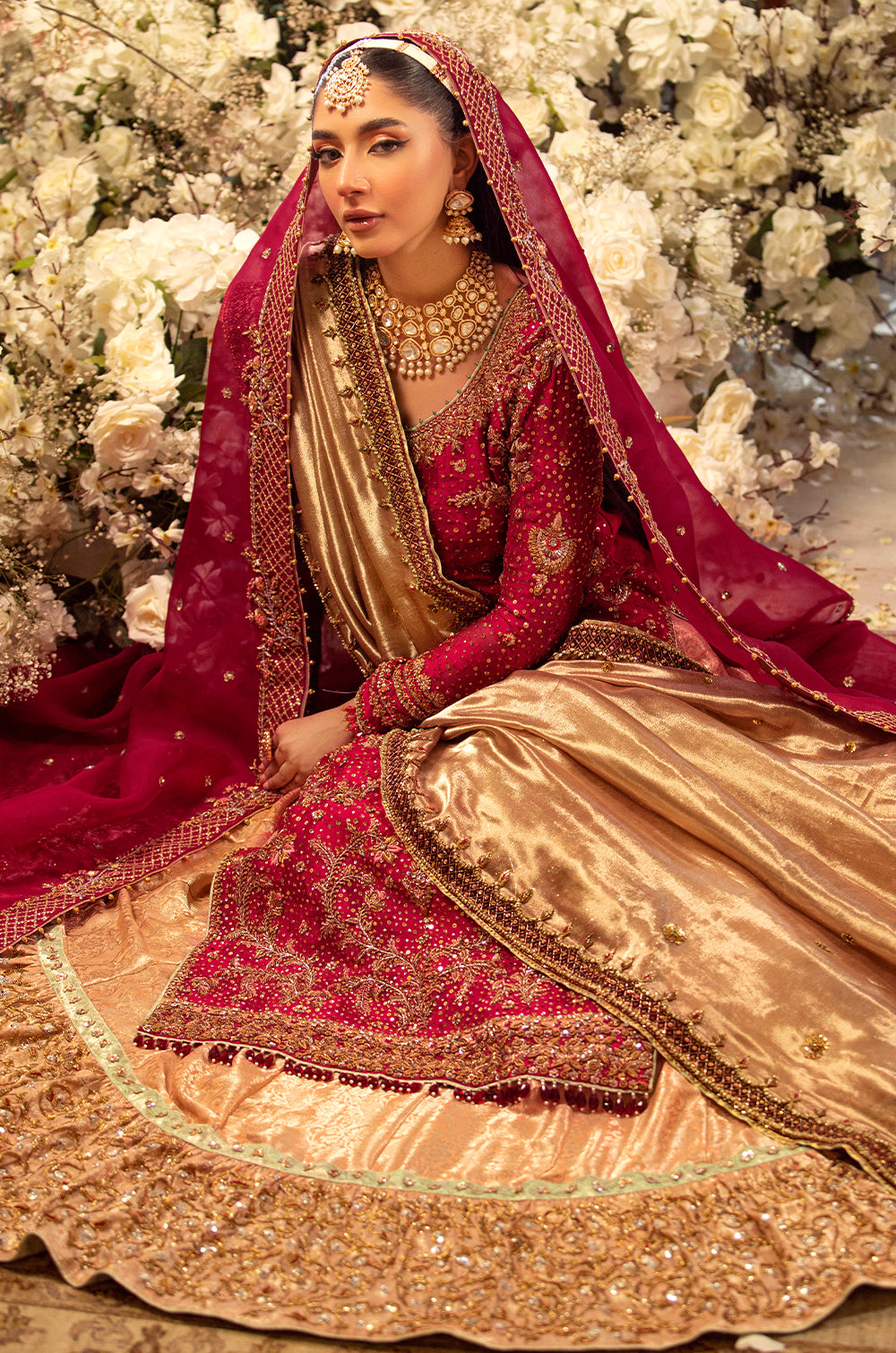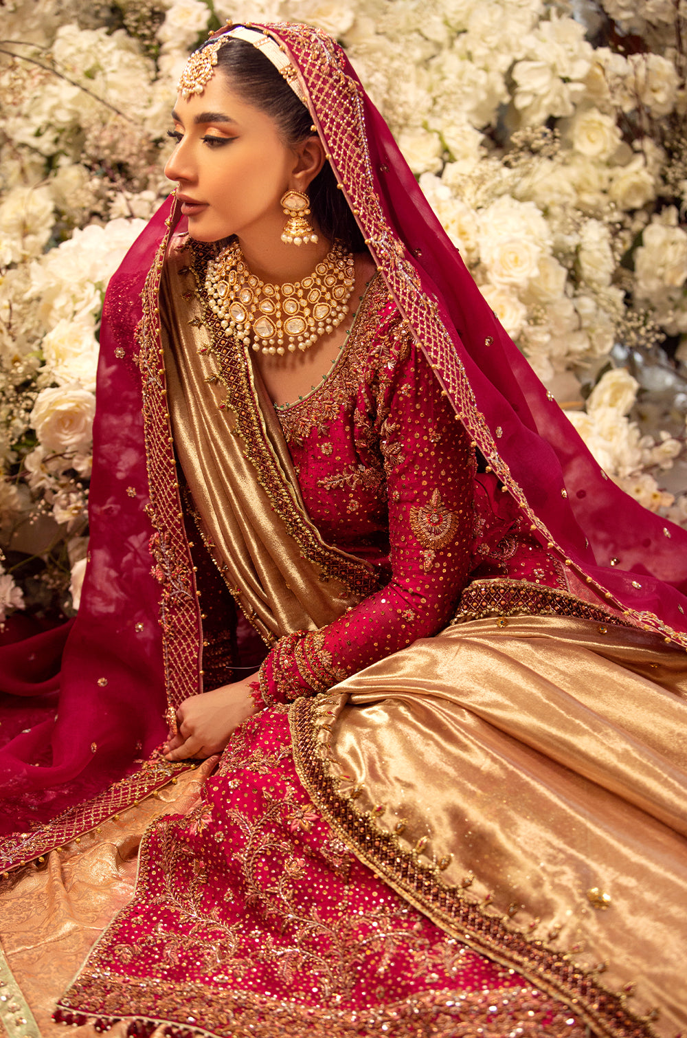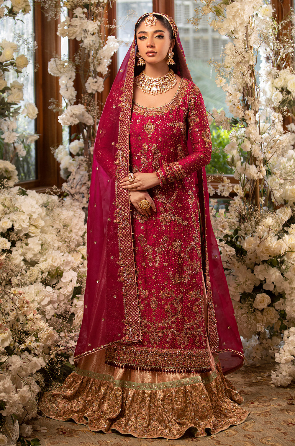 A quintessential bridal ensemble for the bride who wants a classic heritage look for her big day. A fuschia pink...