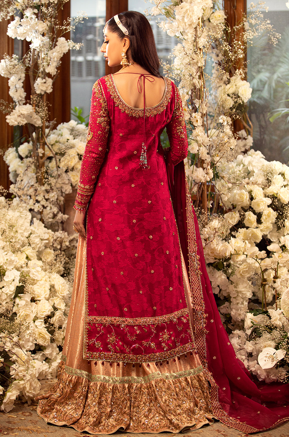 A quintessential bridal ensemble for the bride who wants a classic heritage look for her big day. A fuschia pink long shirt embellished in age old zardozi techniques and enhanced with French knots, is paired with a contrasting peach hued farshi lengha. The lengha flaunts a richly hand worked border. A matching fuschia dupatta completes the look. The outfit can also be paired with a second dupatta draped on the side for an even more opulent look.