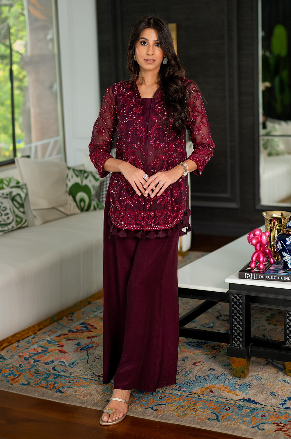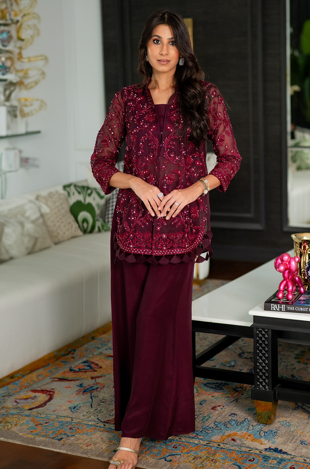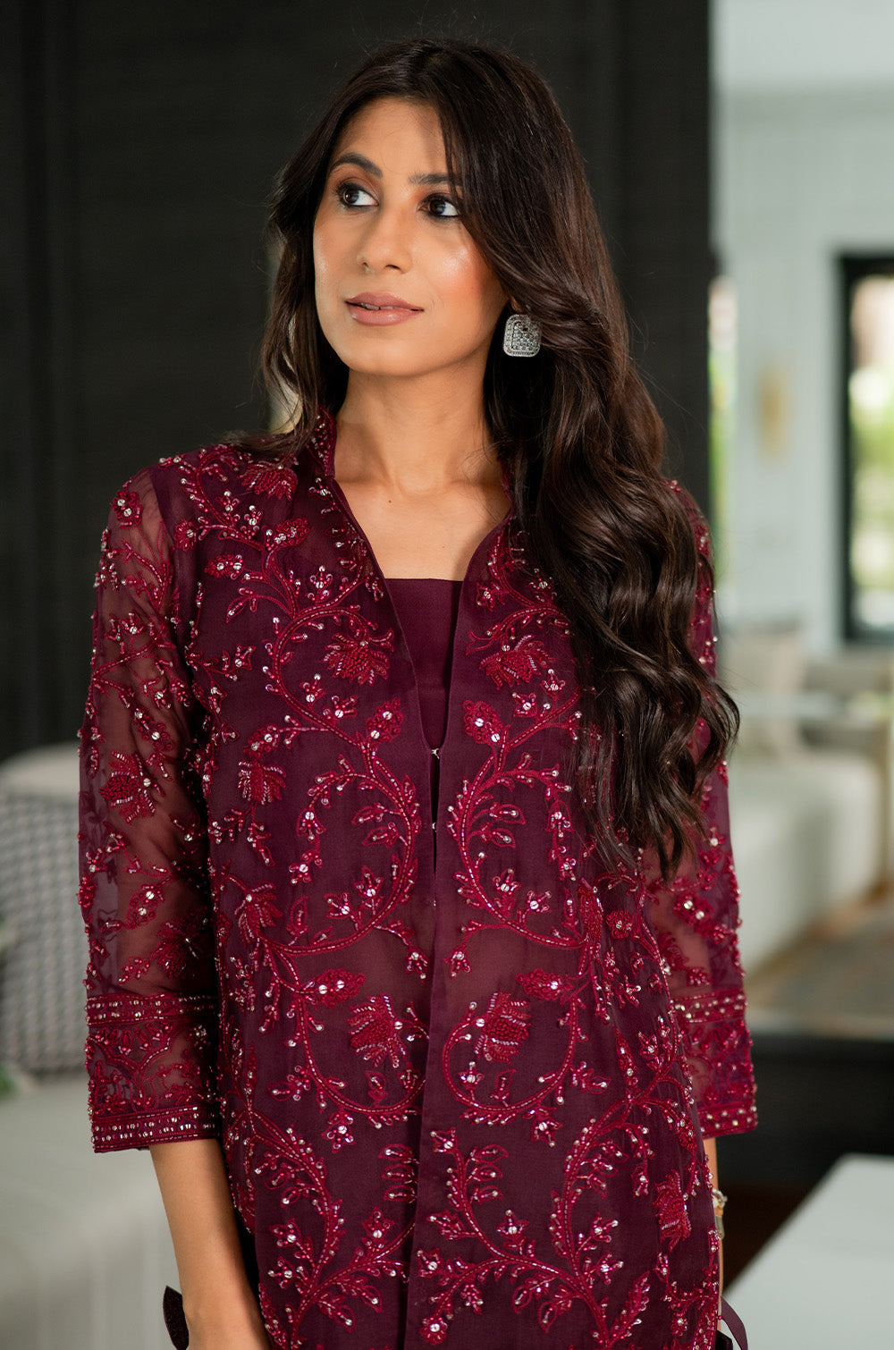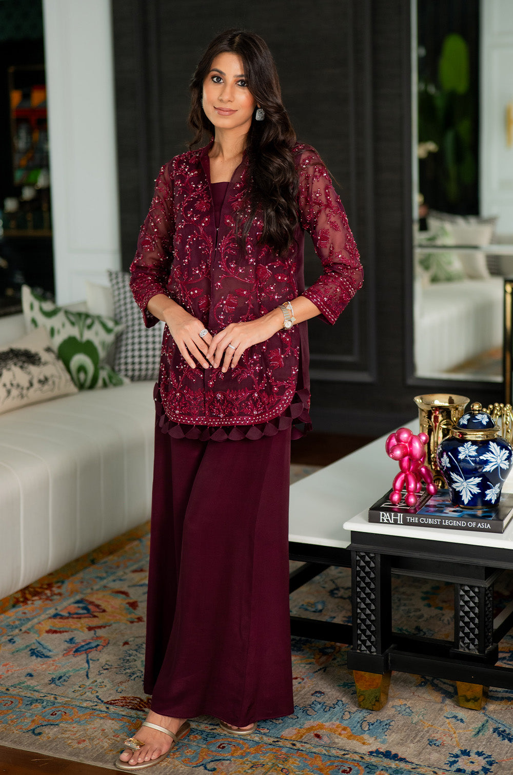 A captivating fusion of sophistication. Beautiful pure organza short jacket in maroon color with intricate aari and hand work all over in shades of red. Paired with bodice on pure crepe silk and flared pants.