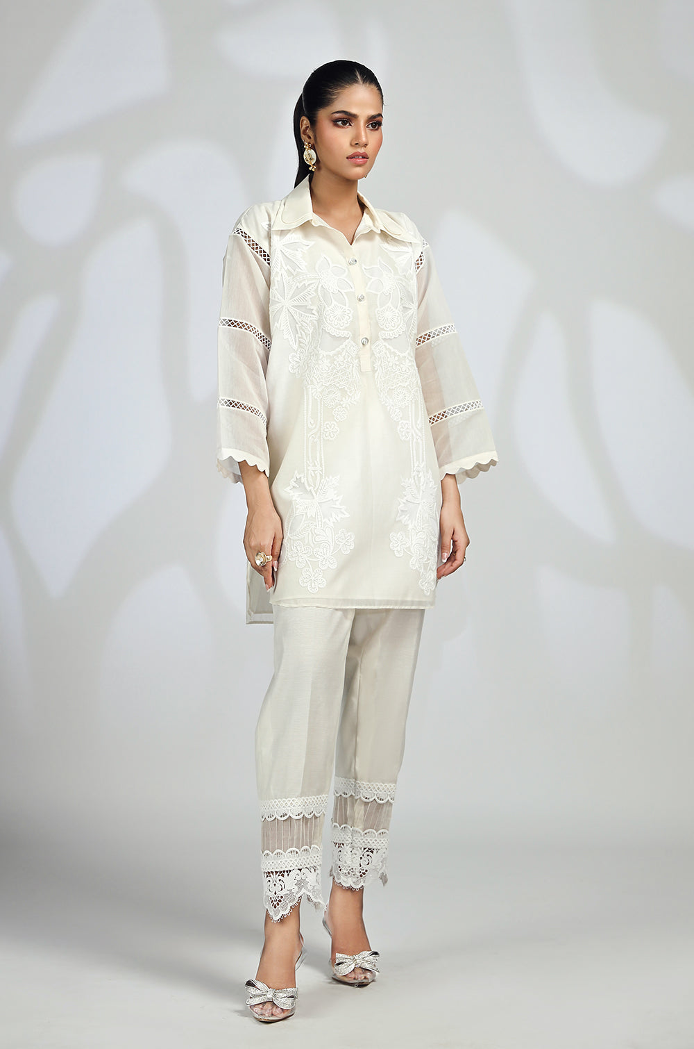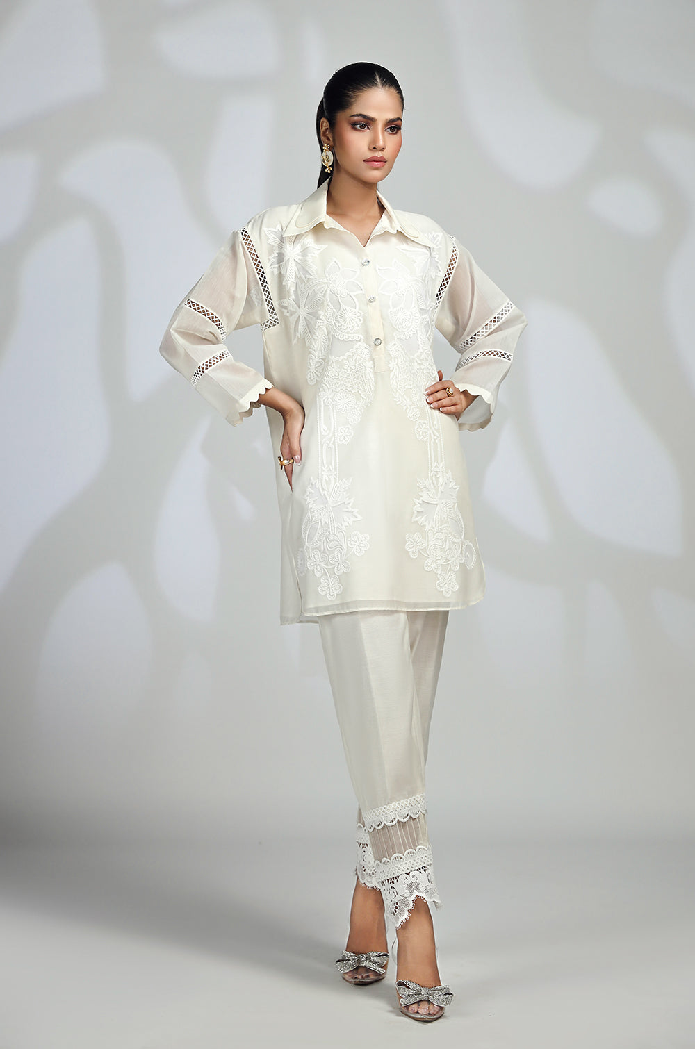 A shirt adorned with embroidery and appliqué accents neckline and round daman with lace details in sleeves. Paired with straight...