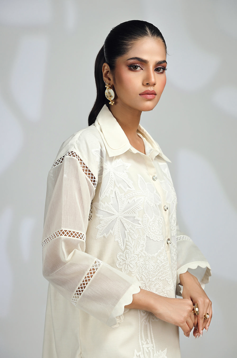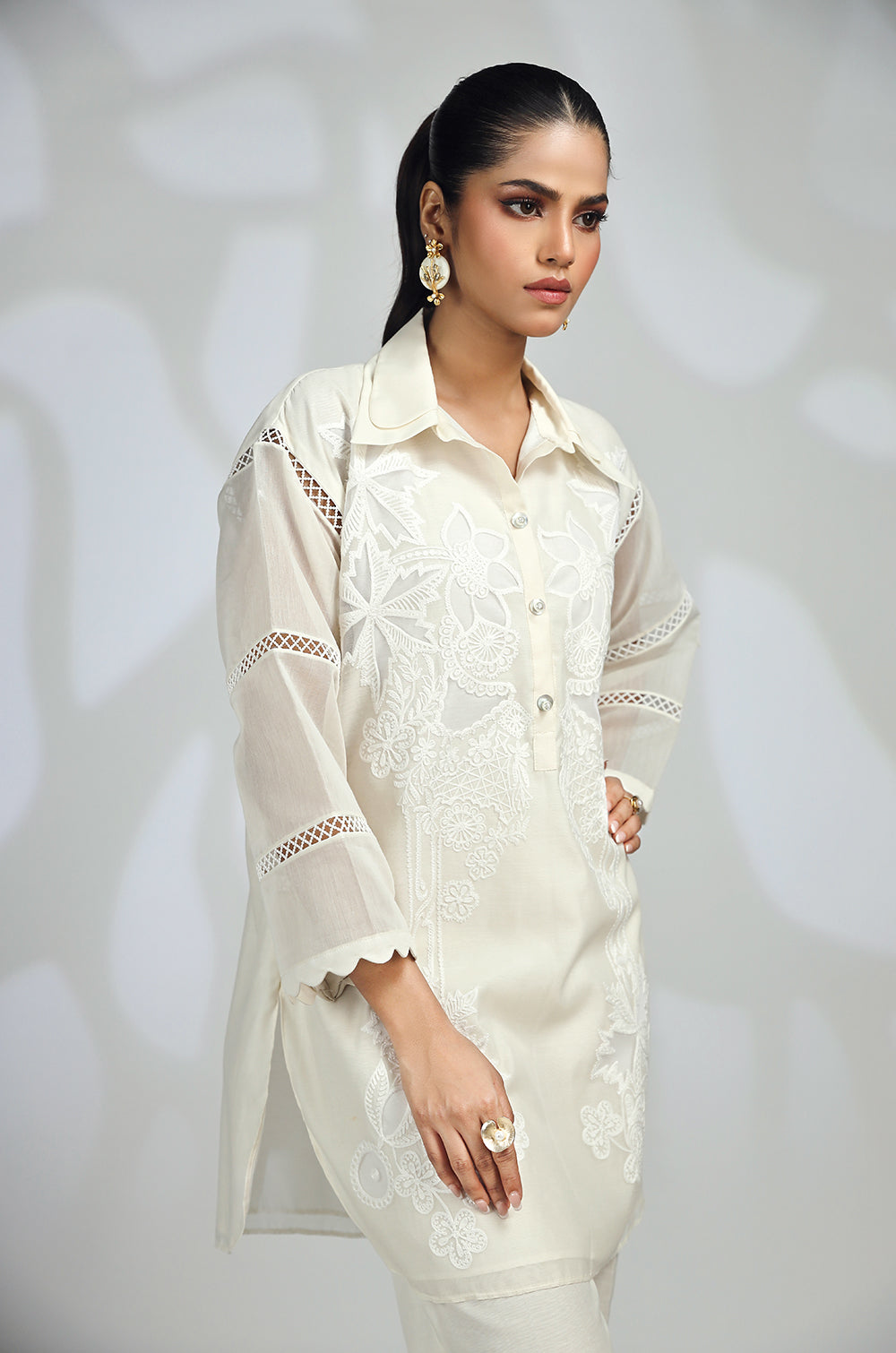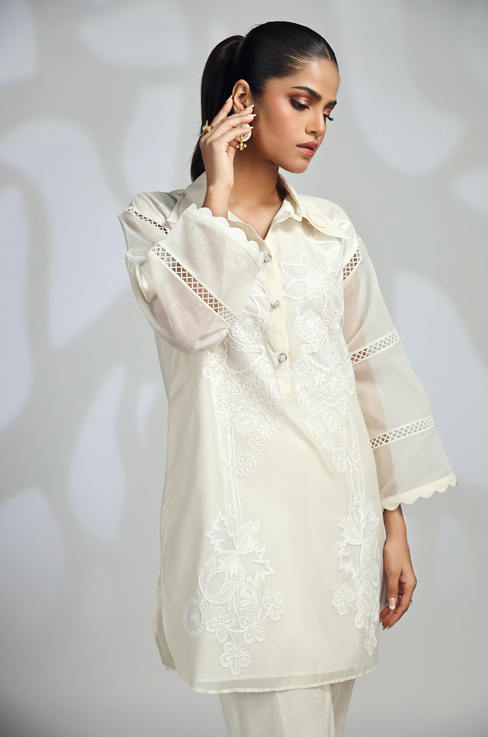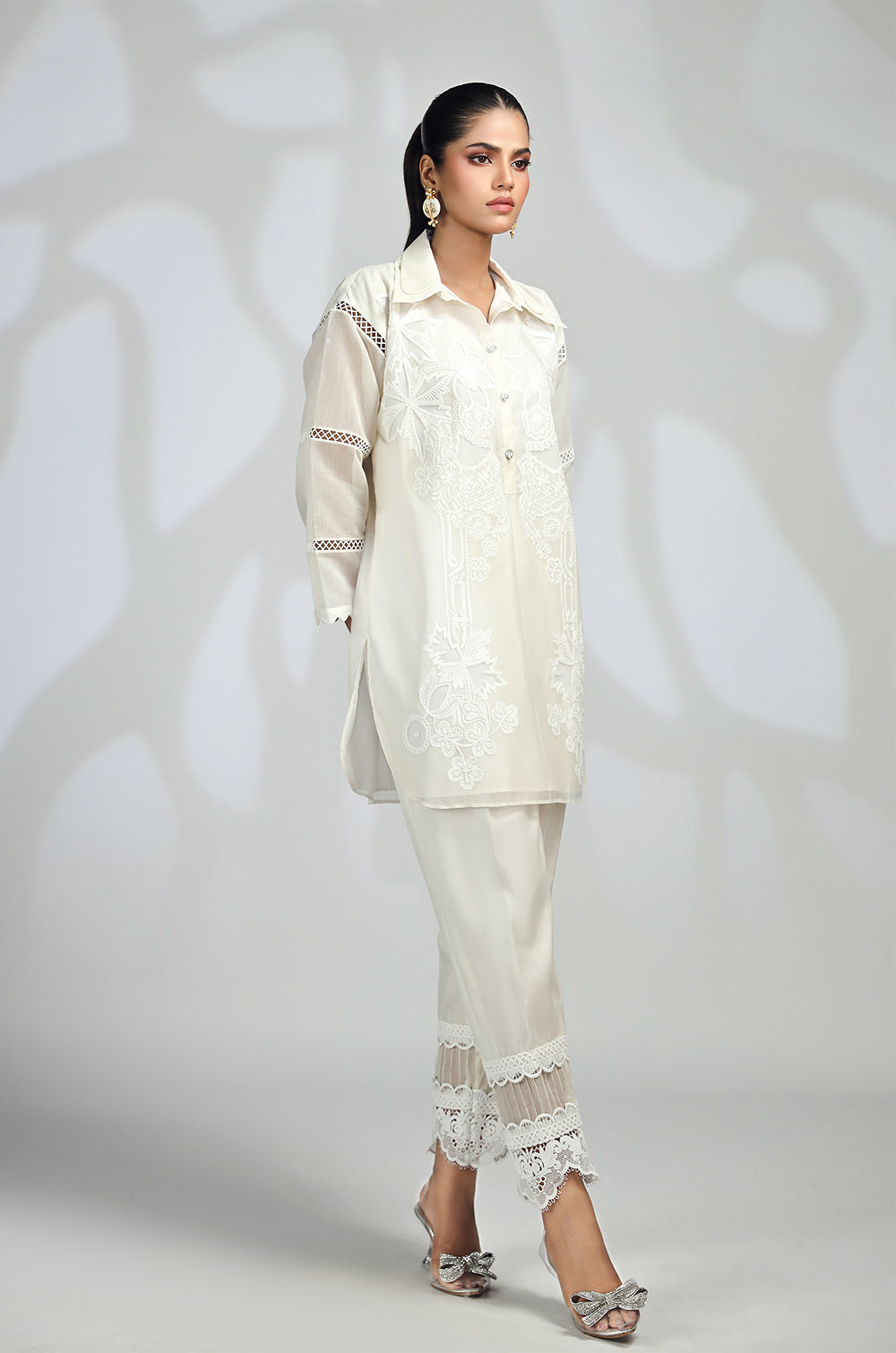 A shirt adorned with embroidery and appliqué accents neckline and round daman with lace details in sleeves. Paired with straight pants or tulip shalwar.