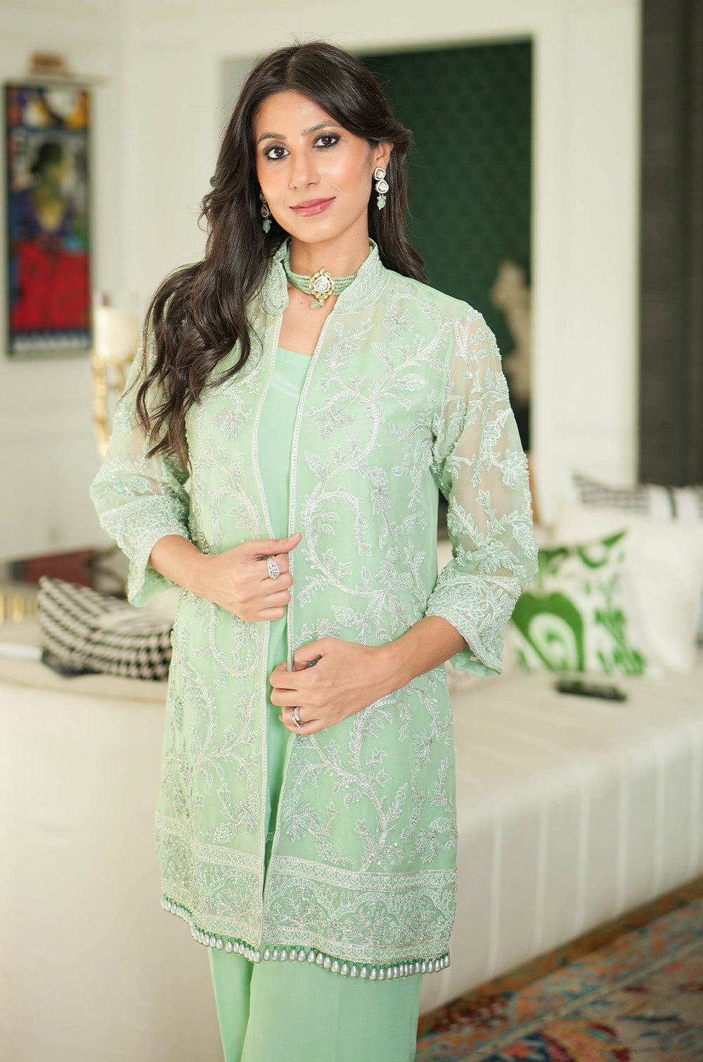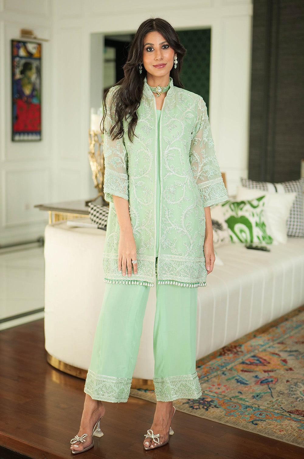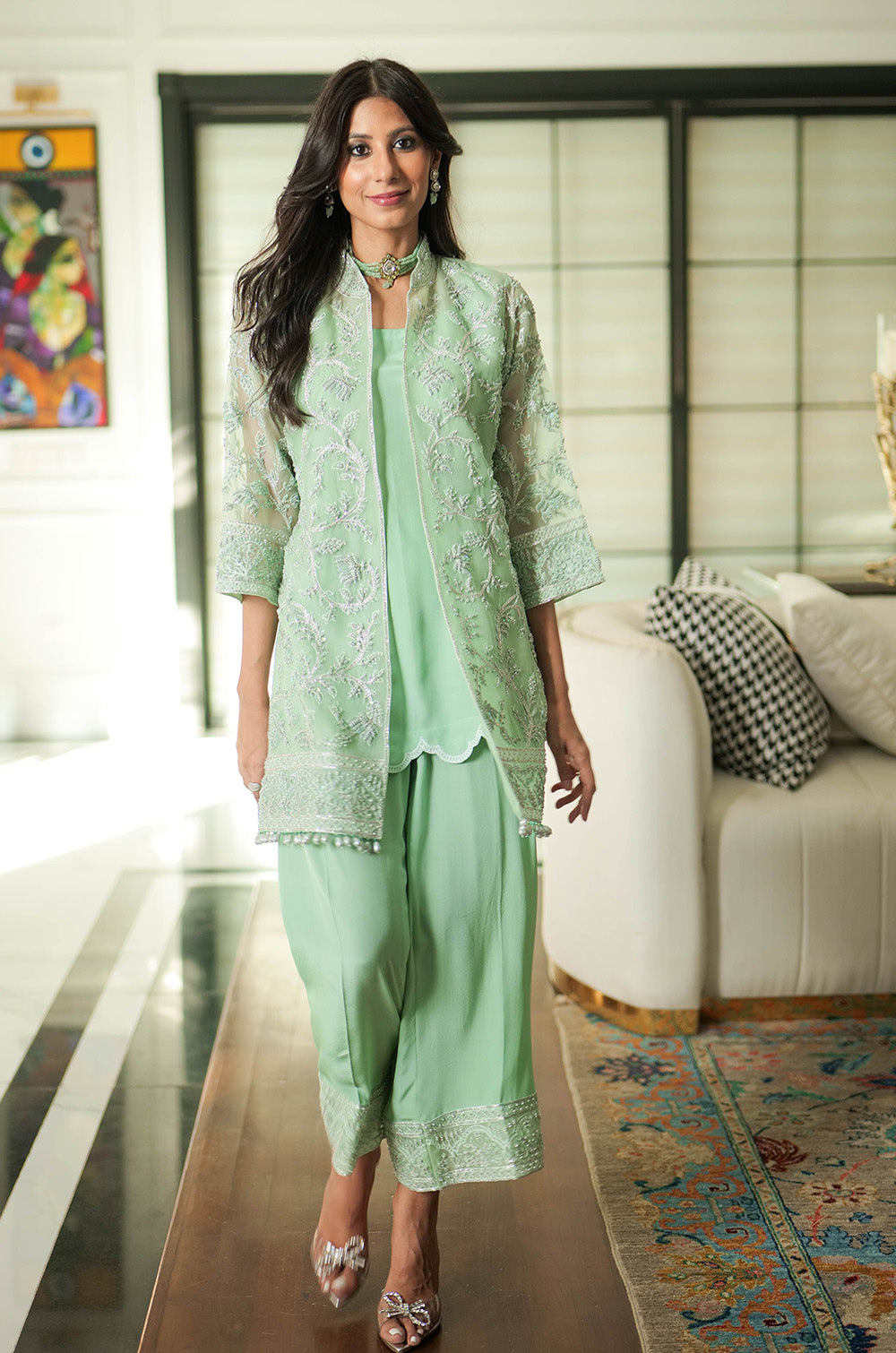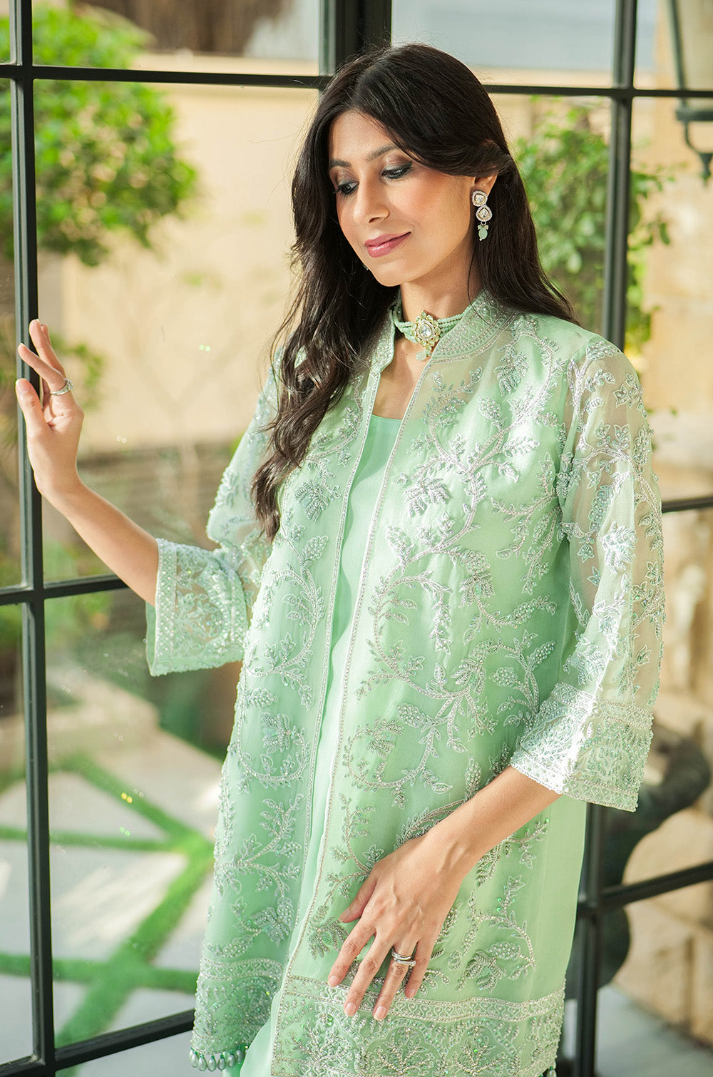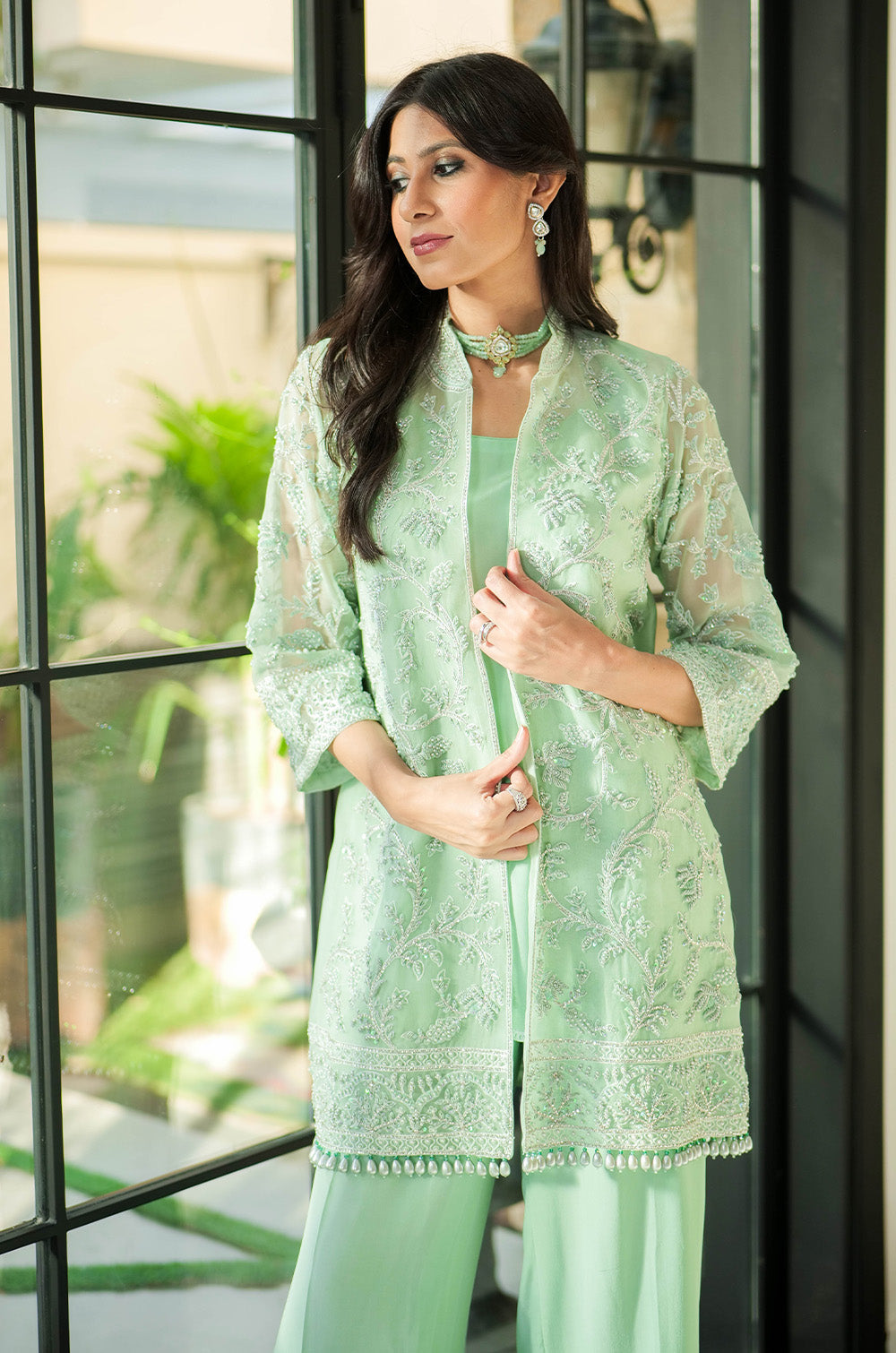 A mint organza jacket delicately rendered with threadwork and embellishment. The look is completed with crepe silk slip having scallop details in hem and cullotes with embroidered border.