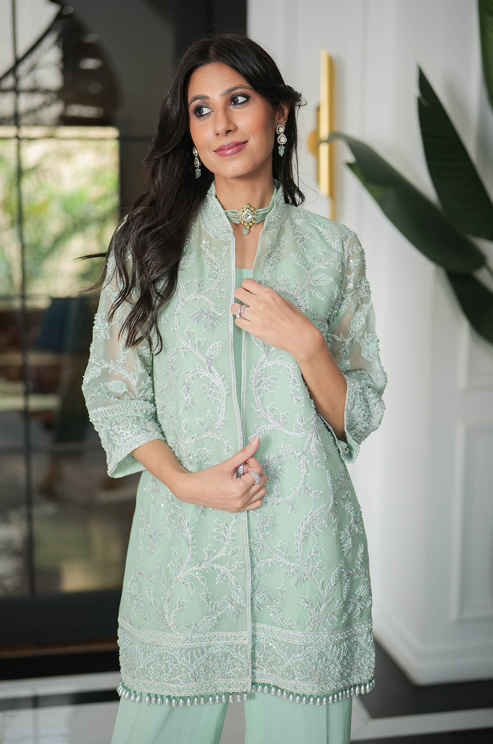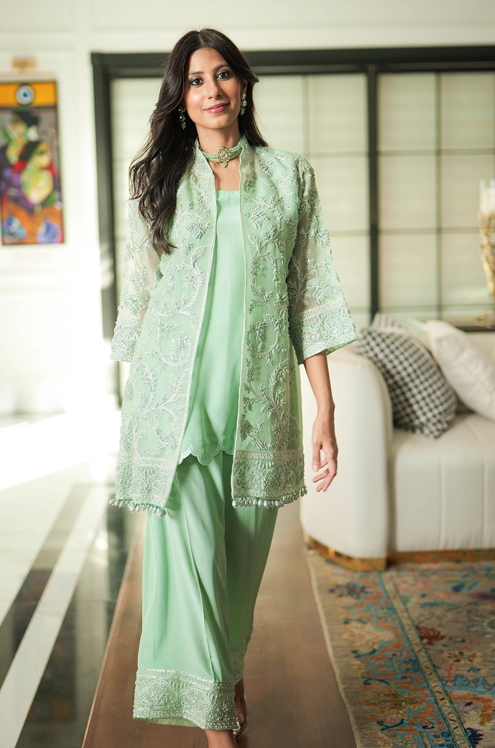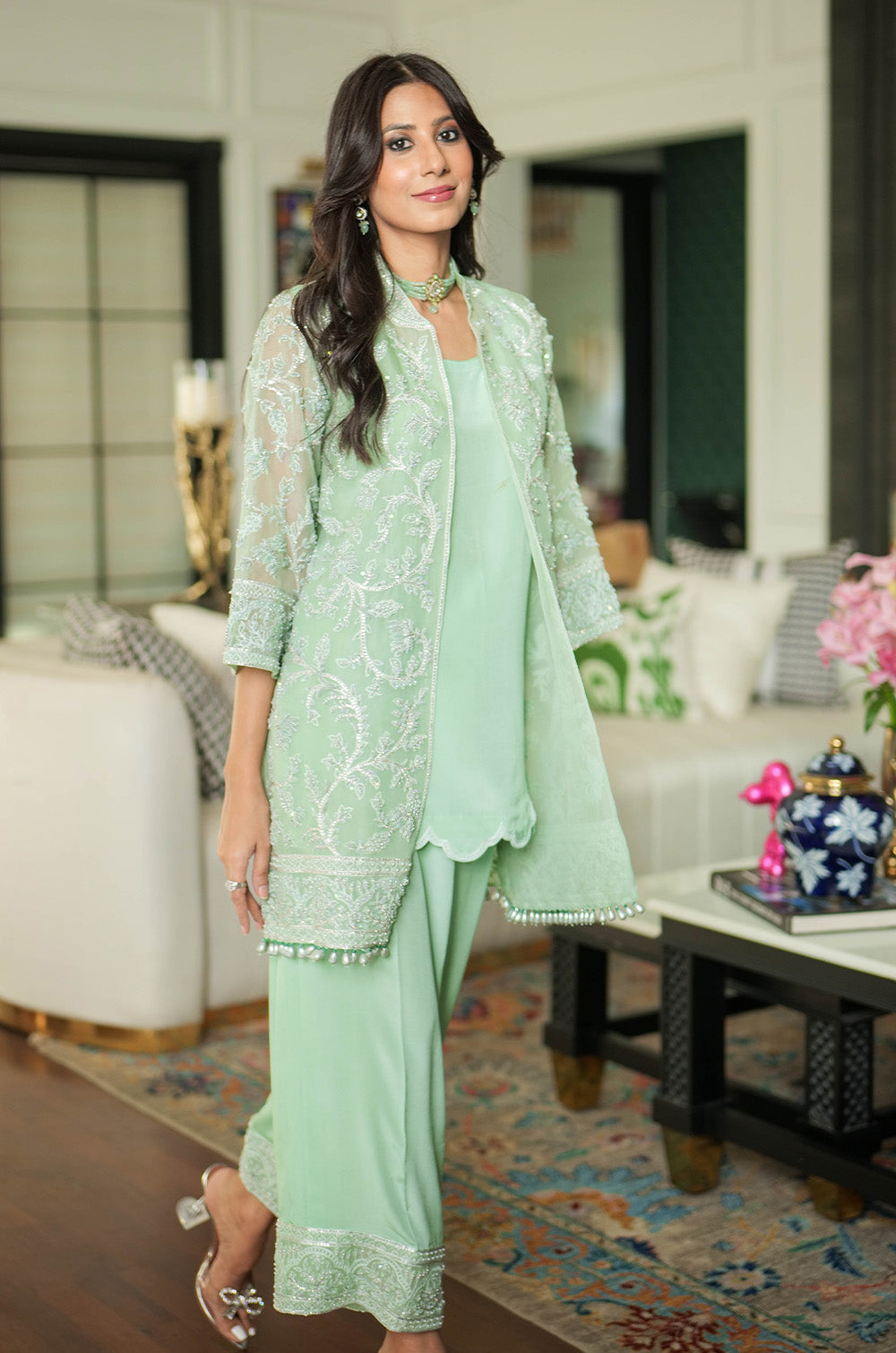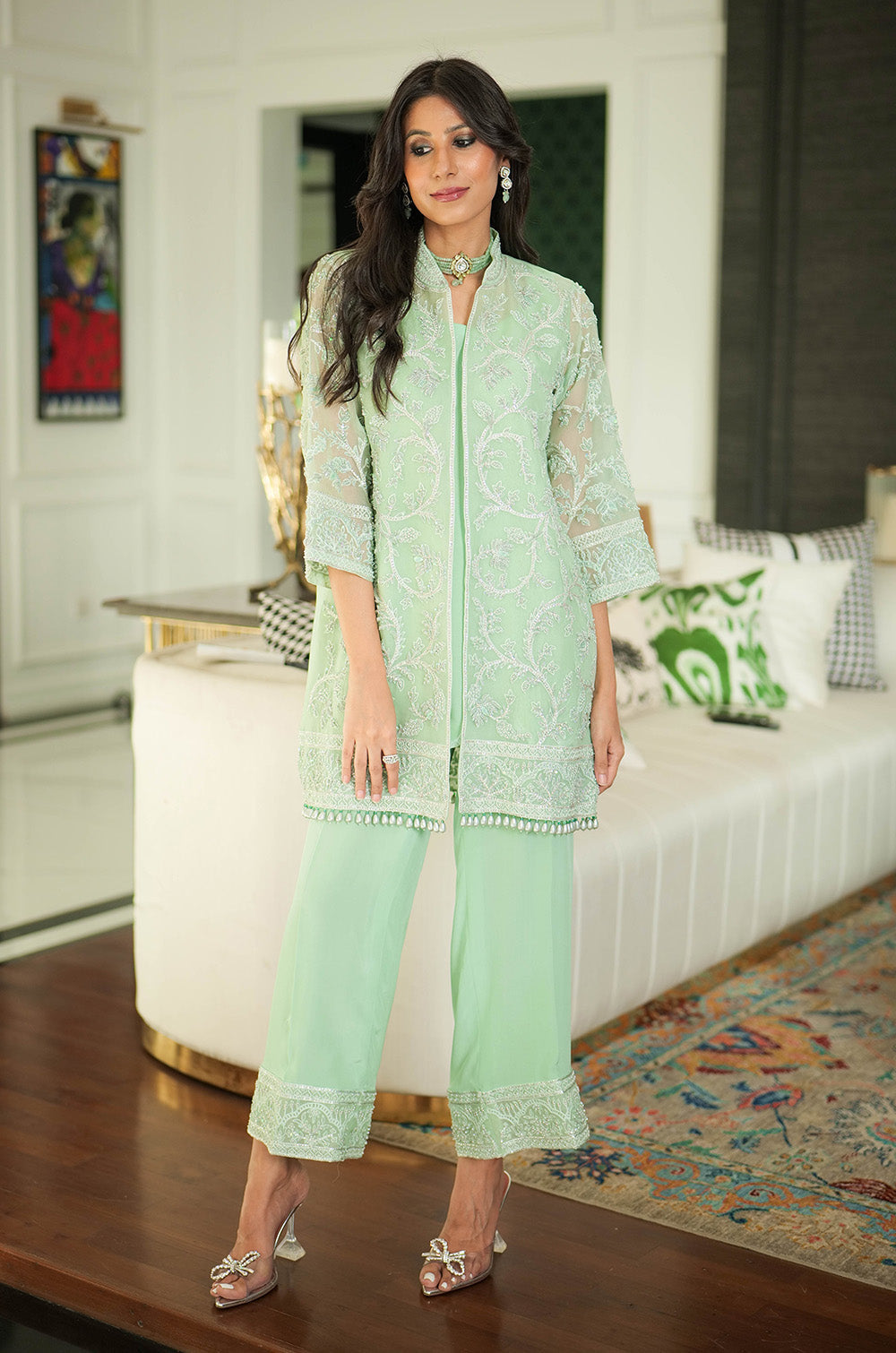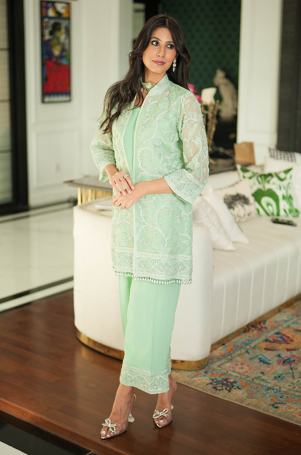 A mint organza jacket delicately rendered with threadwork and embellishment. The look is completed with crepe silk slip having scallop details in hem and cullotes with embroidered border.