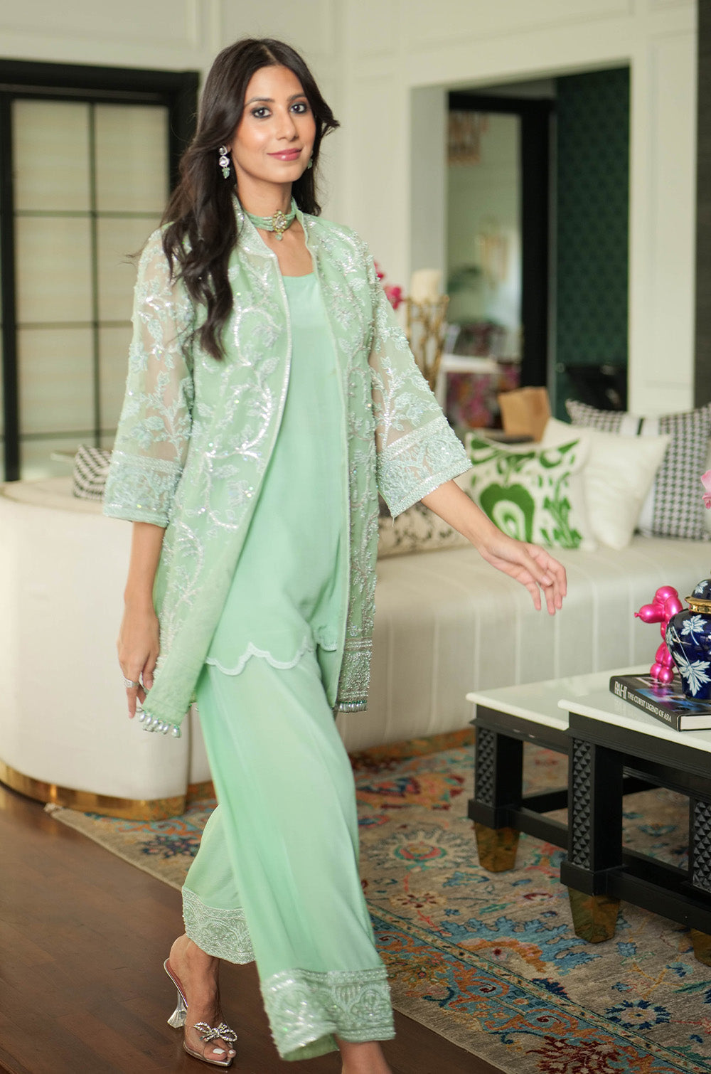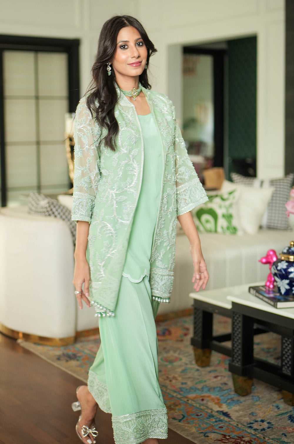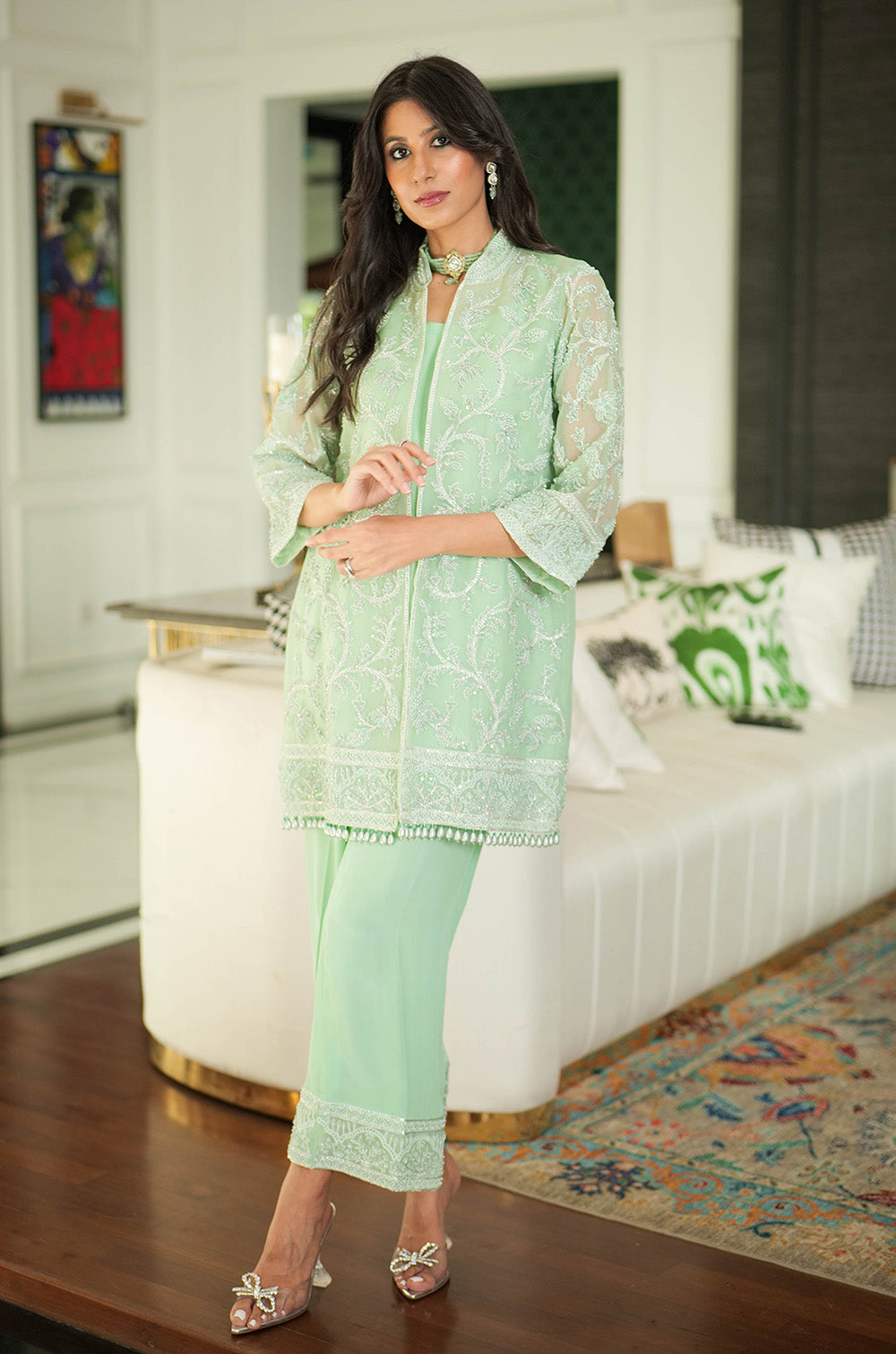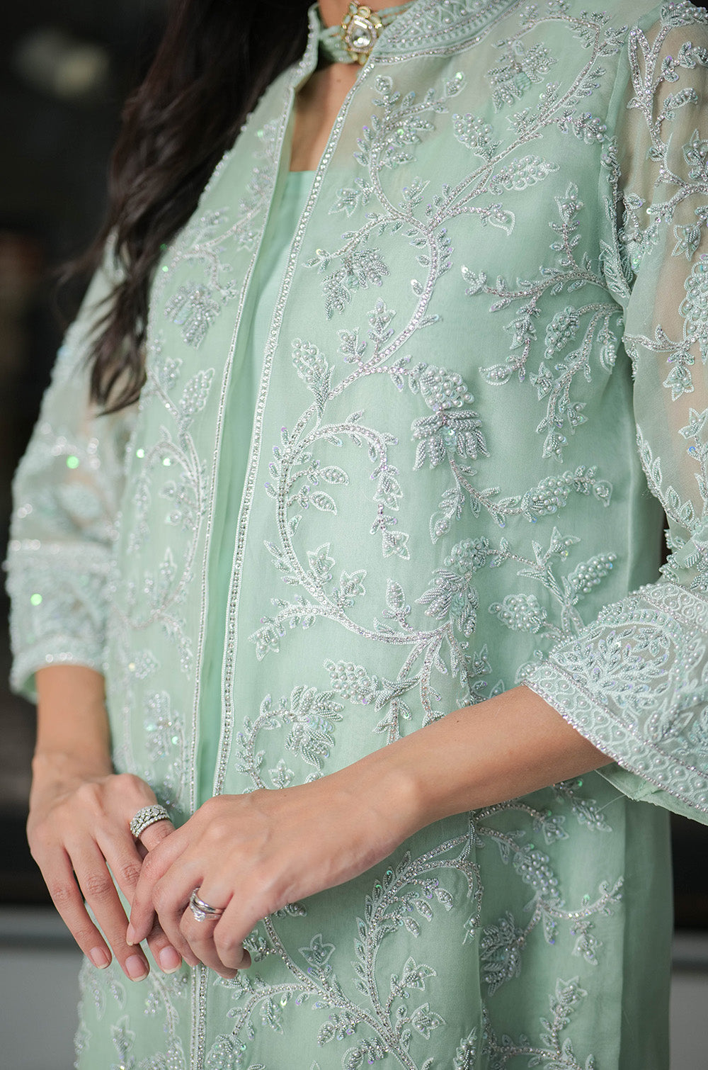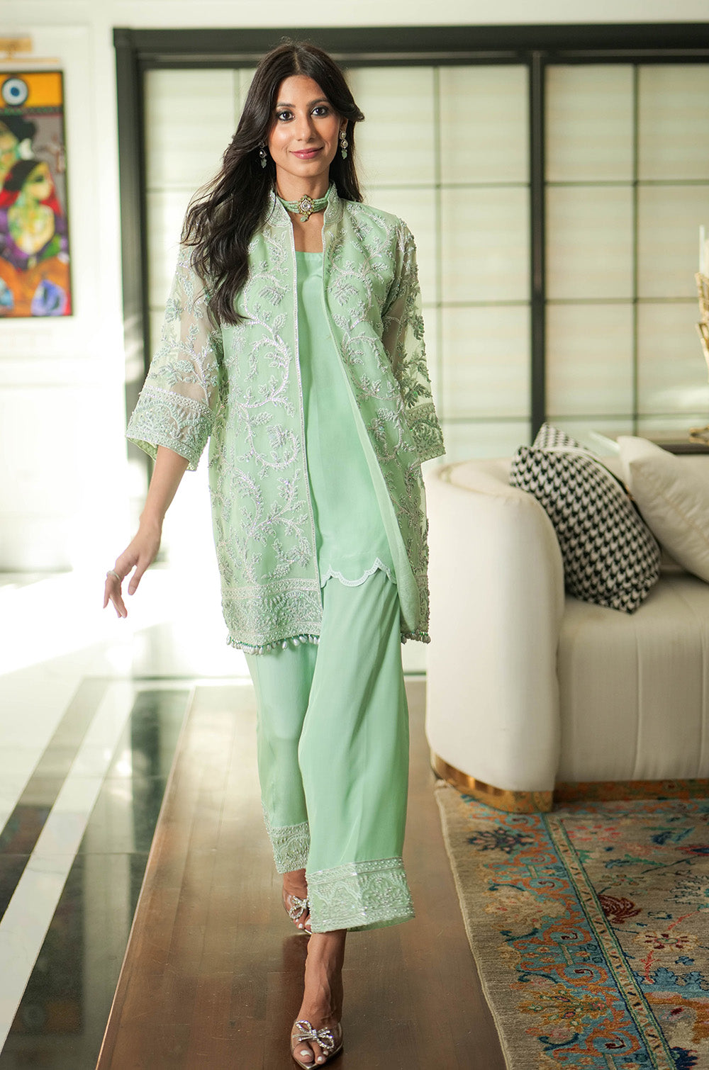 A mint organza jacket delicately rendered with threadwork and embellishment. The look is completed with crepe silk slip having scallop details in hem and cullotes with embroidered border.