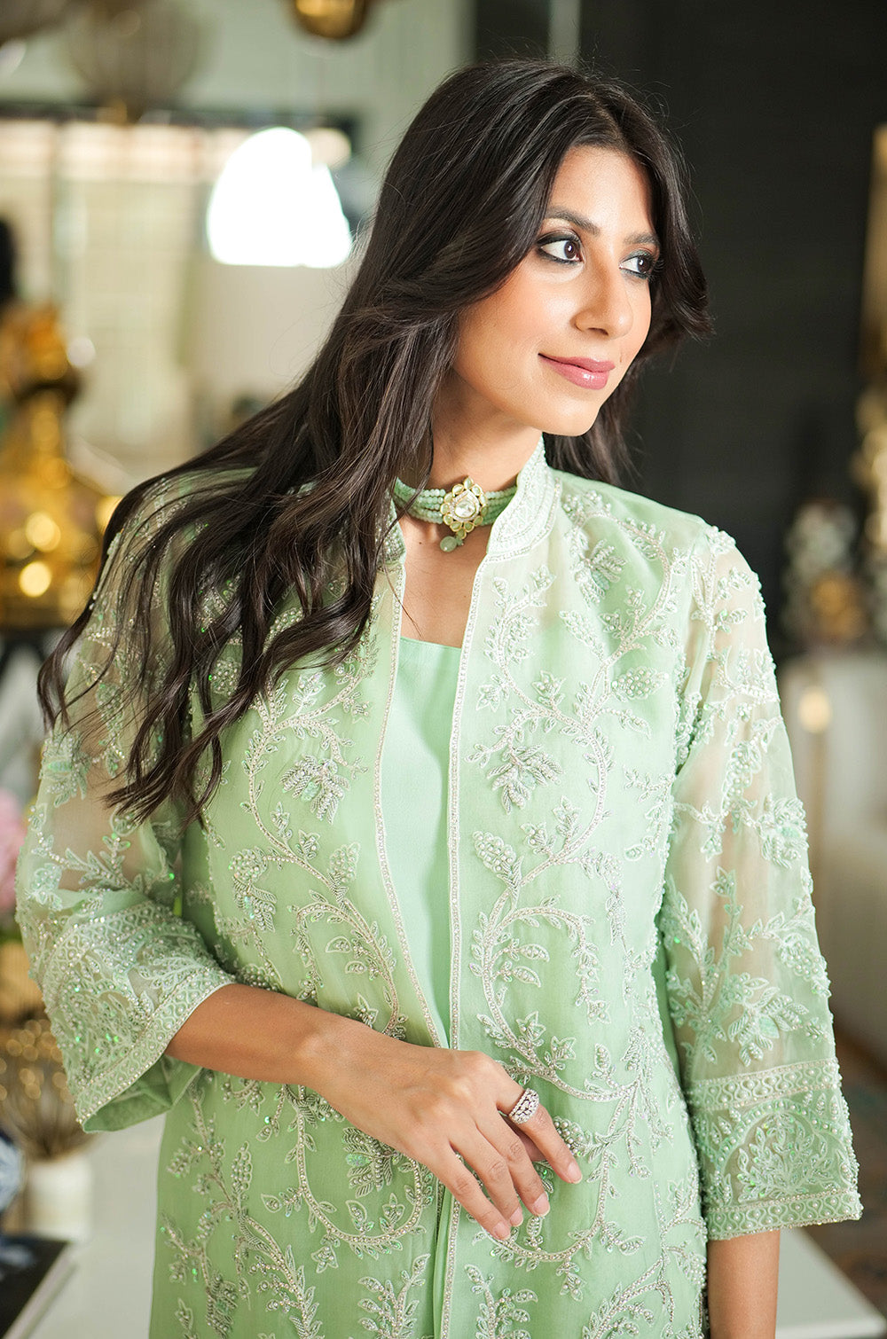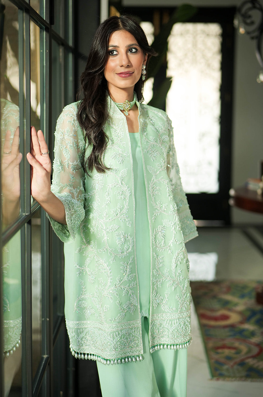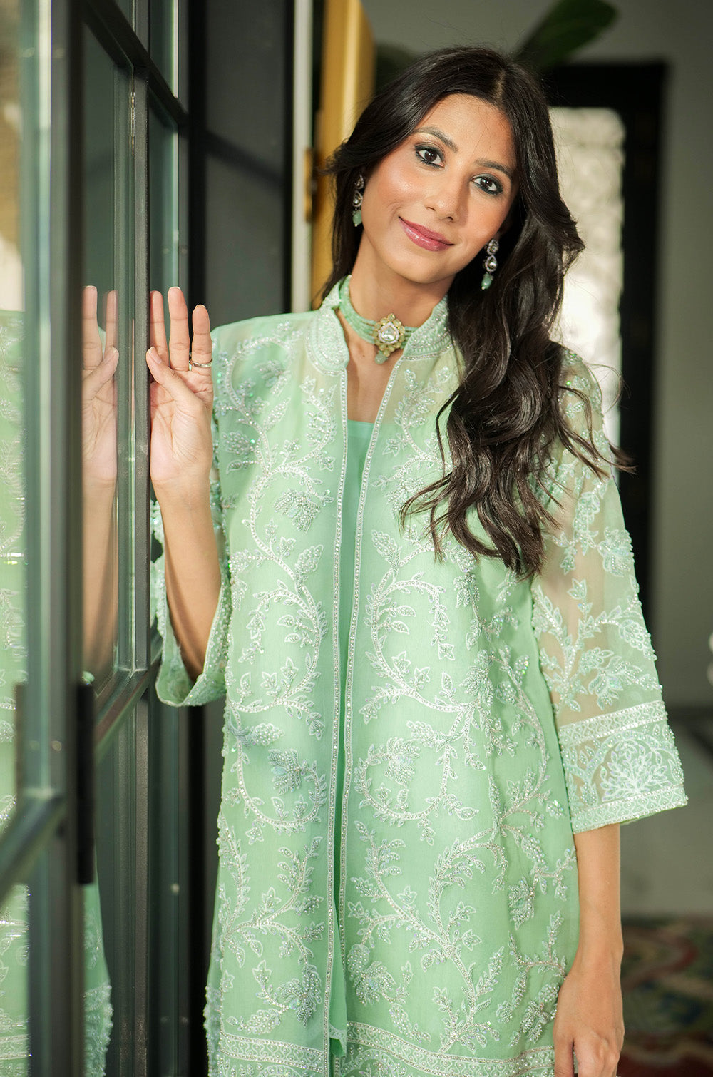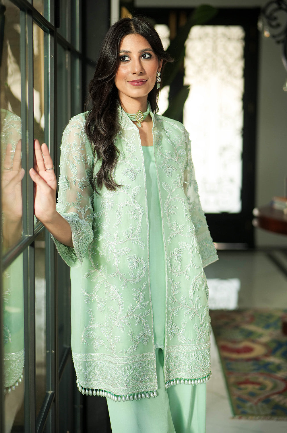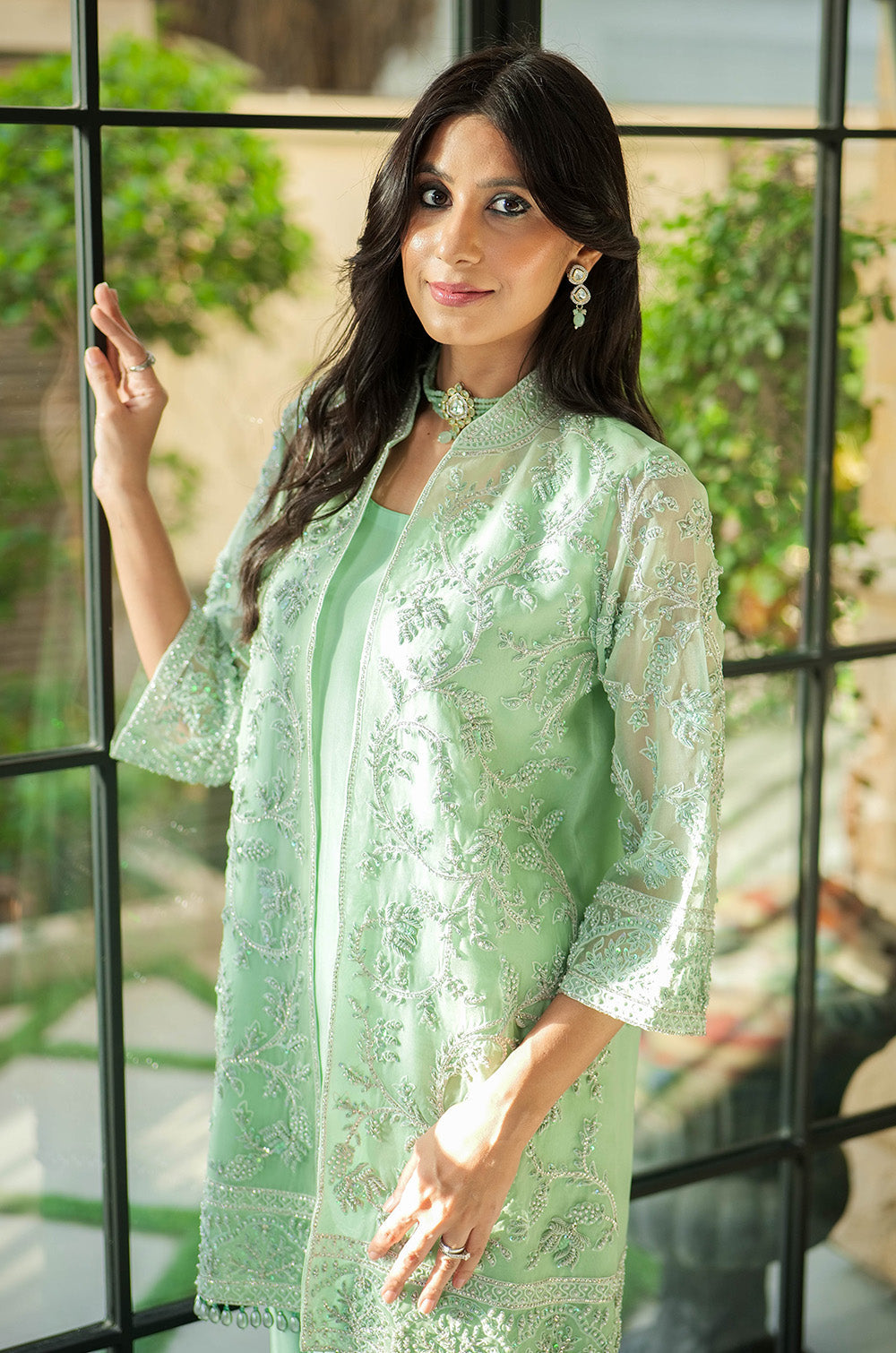 A mint organza jacket delicately rendered with threadwork and embellishment. The look is completed with crepe silk slip having scallop details in hem and cullotes with embroidered border.