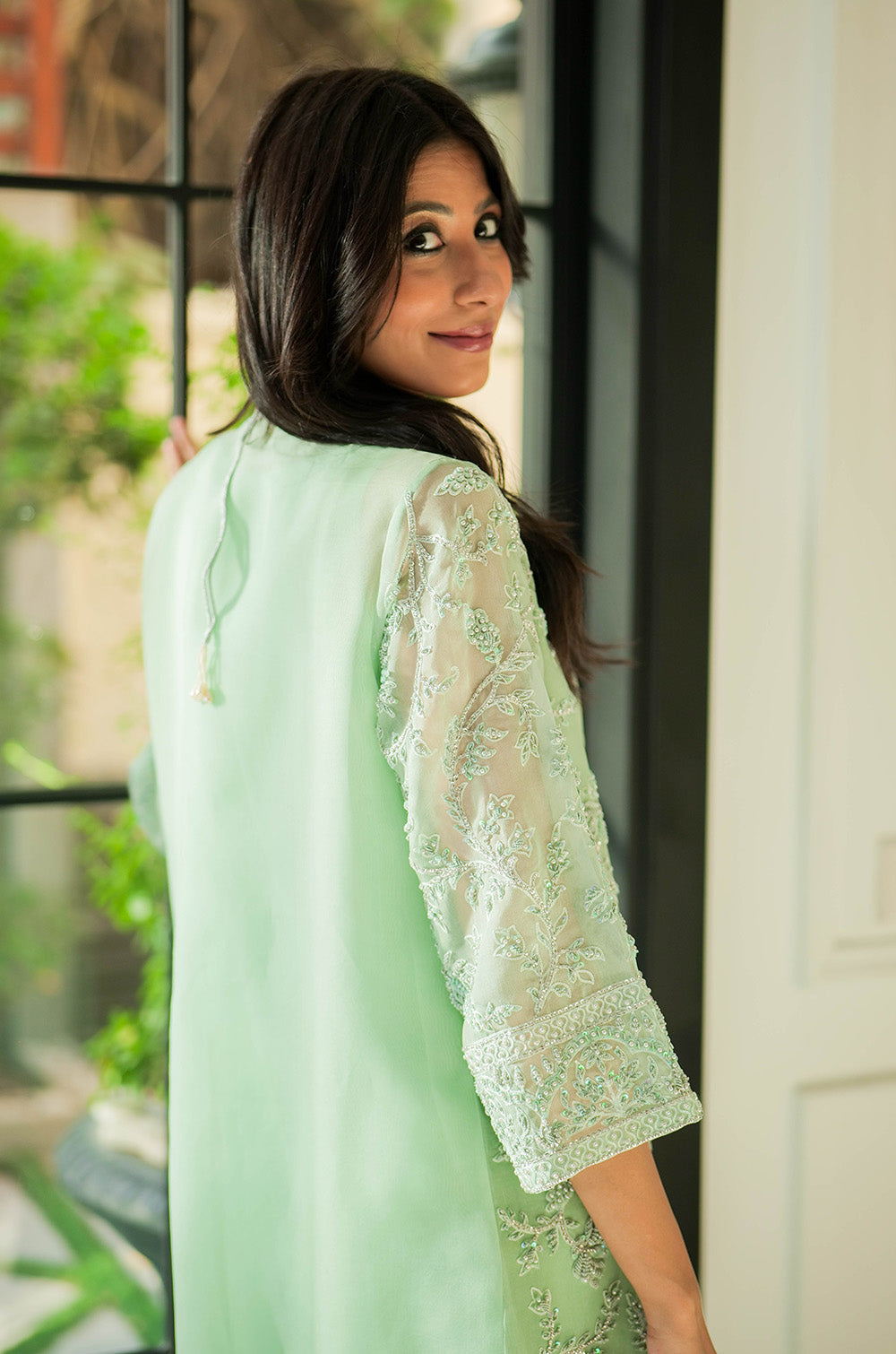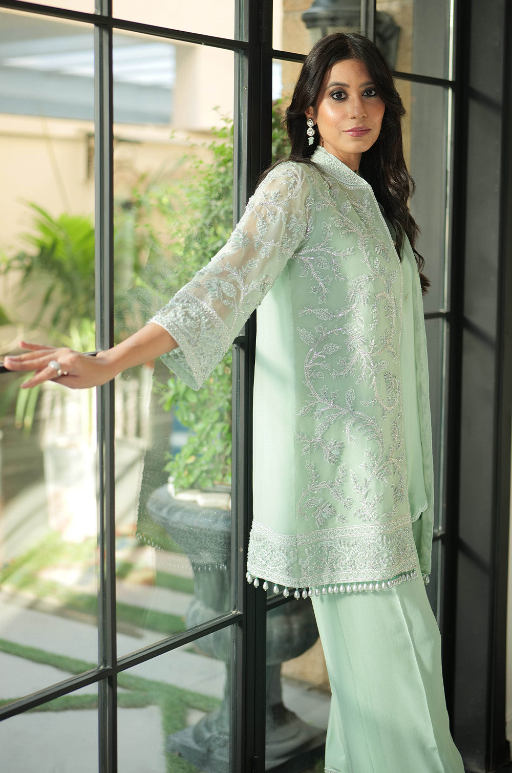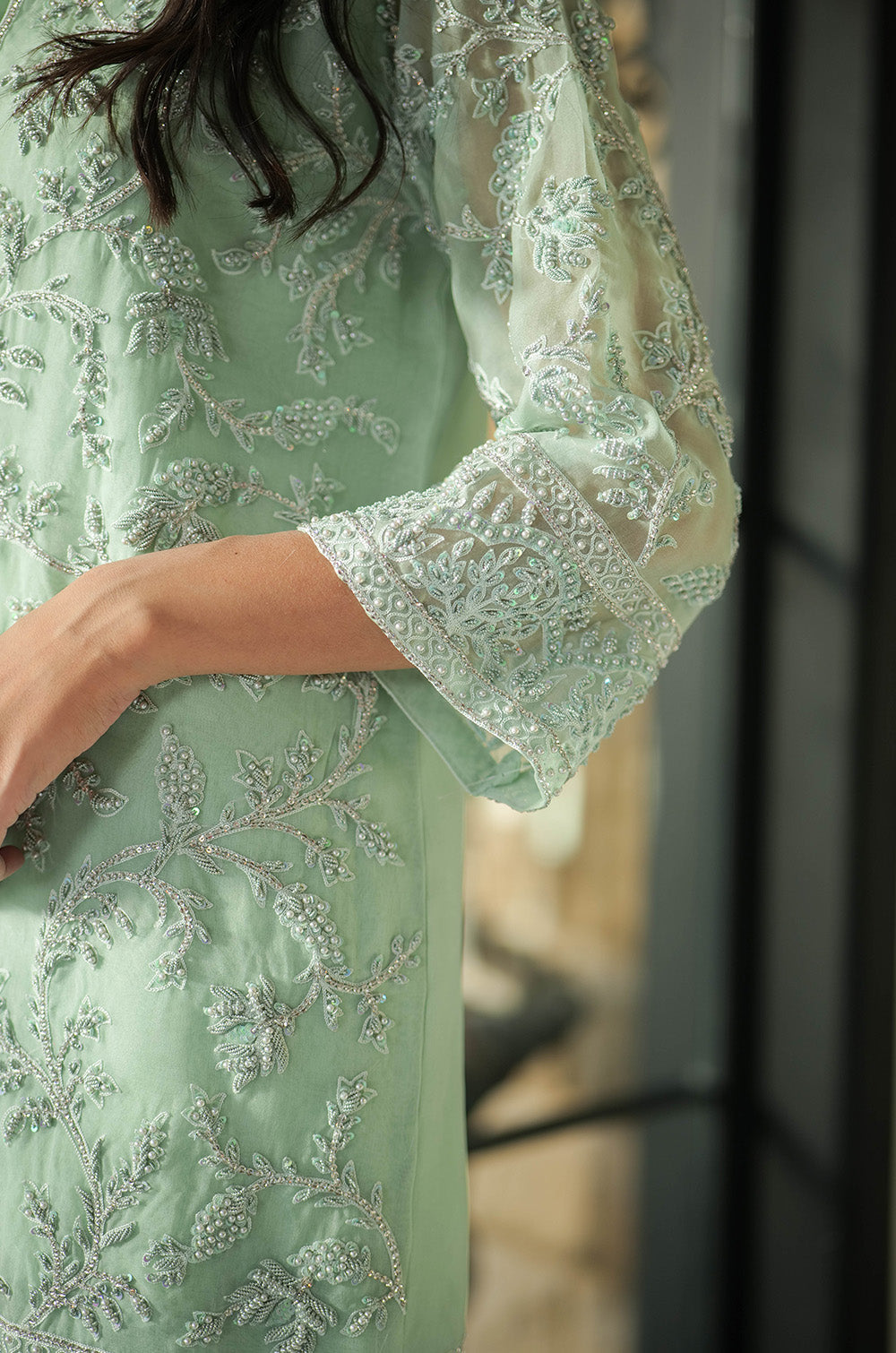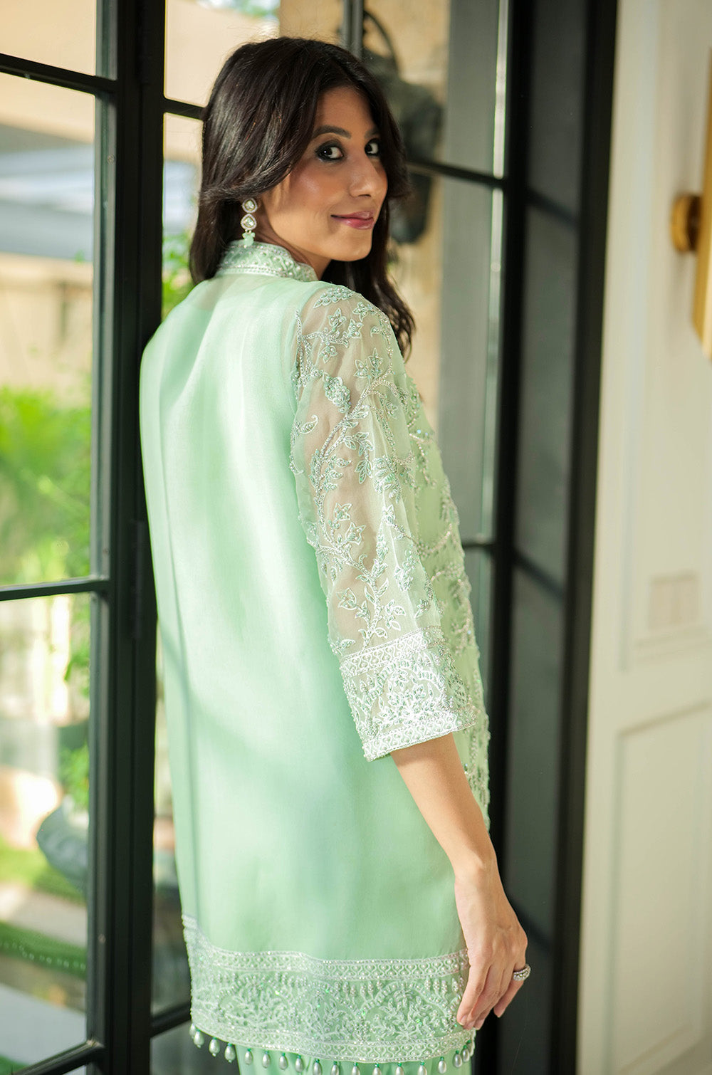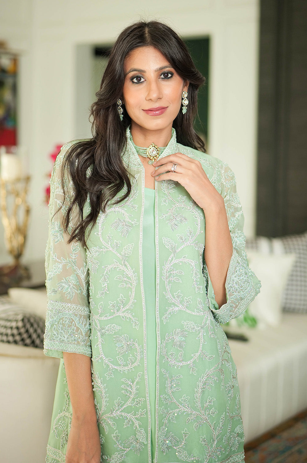 A mint organza jacket delicately rendered with threadwork and embellishment. The look is completed with crepe silk slip having scallop details in hem and cullotes with embroidered border.