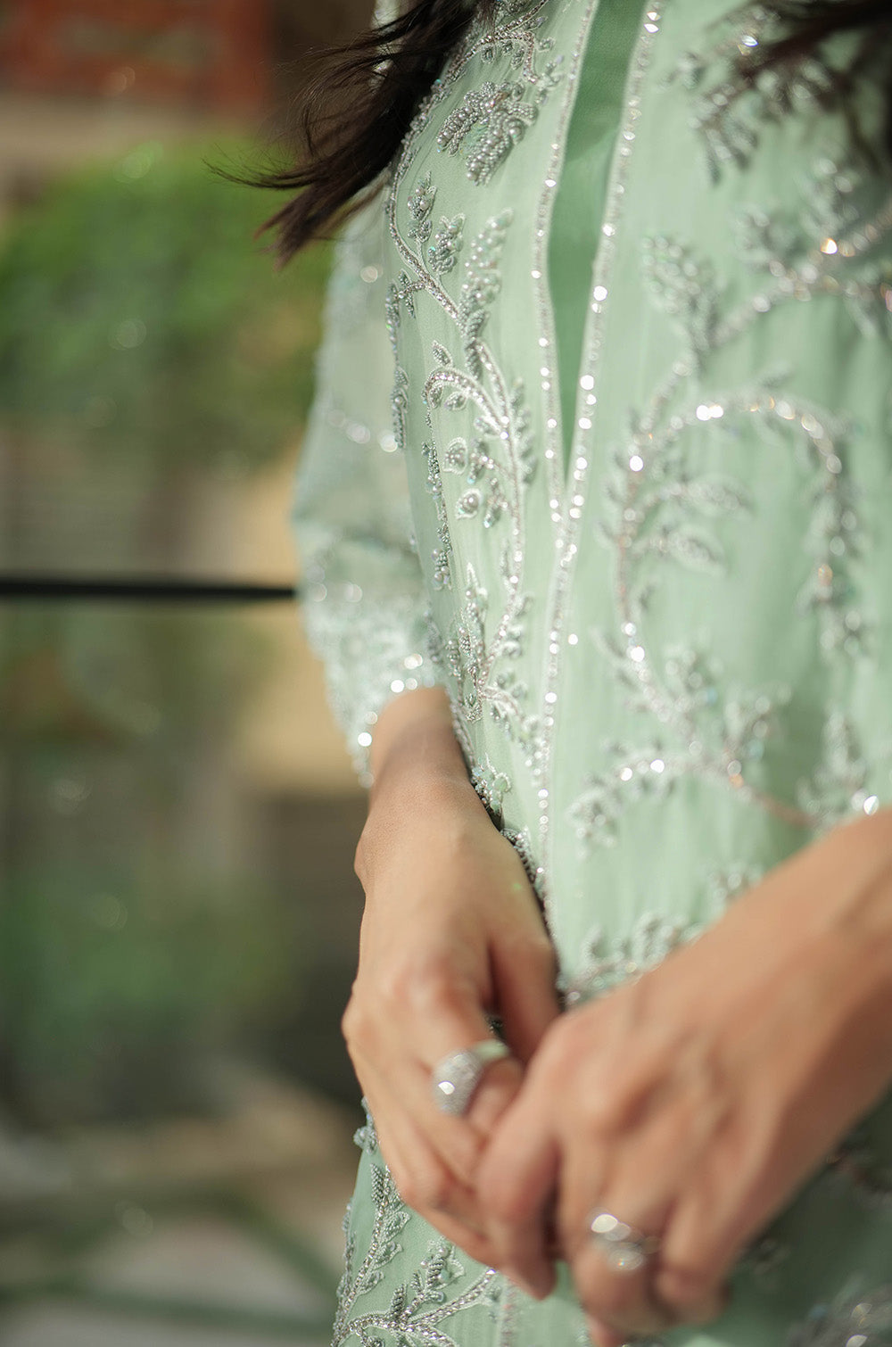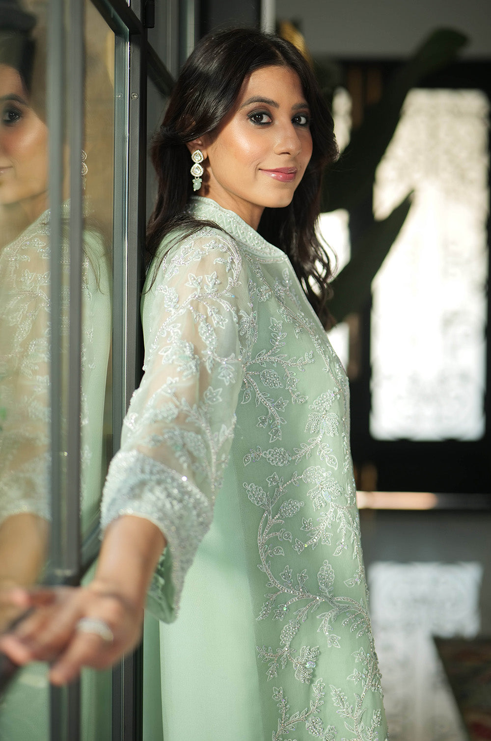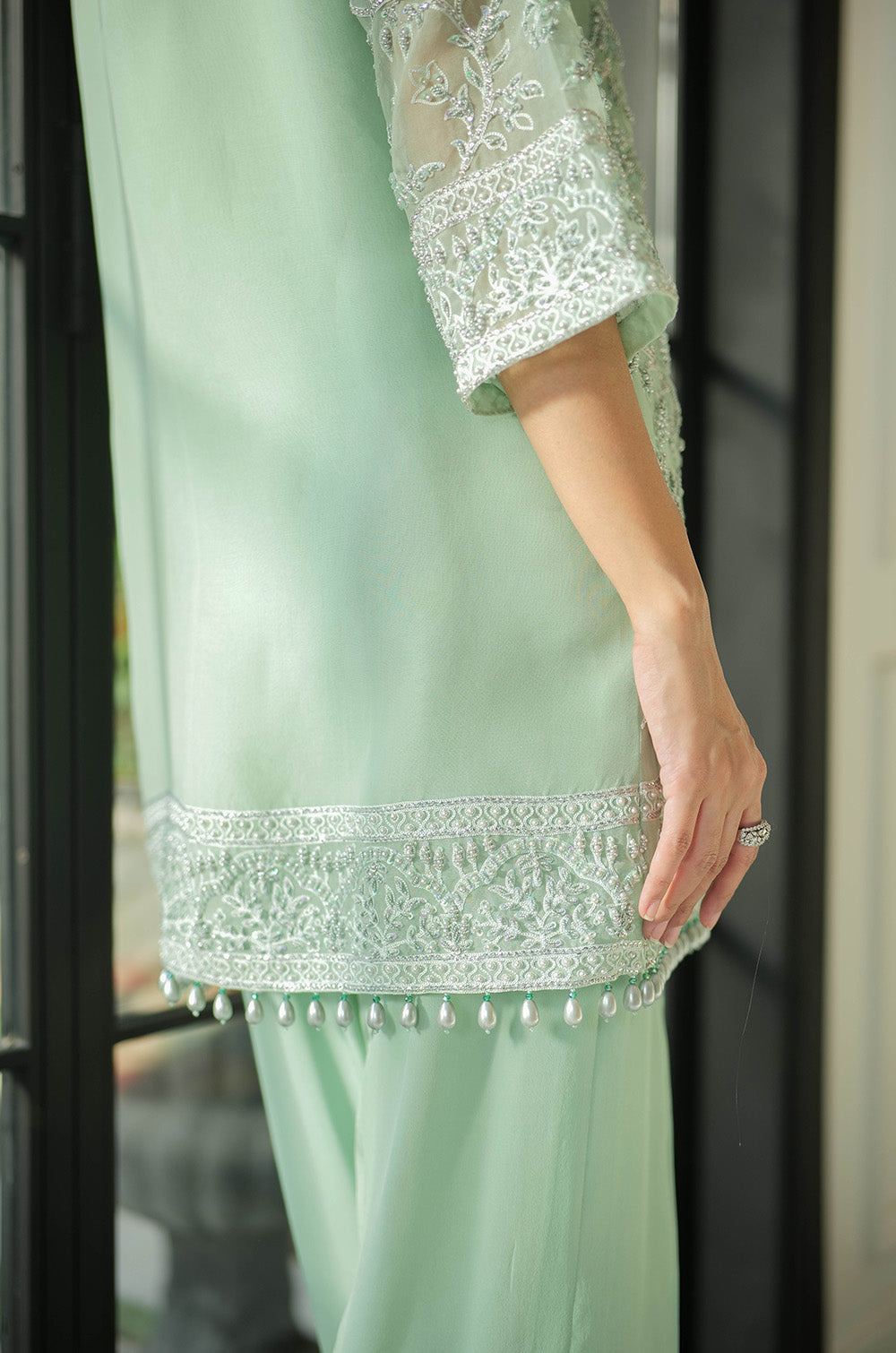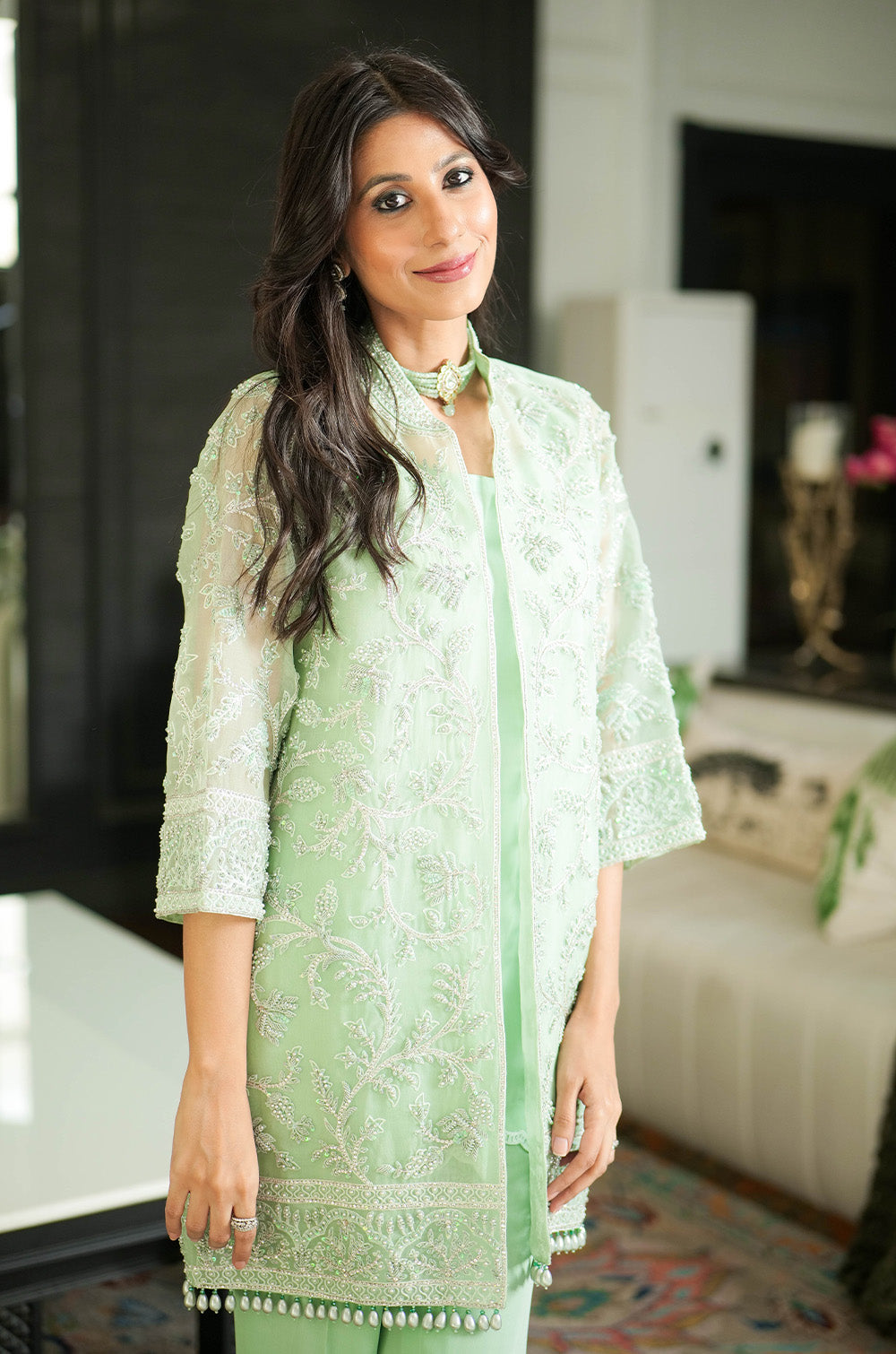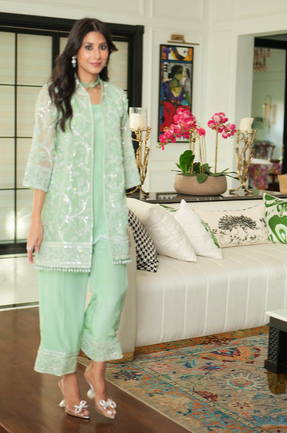 A mint organza jacket delicately rendered with threadwork and embellishment. The look is completed with crepe silk slip having scallop details in hem and cullotes with embroidered border.