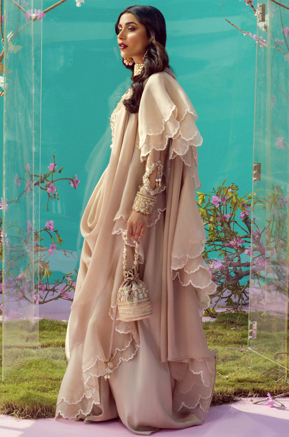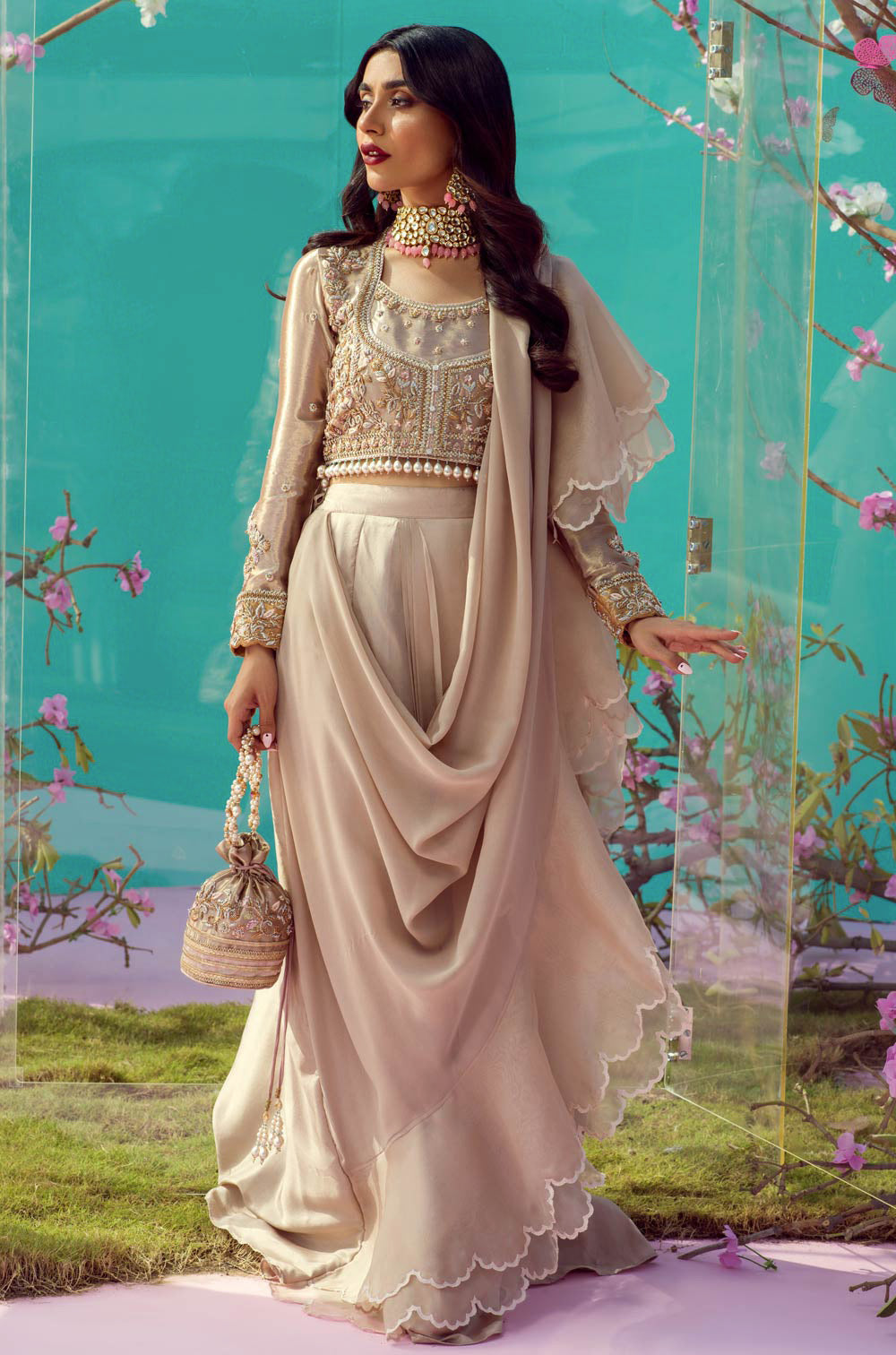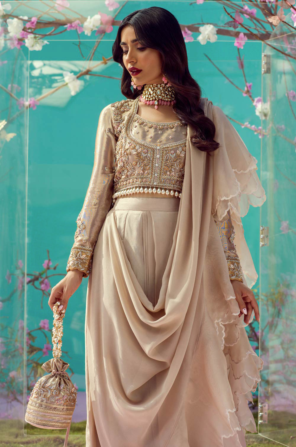 Carnations, beholds a meticulous symphony of classic and contemporary. A beautiful gold lame tissue choli with gold and silver zari work infused with shades of pink threads. Comes with a draped organza nude color skirt-sari featuring a bold ruffle pallu that enhances the entire outfit. A potli-style traditional bag with a pearl handle completes this avant-garde look.