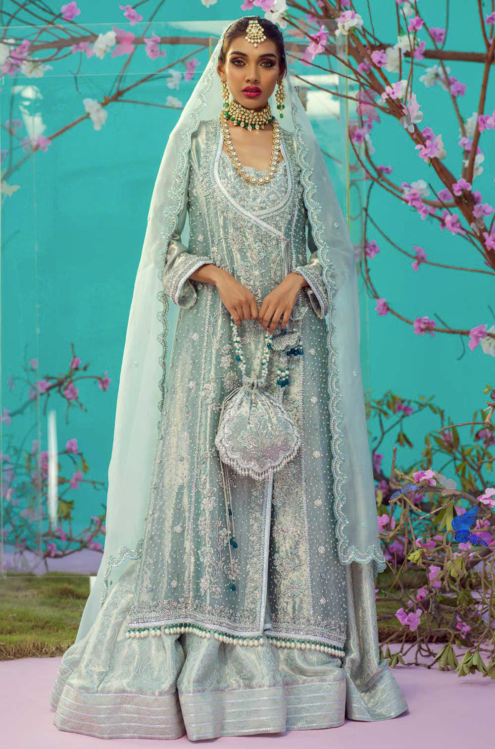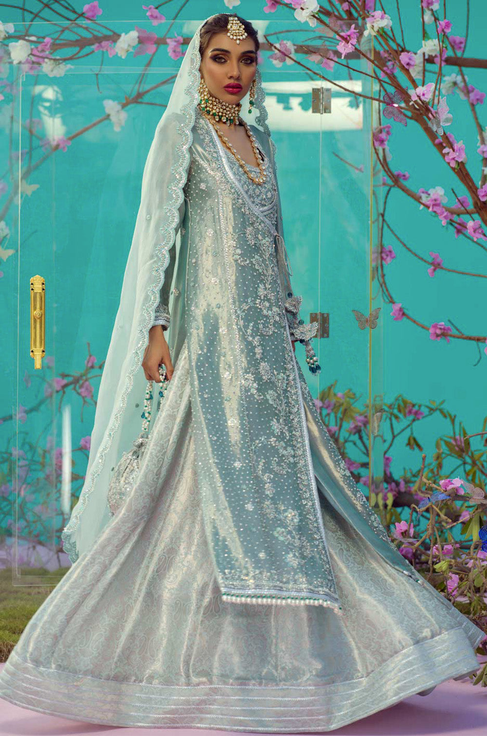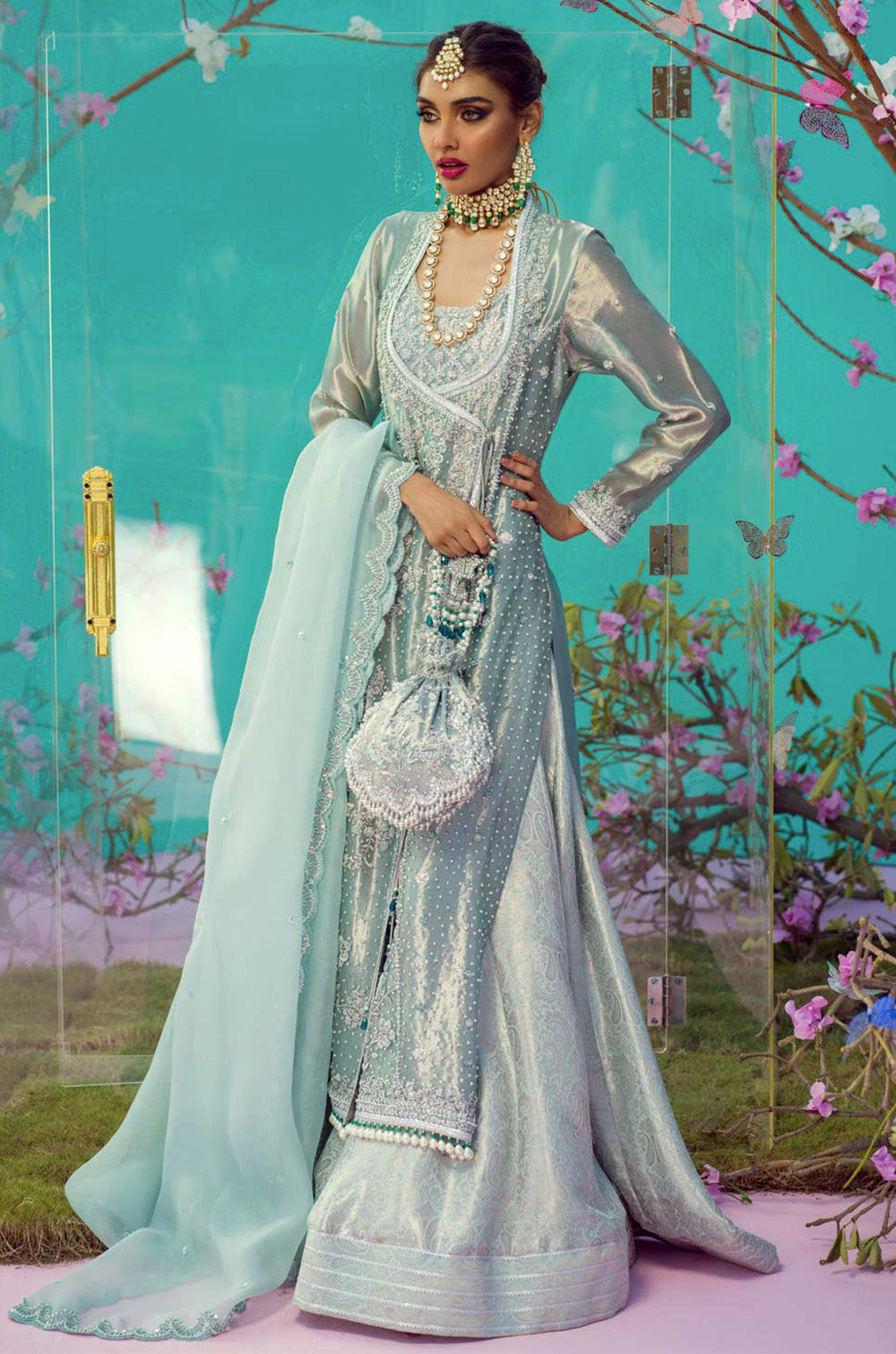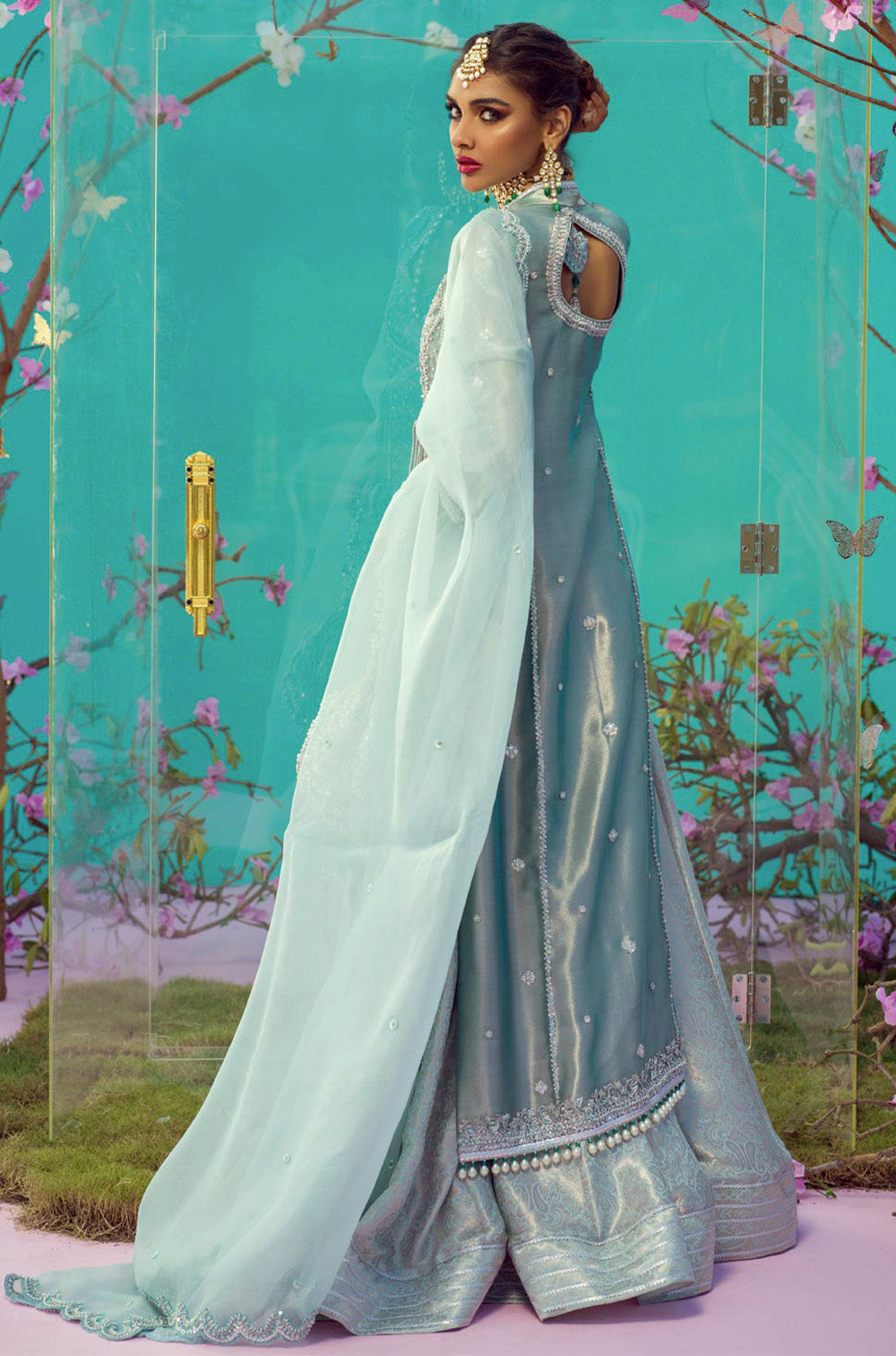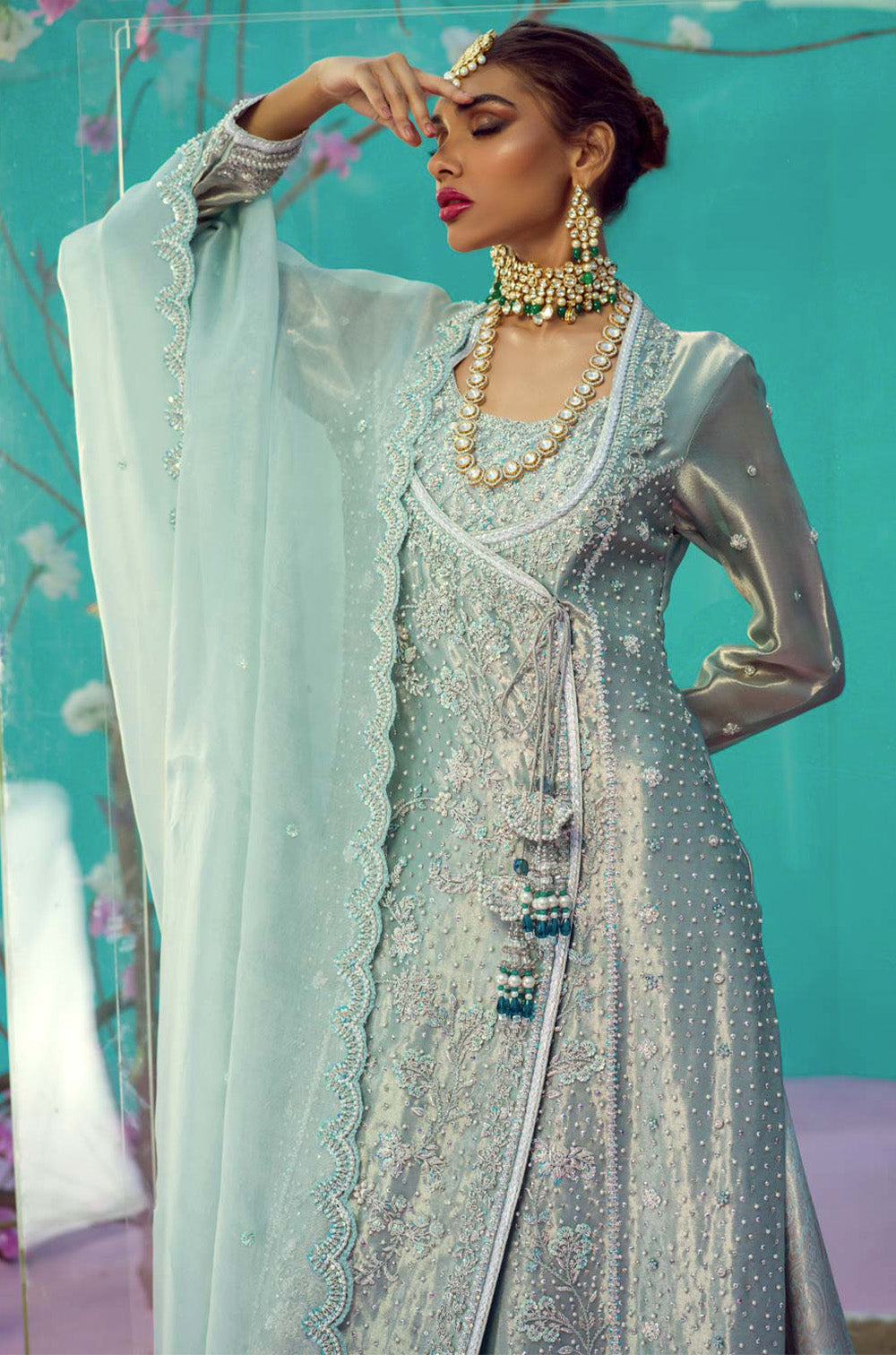 Exuding charm and grace this traditional angharka features delicate silver zardozi, ari, and sequins painstakingly handcrafted on a canvas of Icy blue tissue. Crystals and pearls are further encrusted all over the front. The cut-out back detail And delicate borders enhance the look. A richly self-patterned lehenga features gota kingri finish at the hem. Organza Dupatta, encrusted with chan and scalloped edges, completes the look.