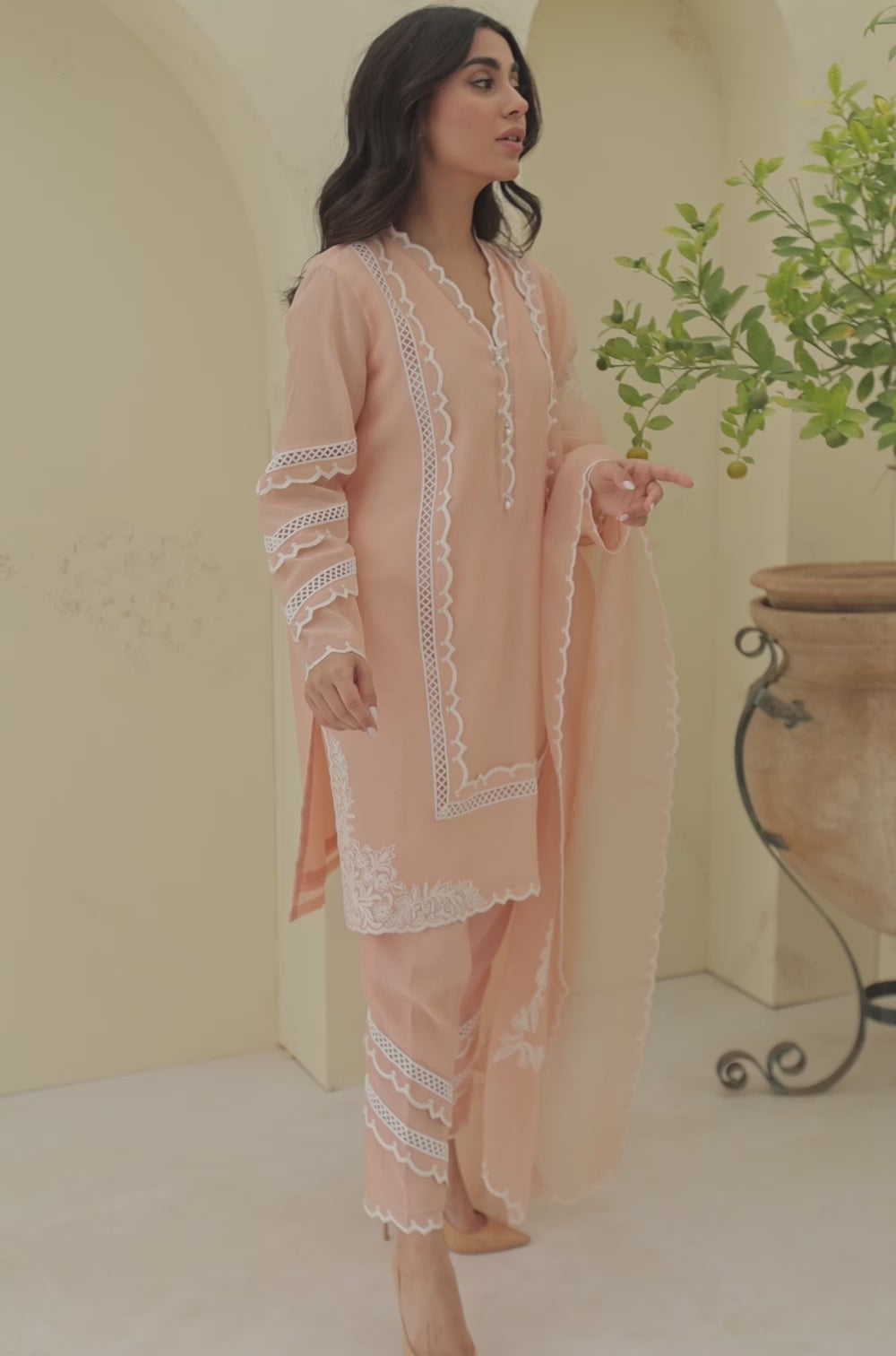 A lightweight cotton in a pastel peach colour perfect for a summer day. Shirt has intricate sleeves detailing with aari work on the front along with laces. Comes with matching lace detailed trousers and an organza dupatta with aari scallops and borders.