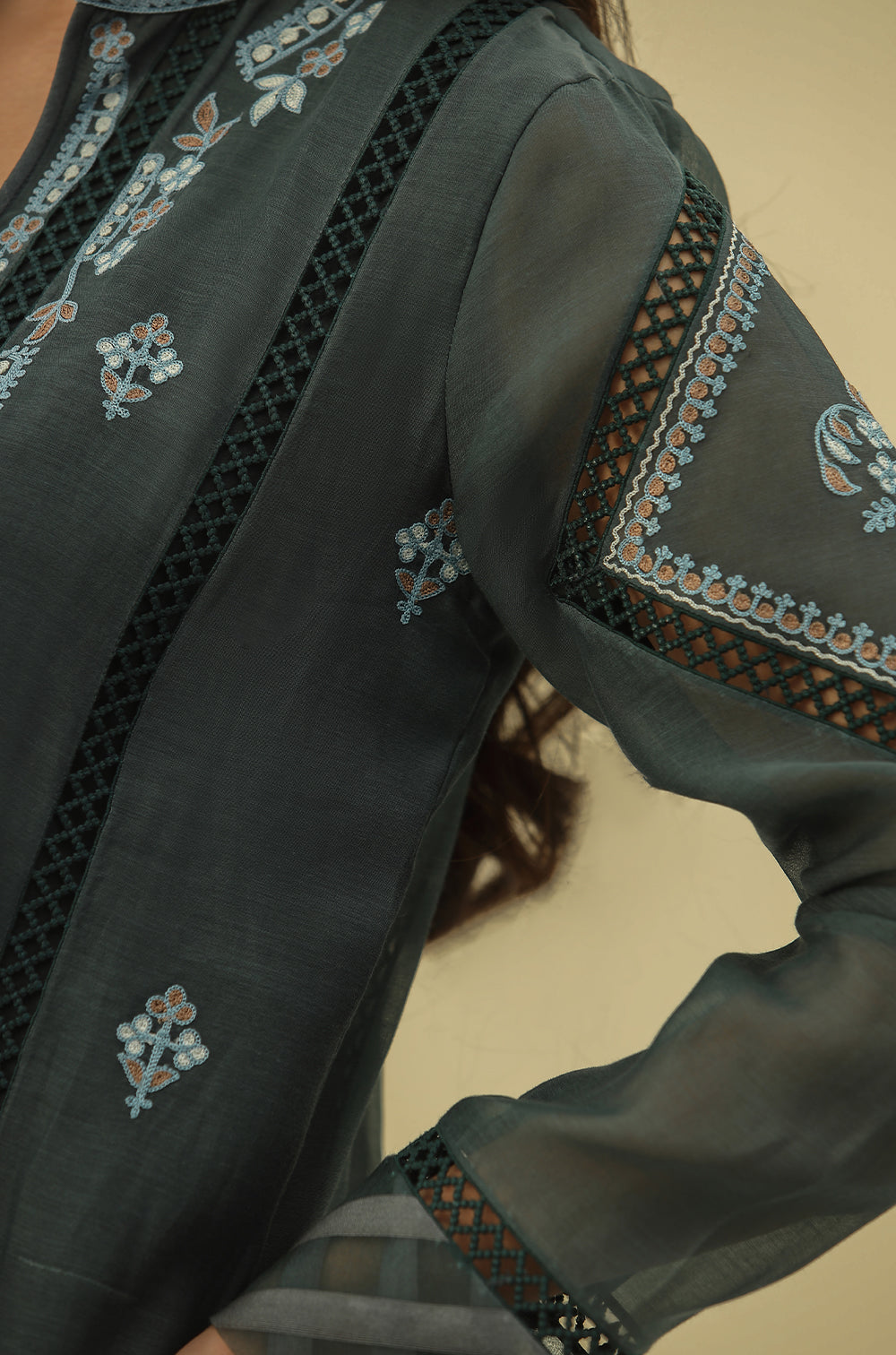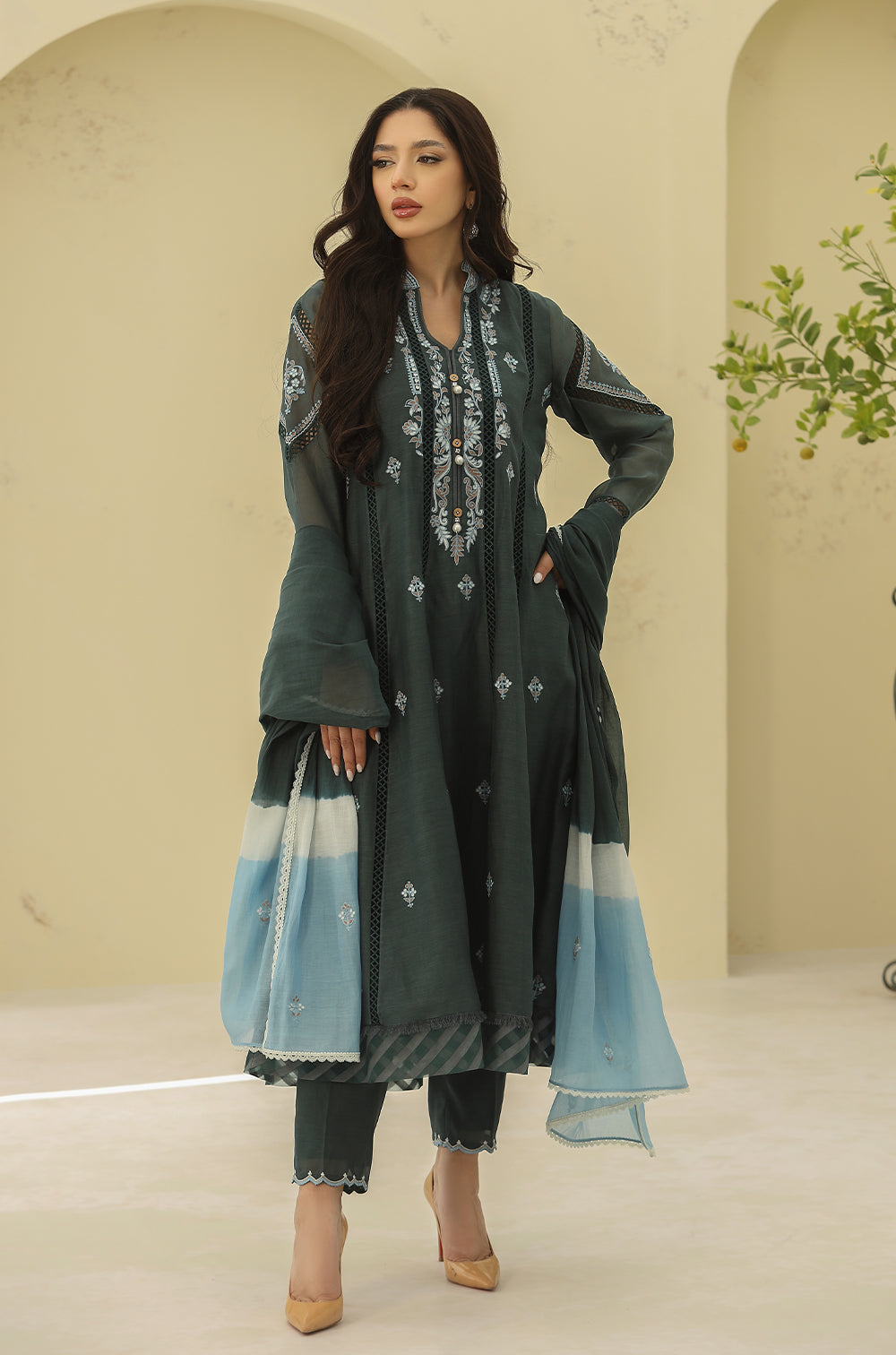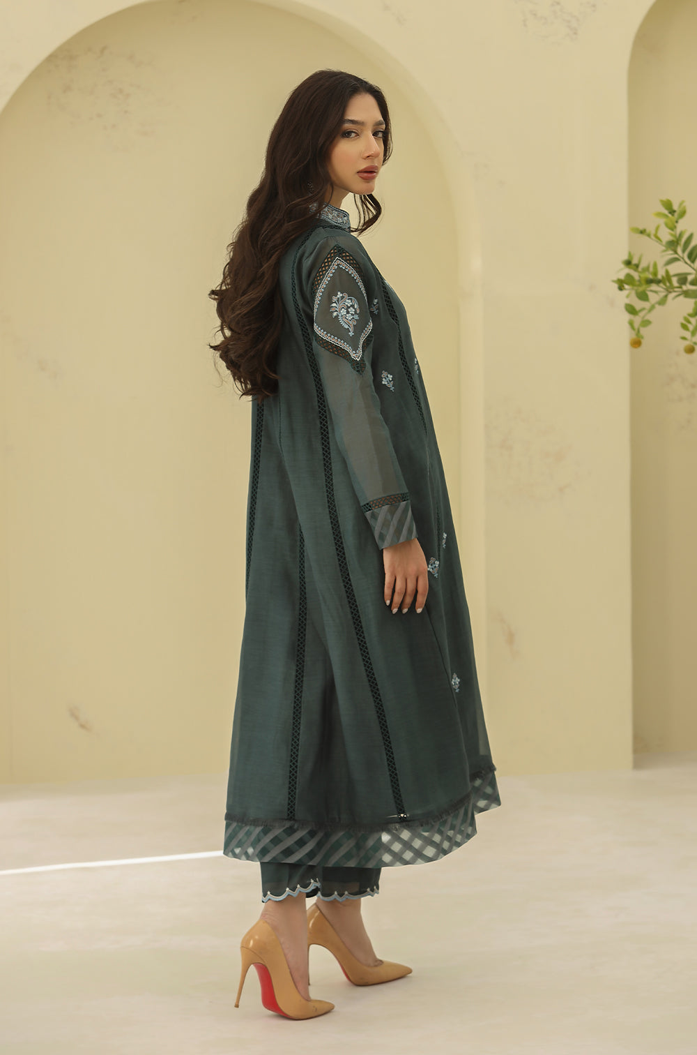 Stand apart from the crowd in this moss green kalidaar , with laces embroidery and exquisite wood and pearl buttons. Comes with optional matching trousers and a dip dyed dupatta with lace finishin.
