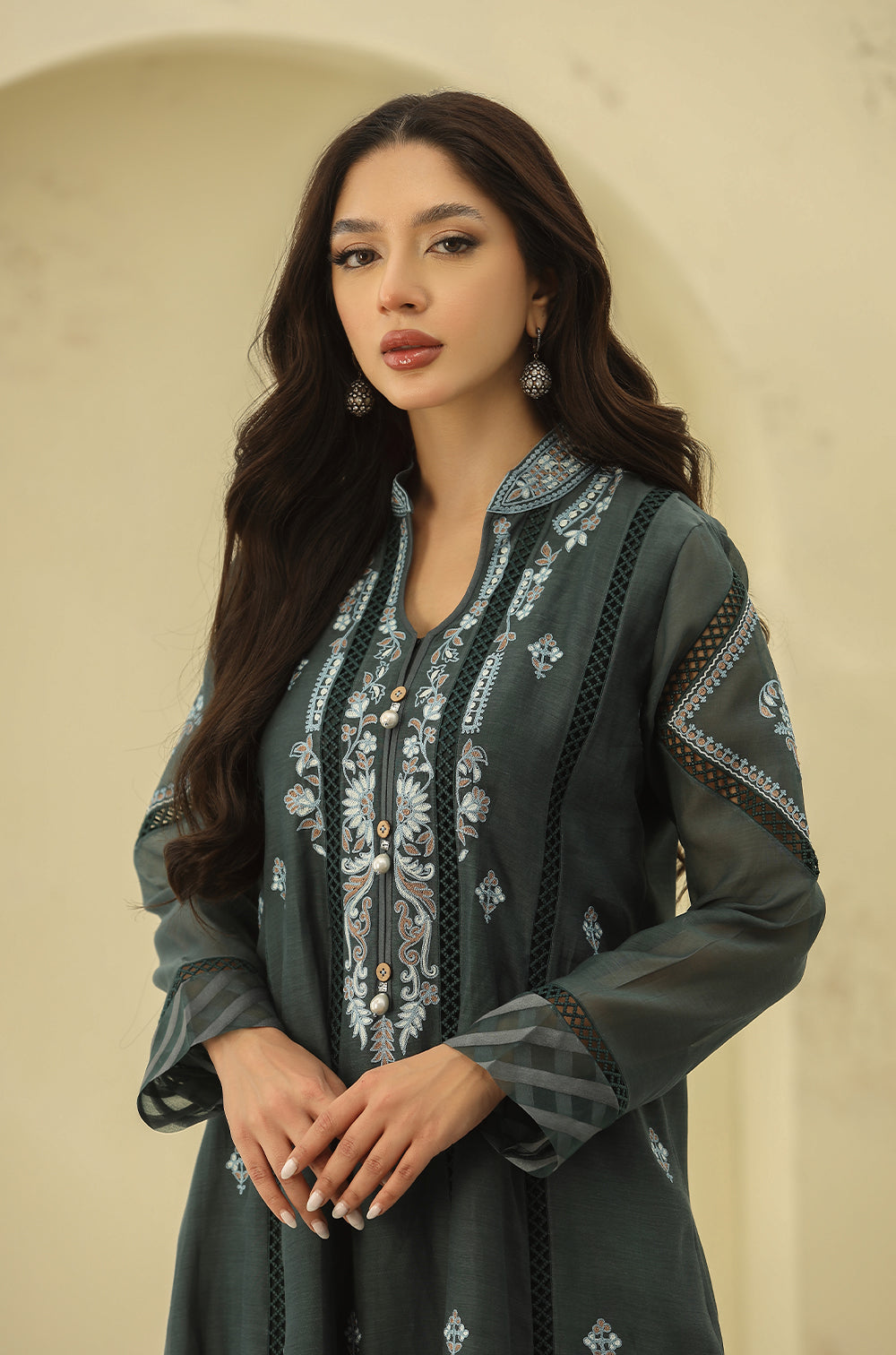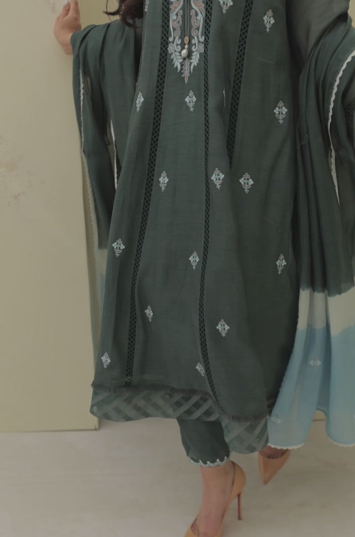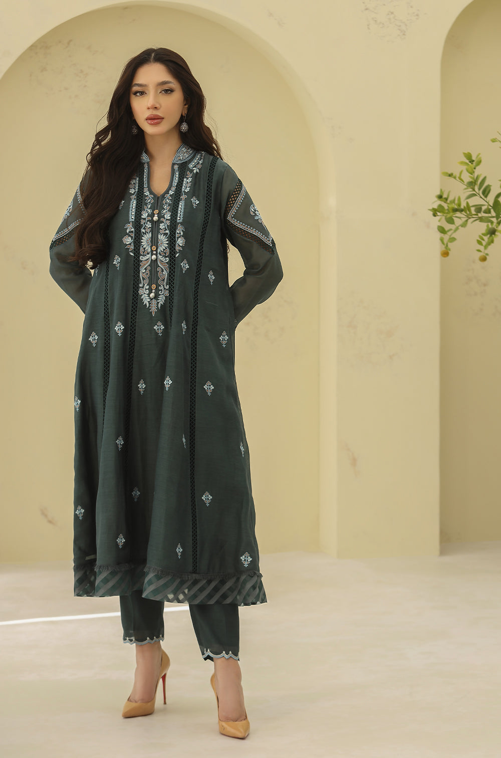Stand apart from the crowd in this moss green kalidaar , with laces embroidery and exquisite wood and pearl buttons. Comes with optional matching trousers and a dip dyed dupatta with lace finishin.