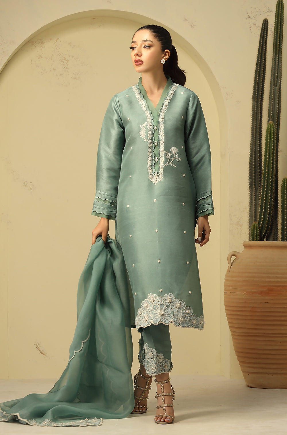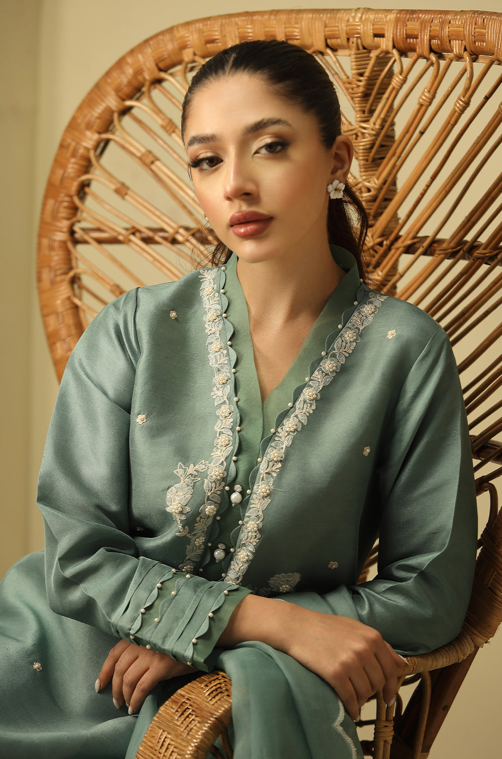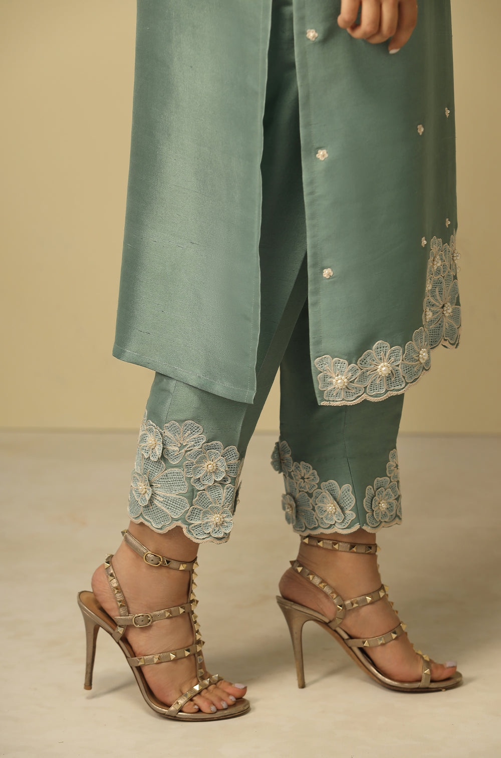 Floral motifs on a canvas of pure rawsilk, in a delightful sage color — a sophisticated look that can easily be styled from day to night.