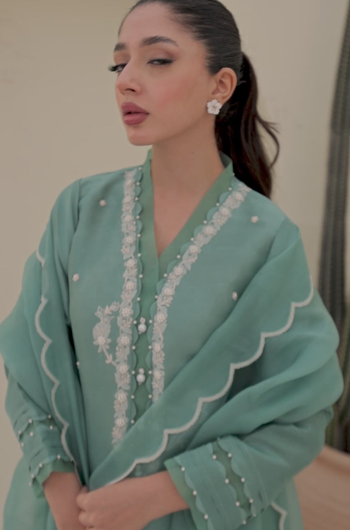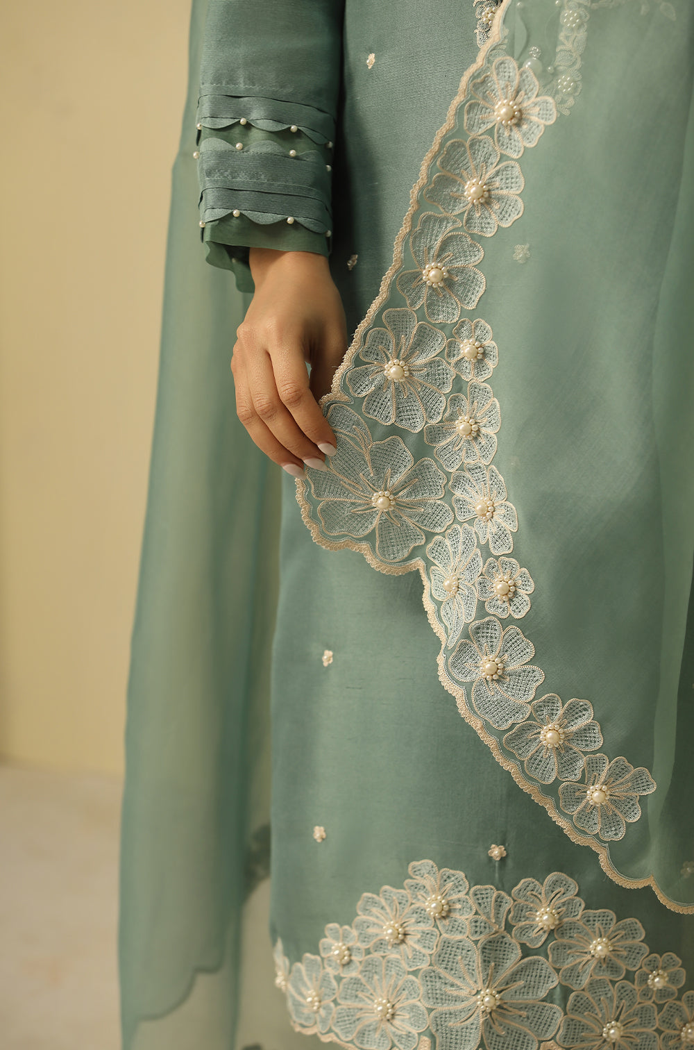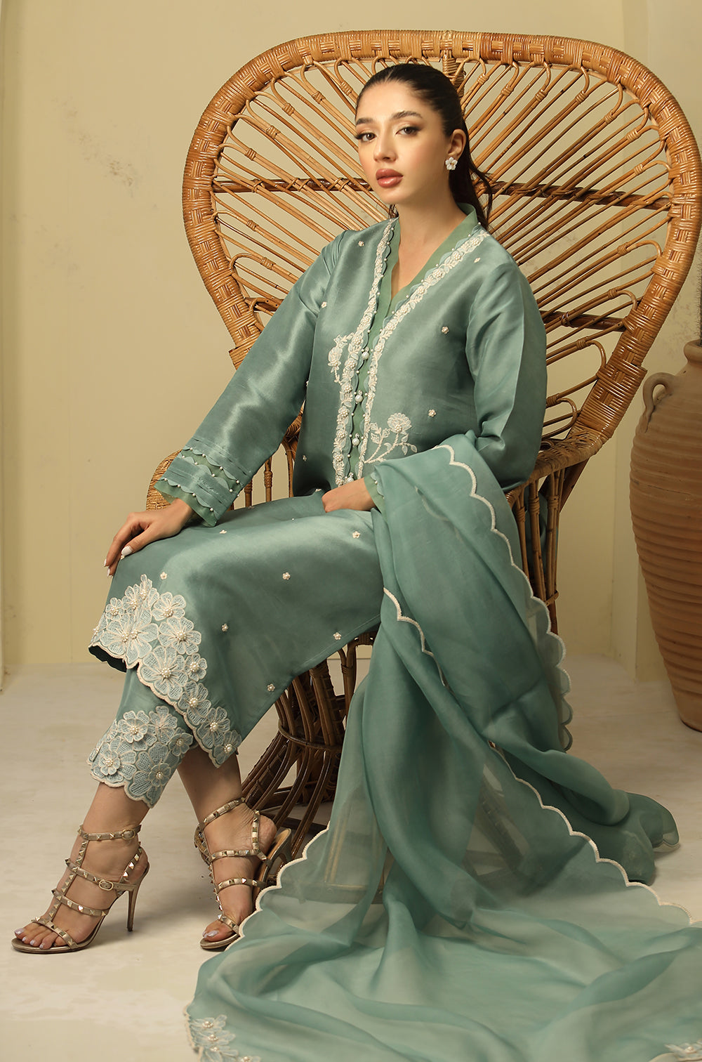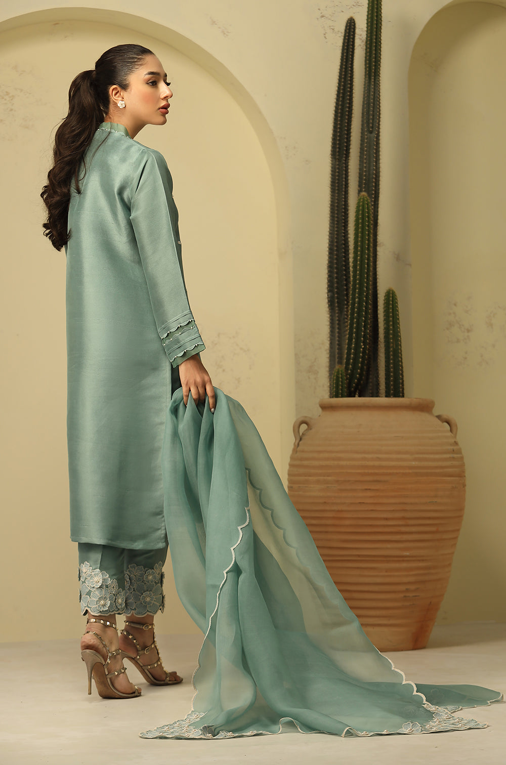 Floral motifs on a canvas of pure rawsilk, in a delightful sage color — a sophisticated look that can easily be styled from day to night.