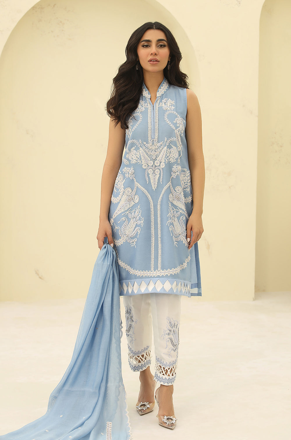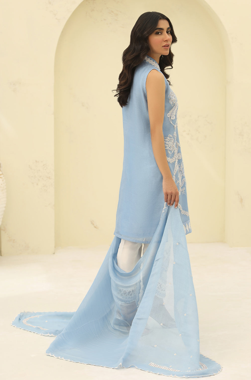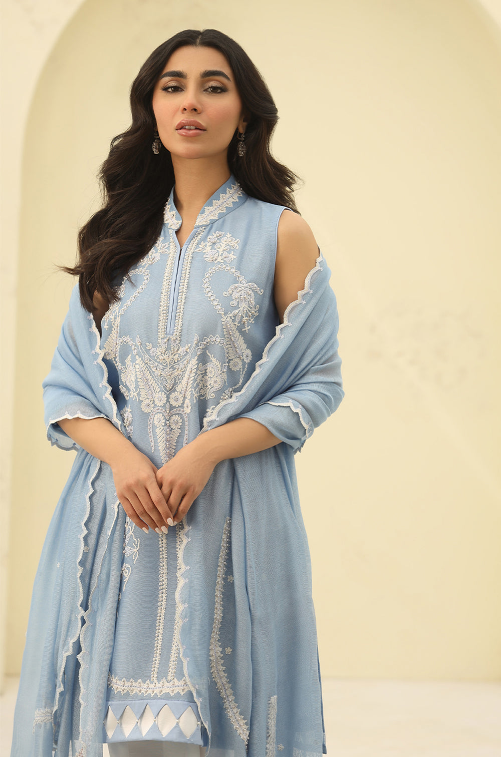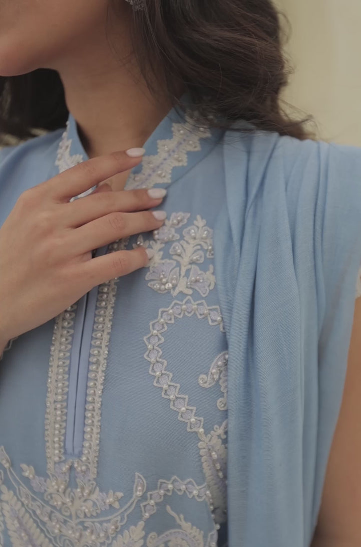 Gorgeous ari work enhanced with pearls and crystals all over the front , paired with contrasting white rawsilk trousers that echo the embroidery on the shirt. Our signature stitching details enhance the daman while a glamorous cotton net Dupatta completes this summery look. An outfit that will carry you beyond the spring summer season in grace and style.