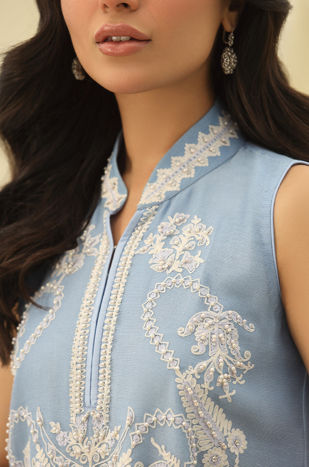 Gorgeous ari work enhanced with pearls and crystals all over the front , paired with contrasting white rawsilk trousers that...