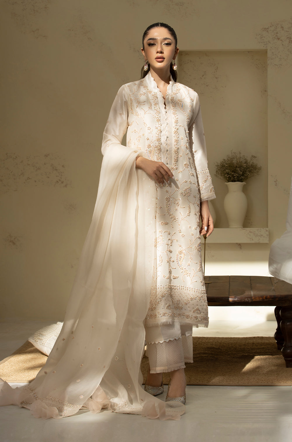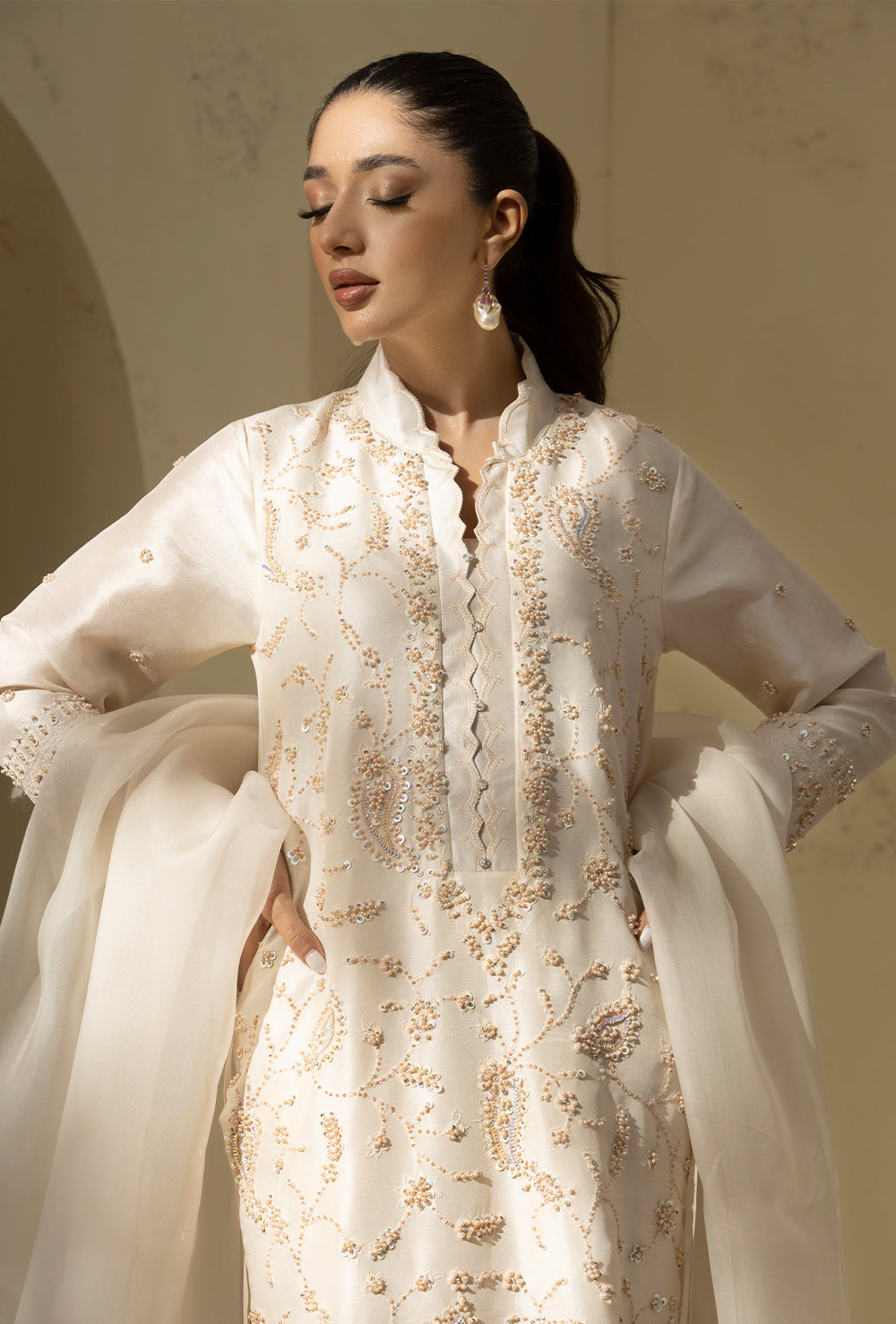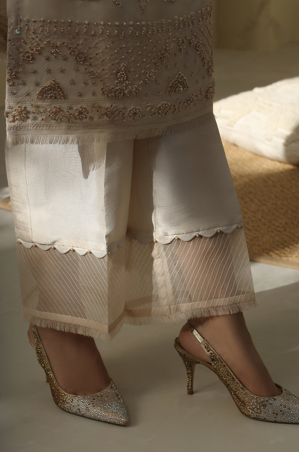 This sleek figure flattering shirt features a delicate jaal pattern encrusted with crystals sequins and pearls in self hues — the matching culottes with sheer cuffs add a touch of glamour to this serene ensemble that’s versatile enough for your many occasions.