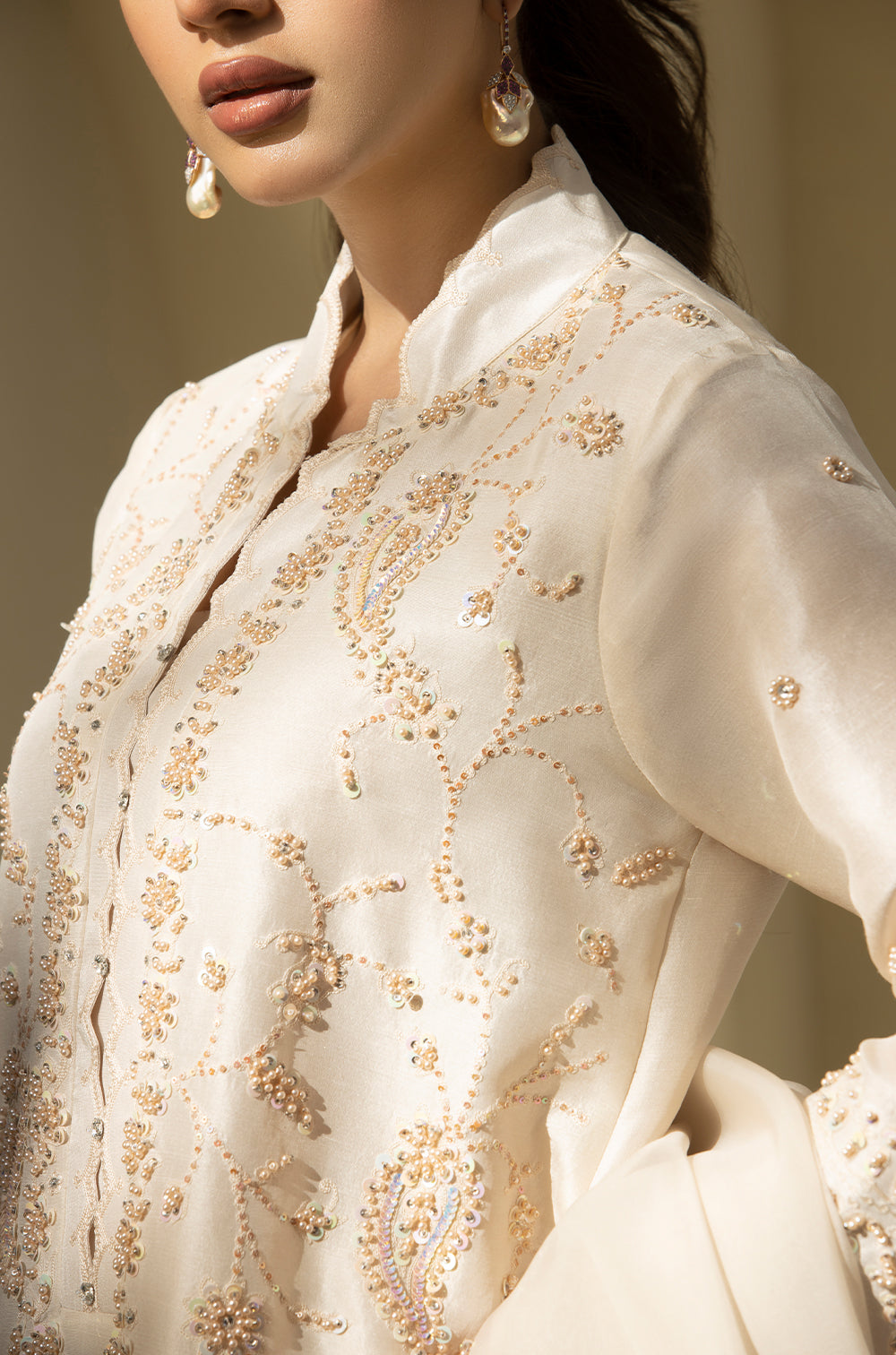 This sleek figure flattering shirt features a delicate jaal pattern encrusted with crystals sequins and pearls in self hues —...