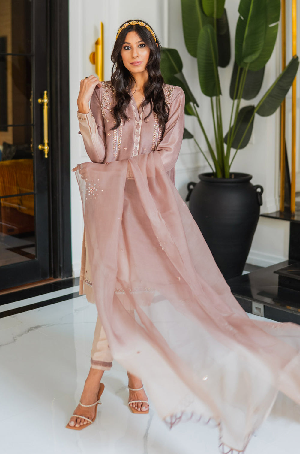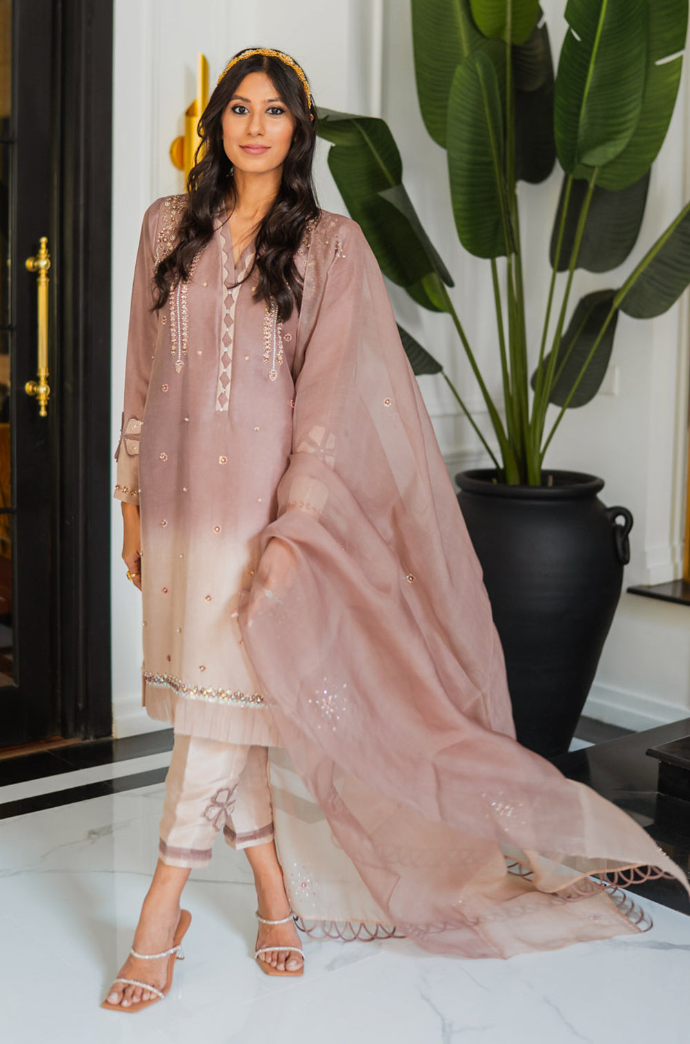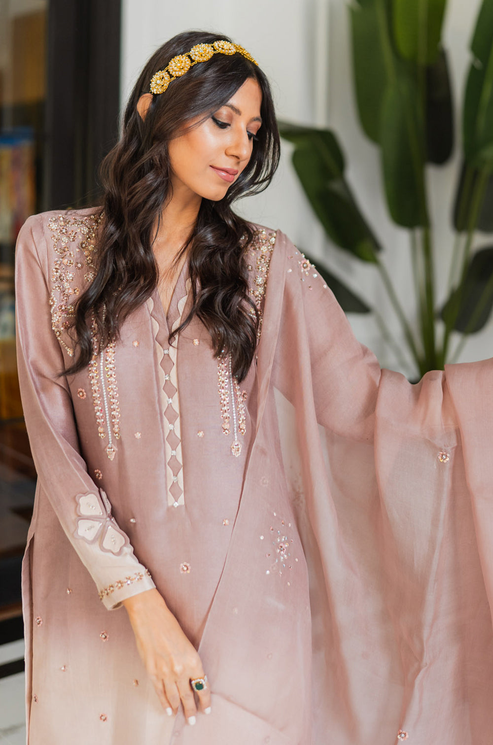 A pure rawsilk double shaded shirt with sequins and minuature floral detailing on the shoulder, bootis all over the front and paired with organza shaded dupatta with edging and clusters. The pure rawsilk pants feature a 3D floral design and hand distressed edges.