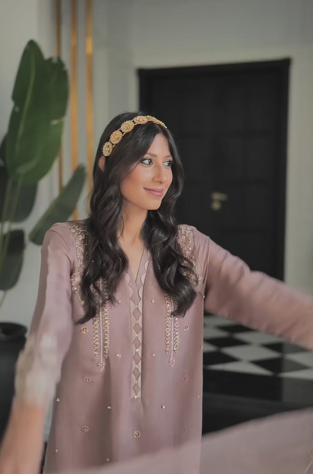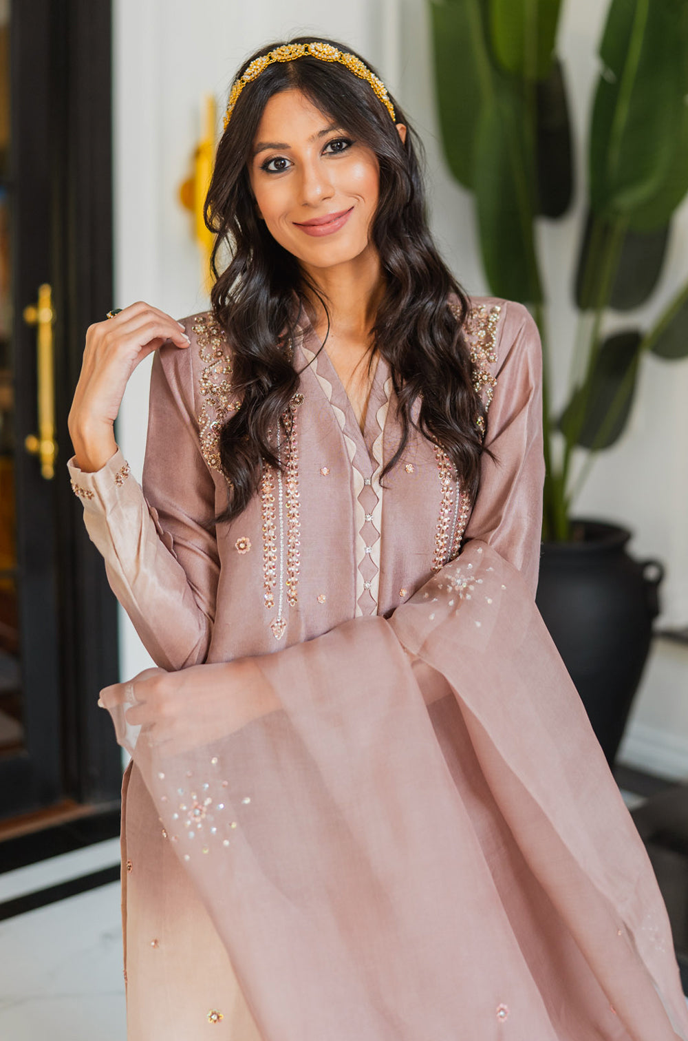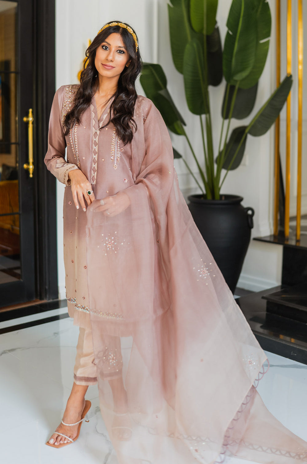 A pure rawsilk double shaded shirt with sequins and minuature floral detailing on the shoulder, bootis all over the front and paired with organza shaded dupatta with edging and clusters. The pure rawsilk pants feature a 3D floral design and hand distressed edges.