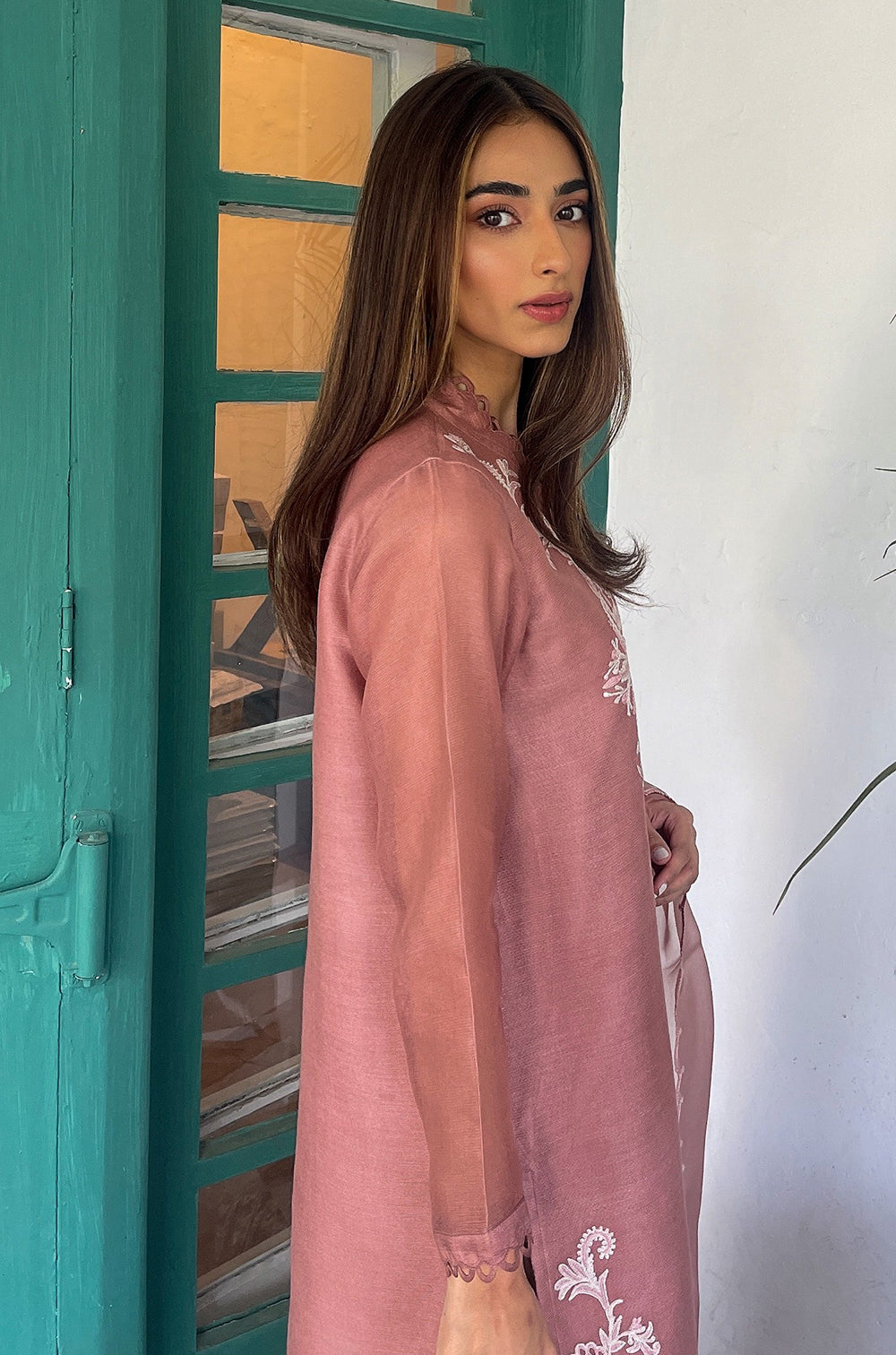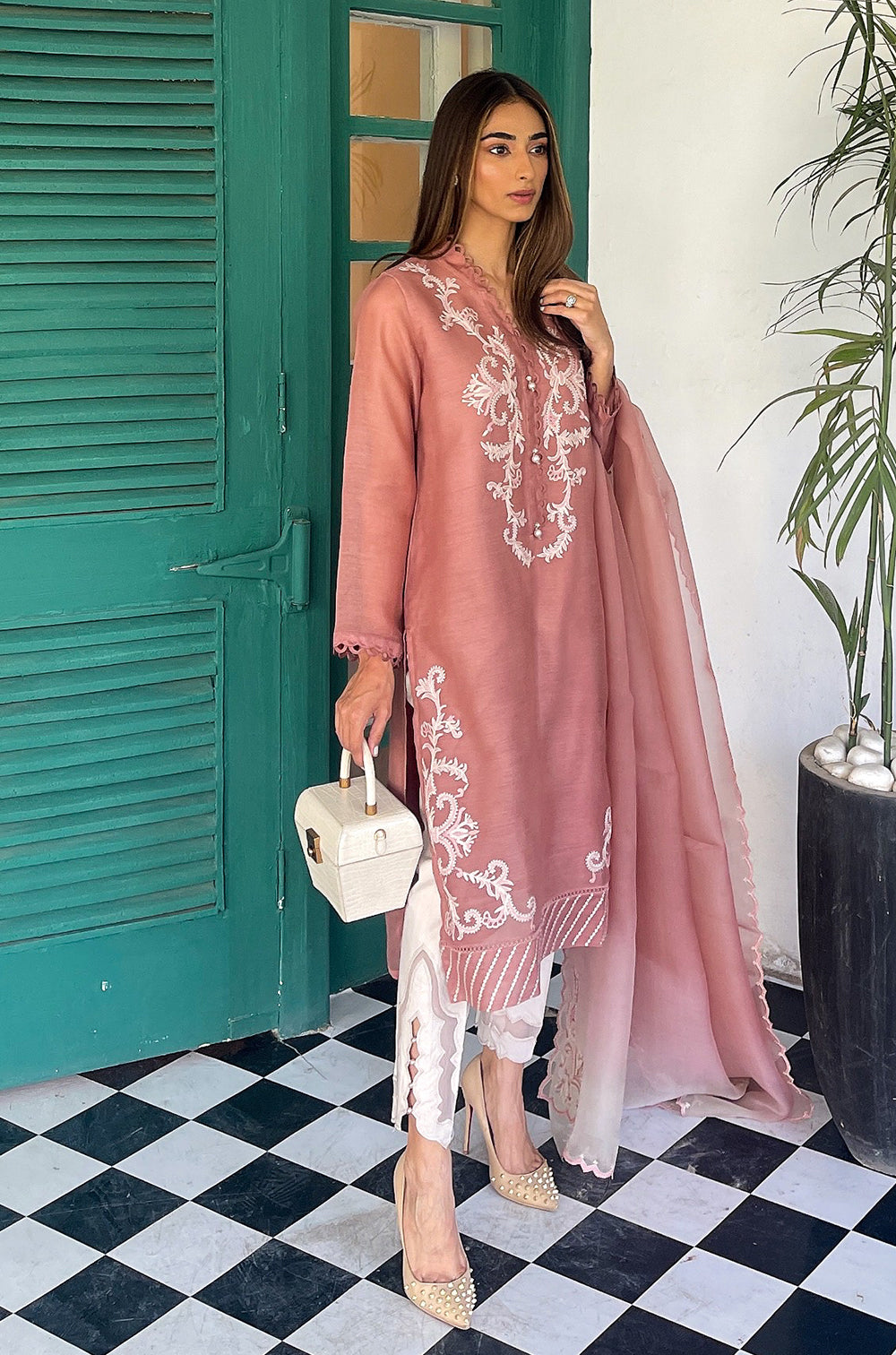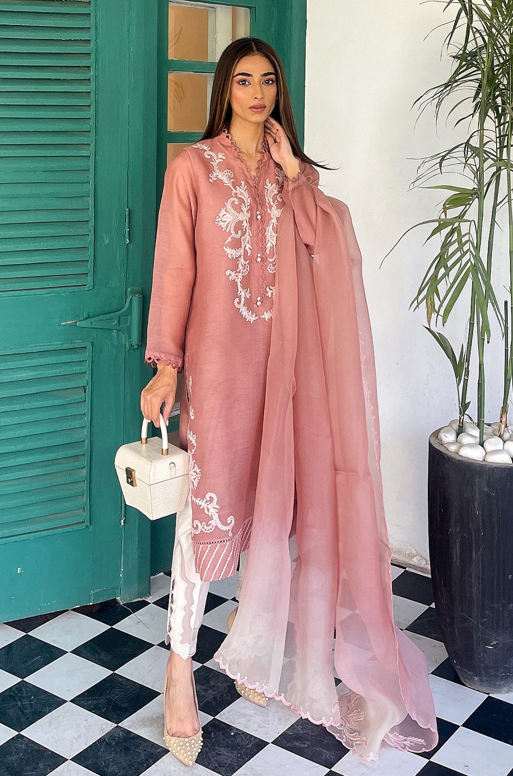 Step out in style in this this casual chic ensemble perfect for summer soirées. Contrasting cotton stretch trousers and an organza Dupatta resplendent with embroidered edges completes the look.
