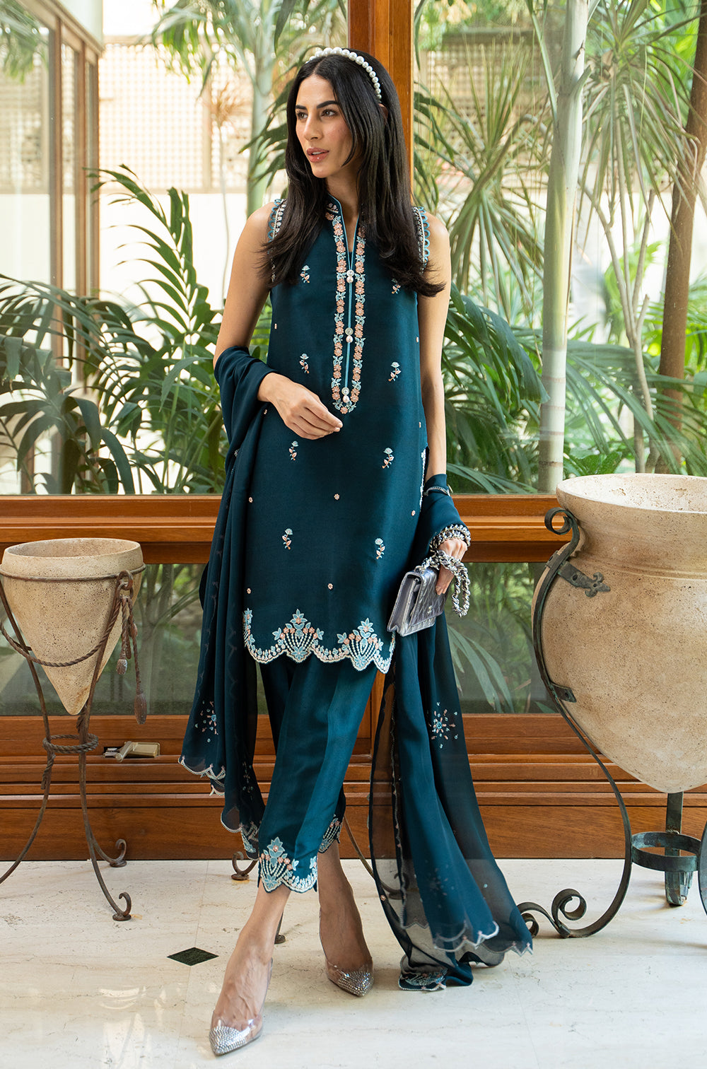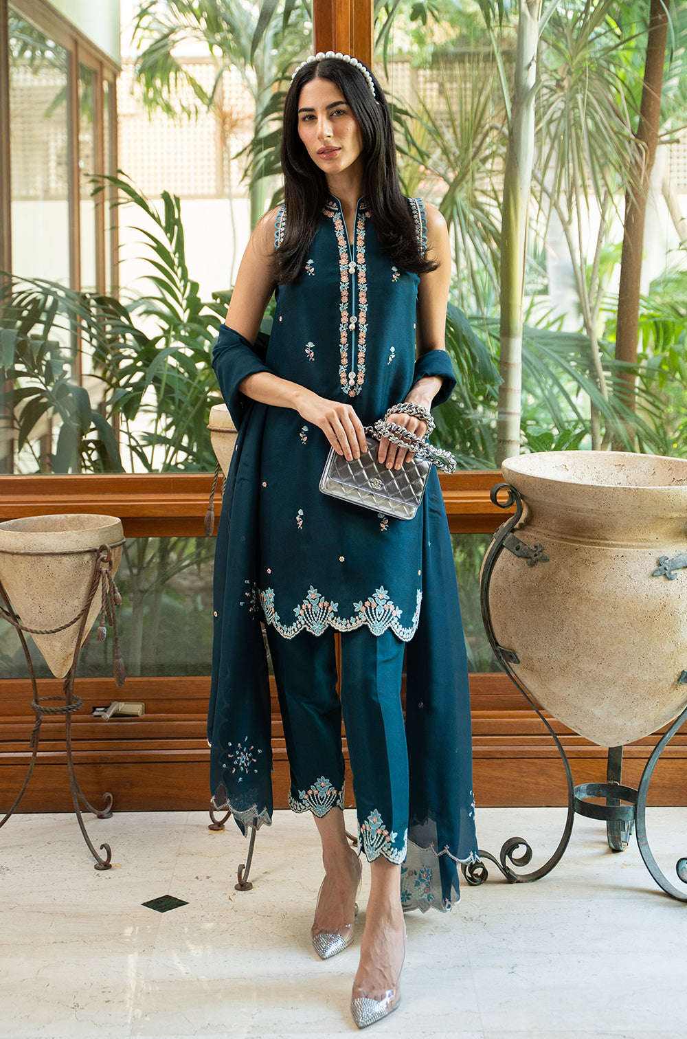Chic and classy this rawsilk ensemble is elevated with delicate reshum hand embroidery… comes with matching rawsilk trousers and chiffon georgette dupatta