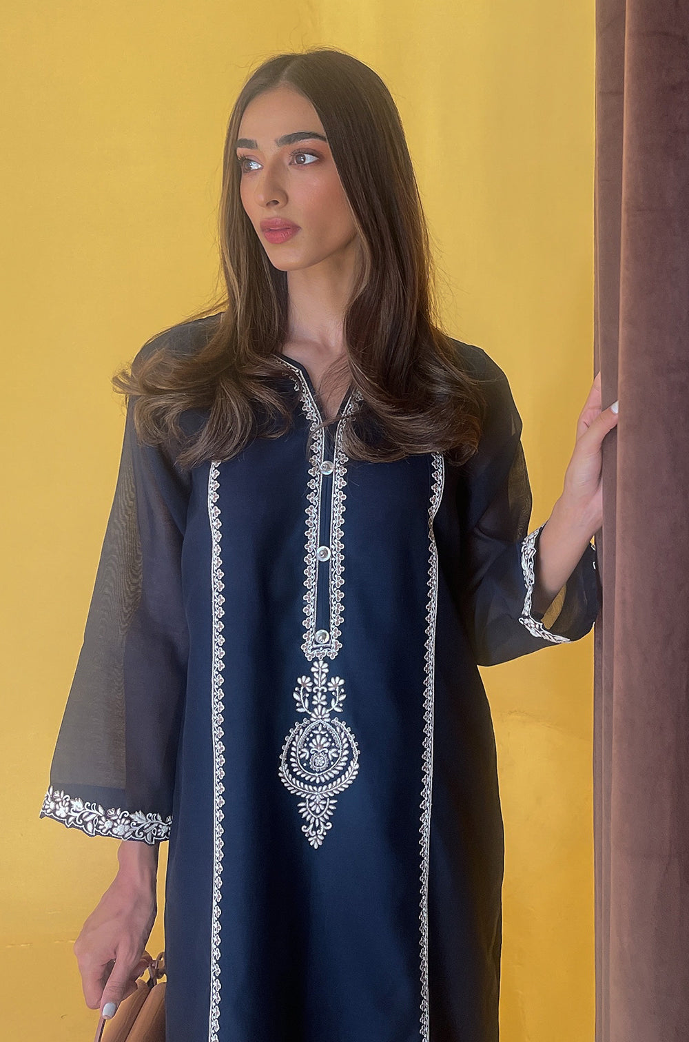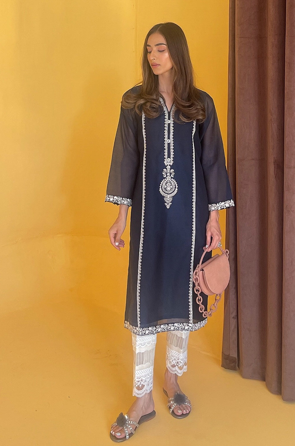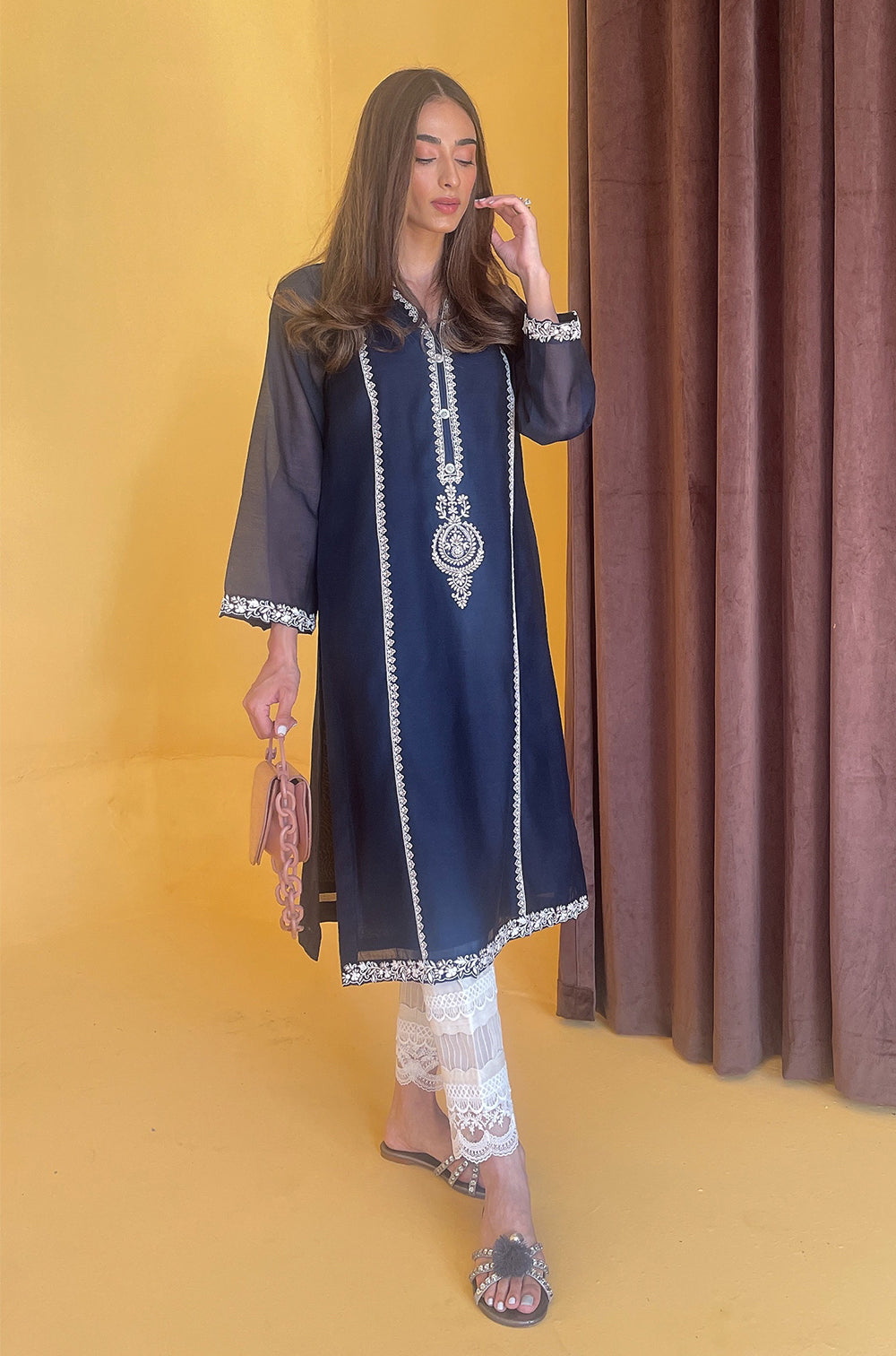 Elevate your everyday style with this classic navy and white combination. The shirt is delicately hand embroidered in contrasting silk thread, making it a garment that can be enjoyed season after season