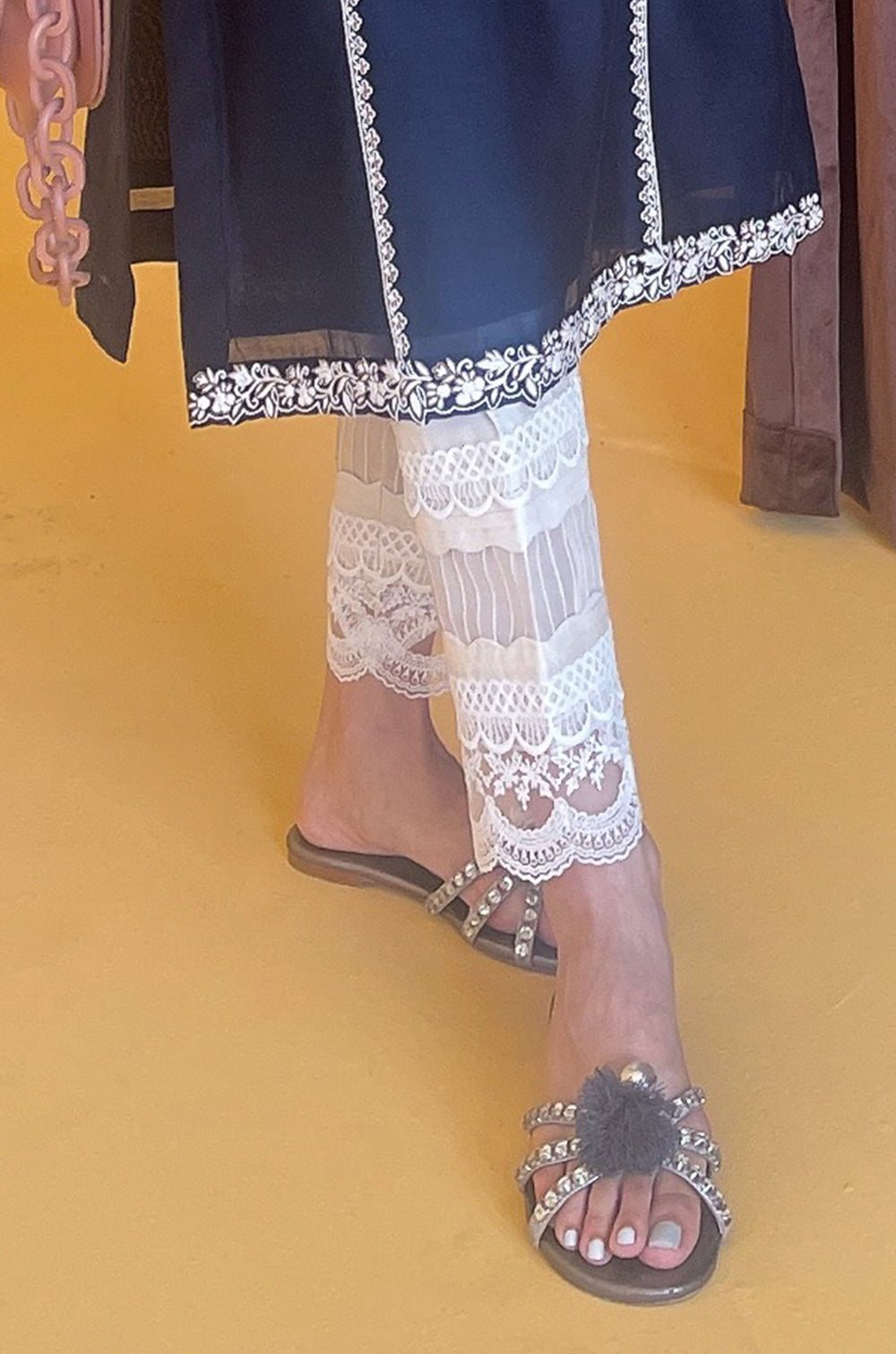 Casual pants featuring fabric manipulation and lace details