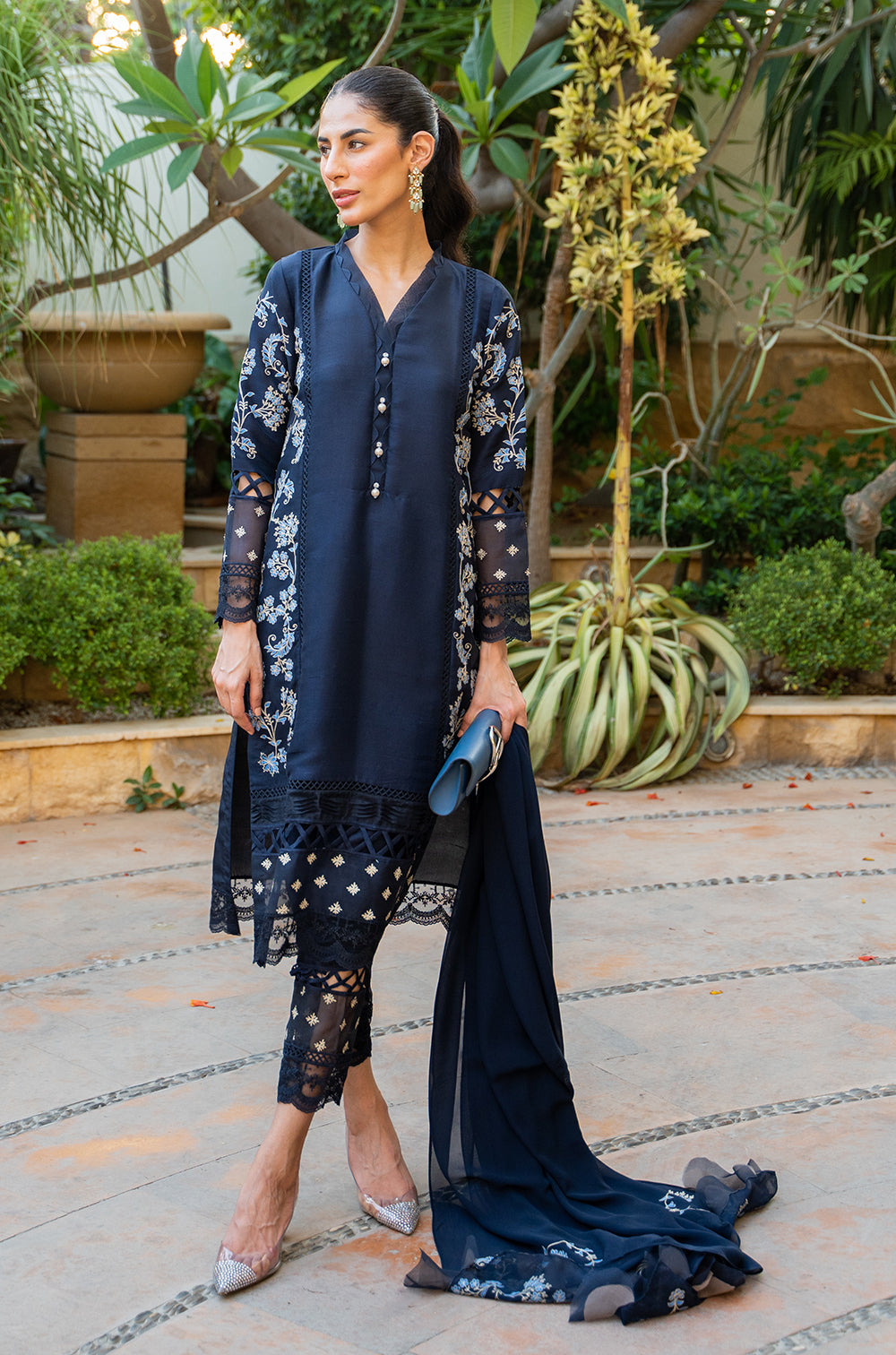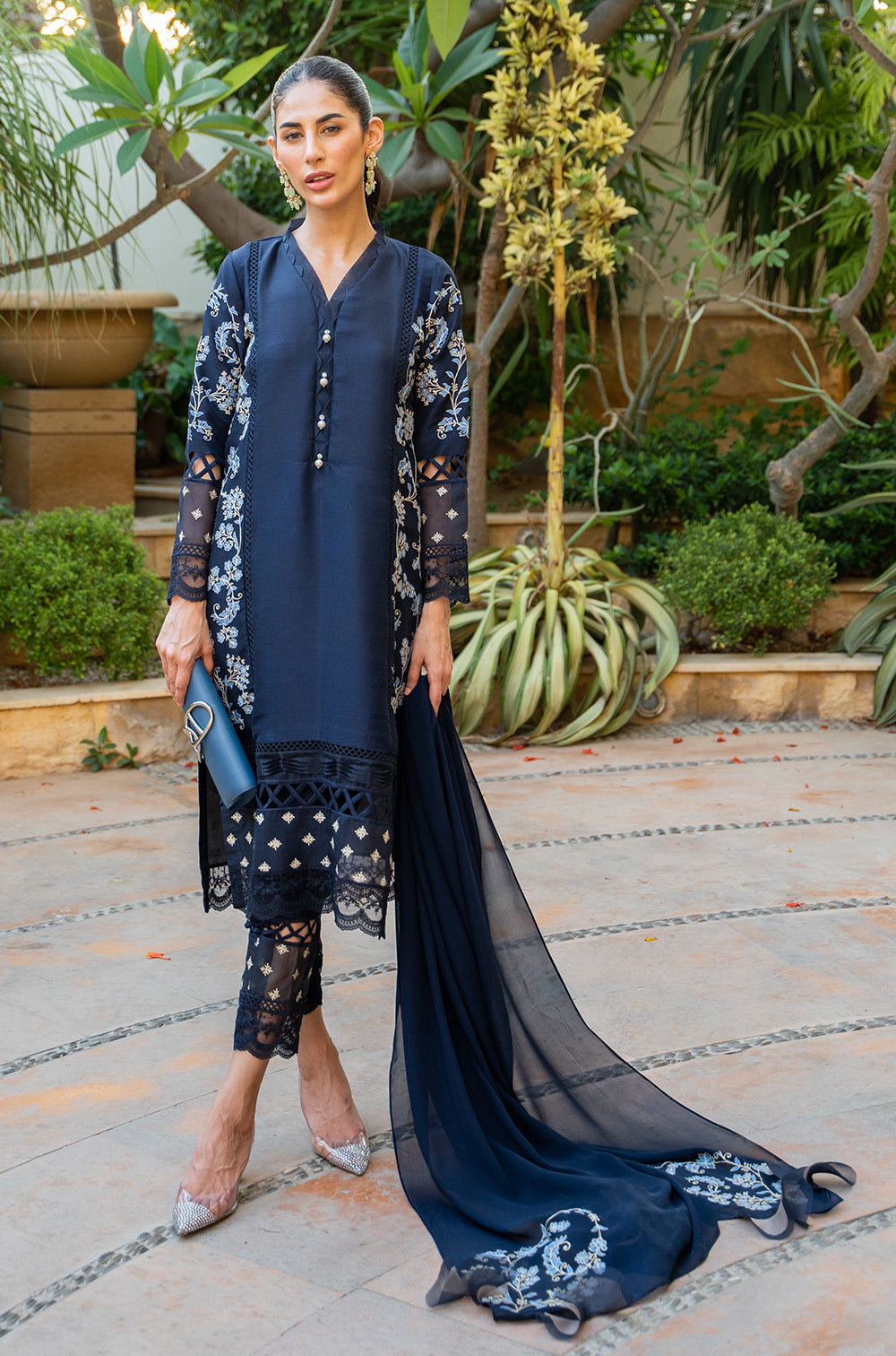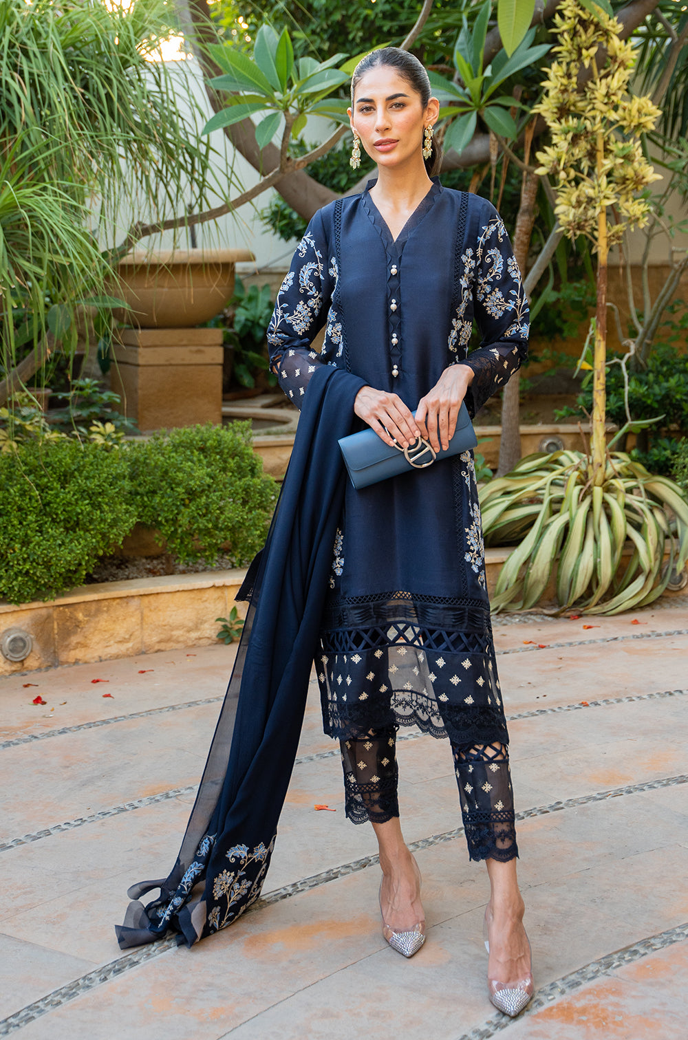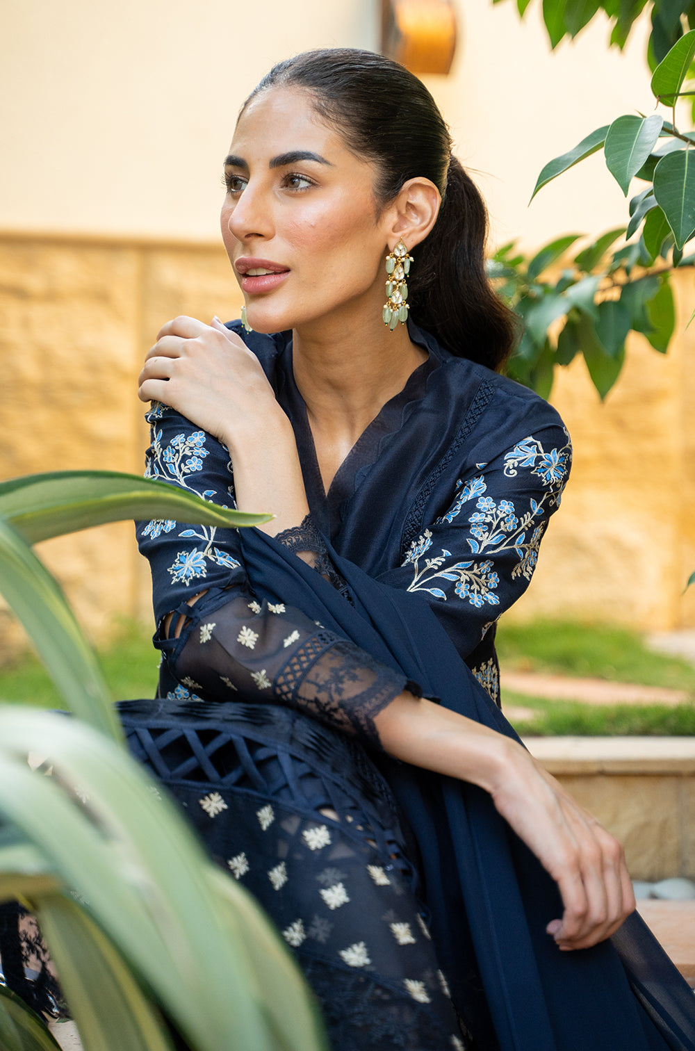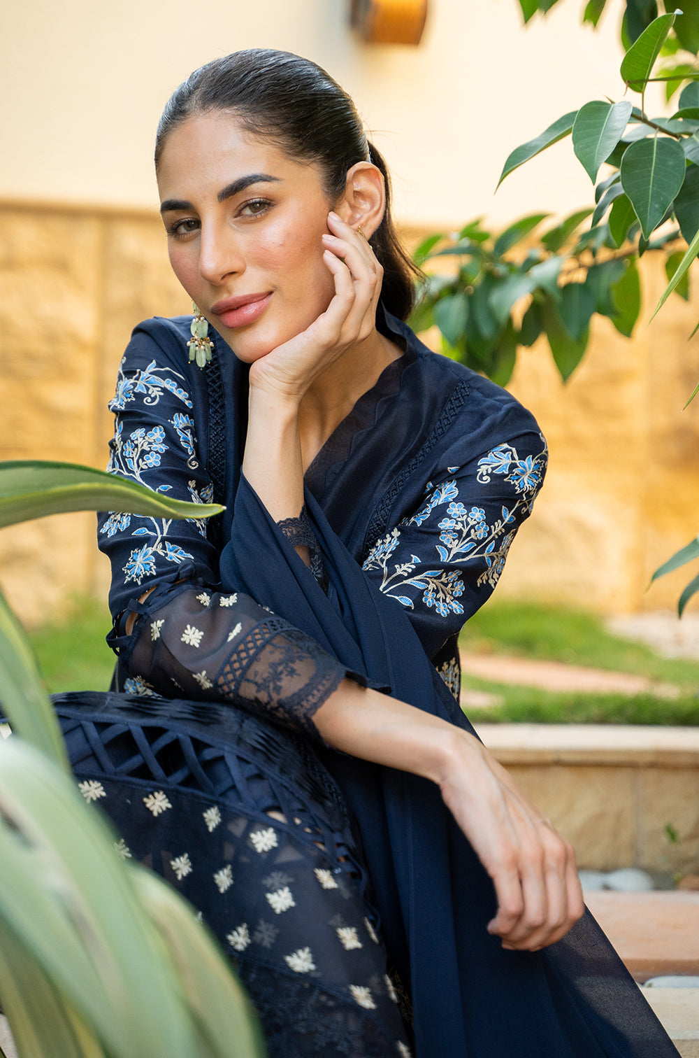 A deep shade of navy enhanced with ari embroidery and our signature fabric manipulation details.