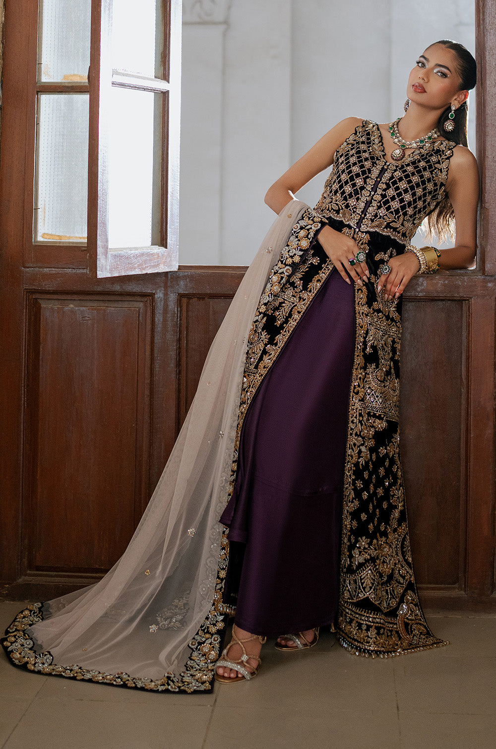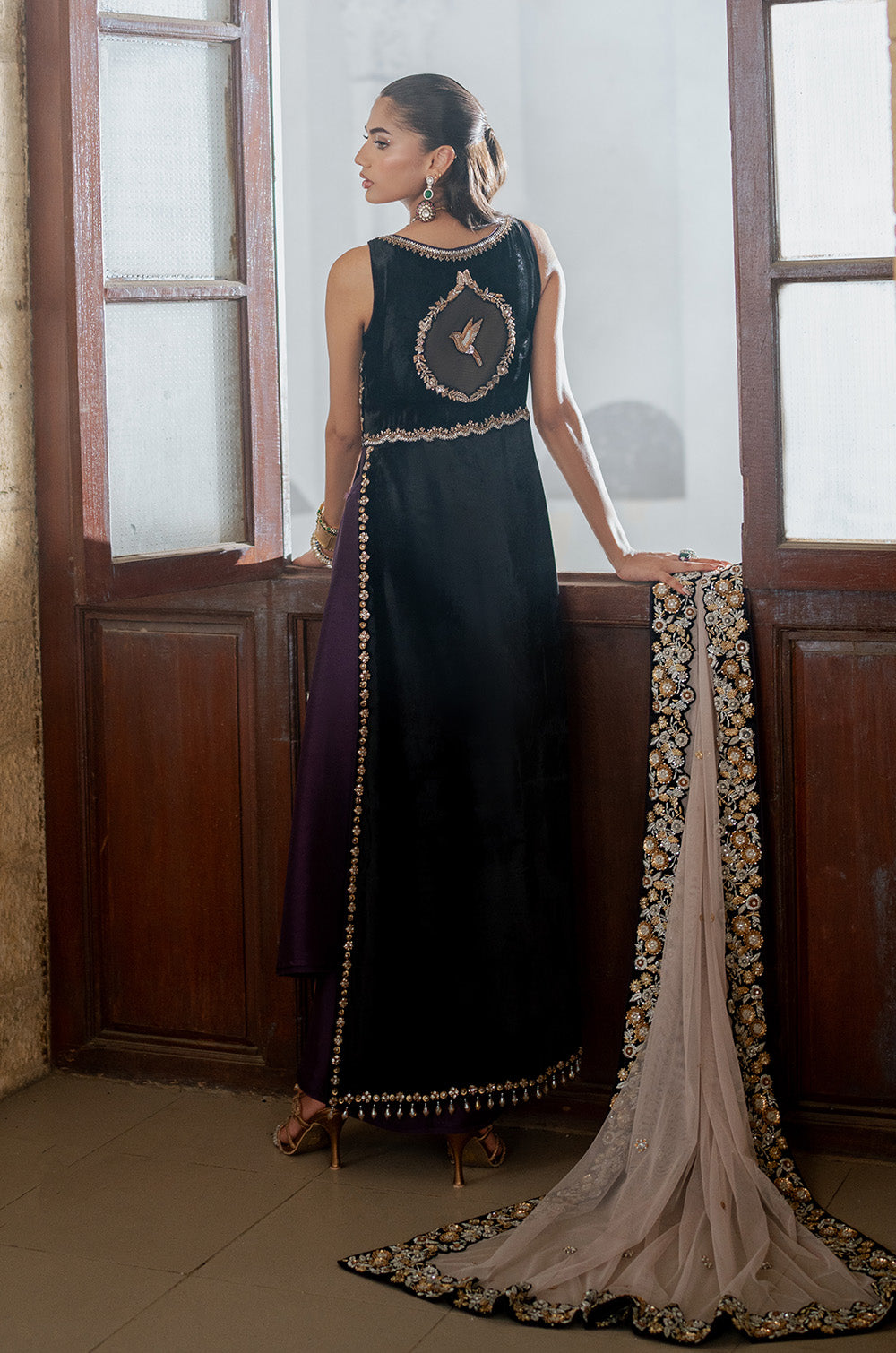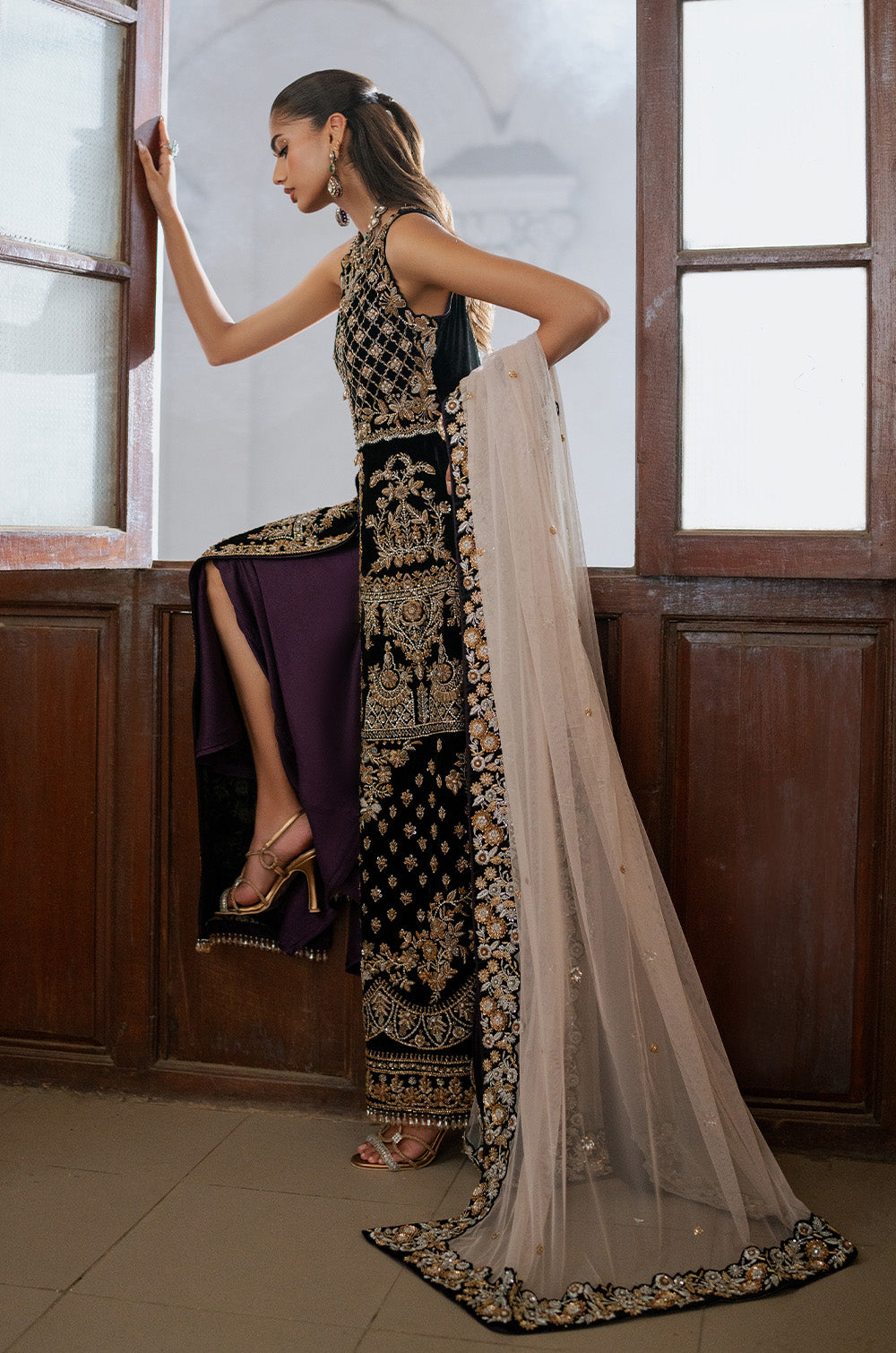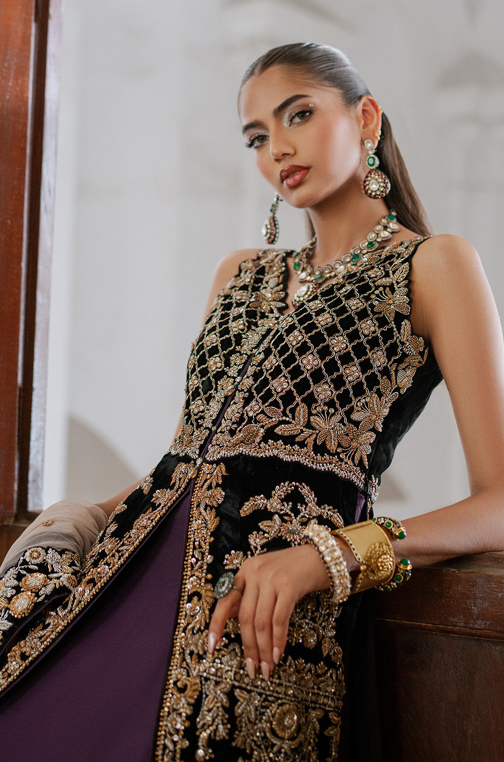 Front open black french velvet long shirt with handwork borders and jaal on the shirt. The back has intricate bunch of tilla and resham handwork. Comes with a deep plum lehanga and paired with a heavy hand worked bordered all side duppata in net fabric.