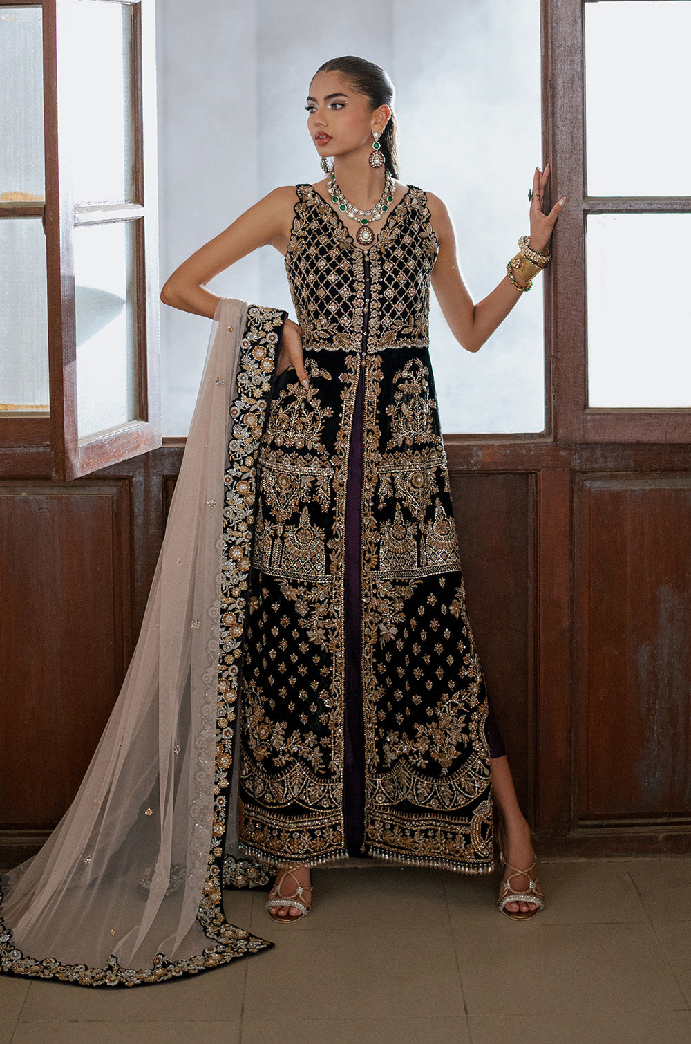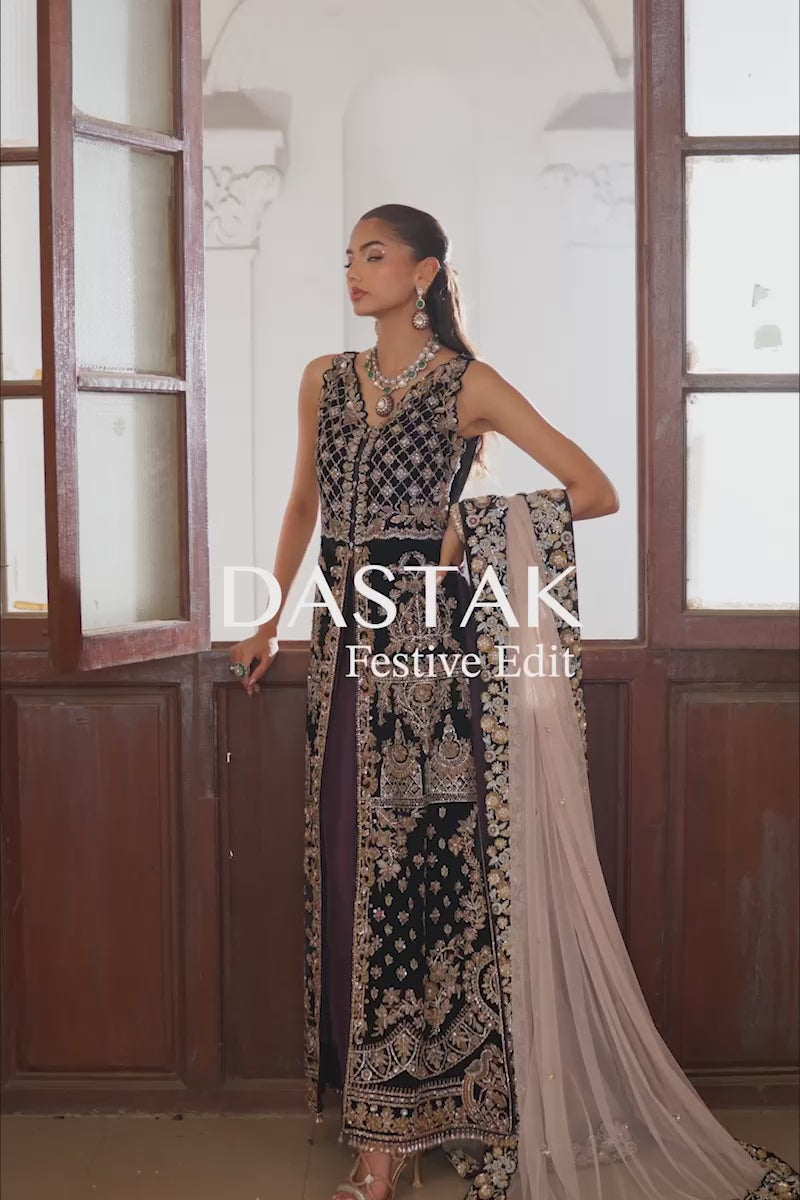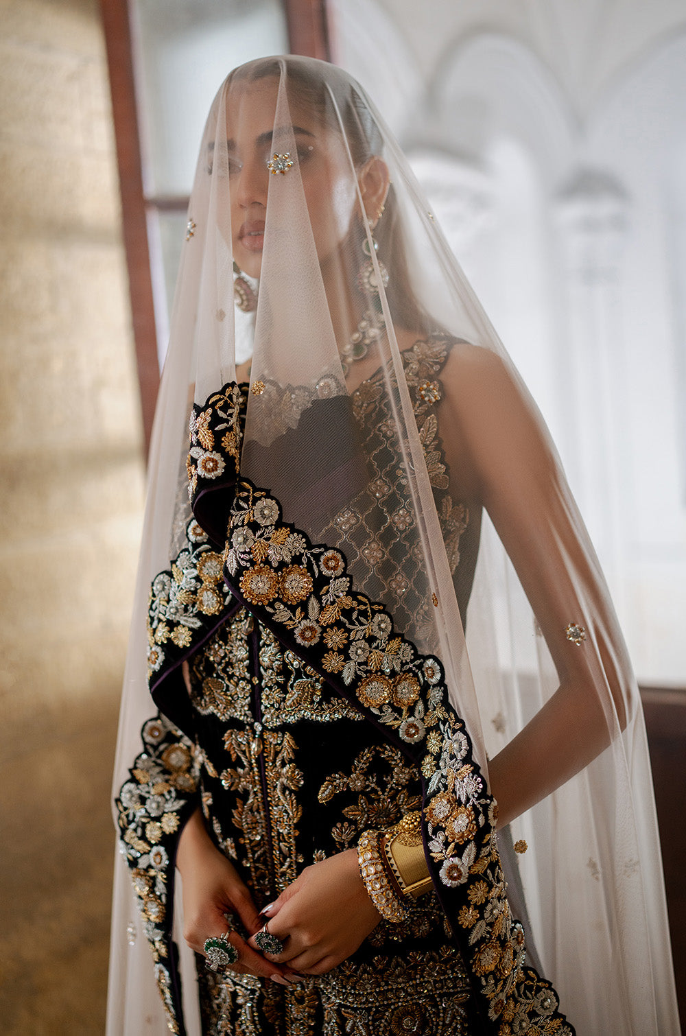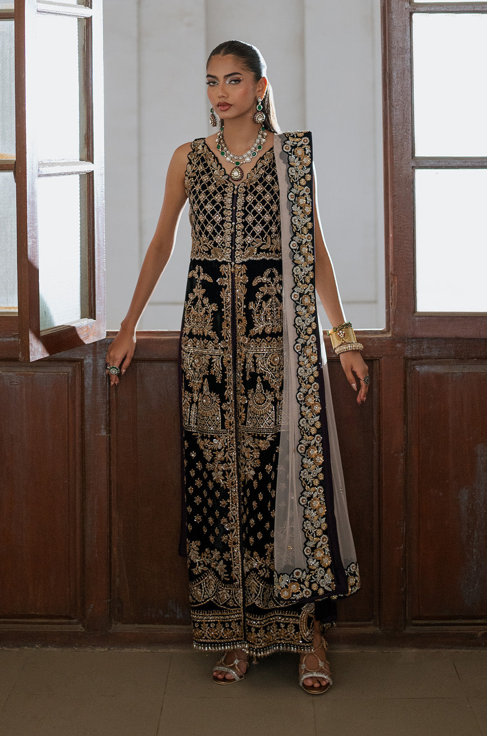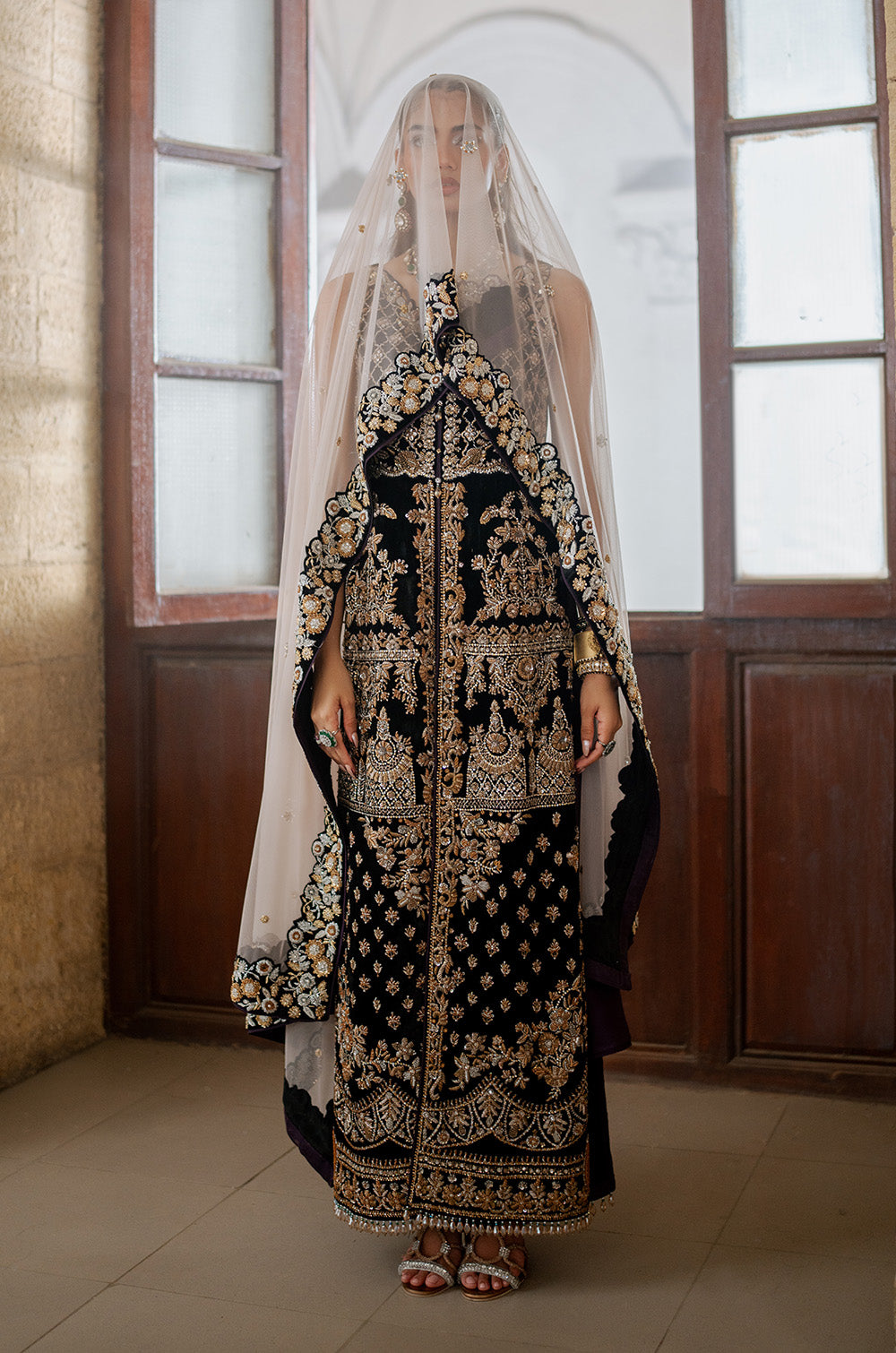 Front open black french velvet long shirt with handwork borders and jaal on the shirt. The back has intricate bunch of tilla and resham handwork. Comes with a deep plum lehanga and paired with a heavy hand worked bordered all side duppata in net fabric.