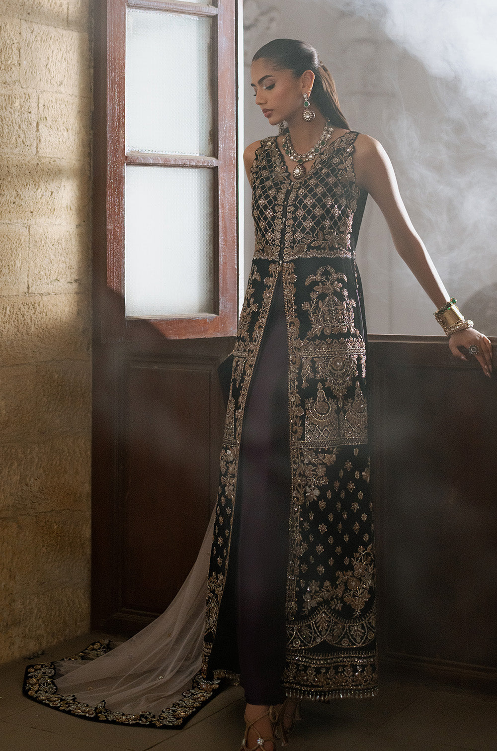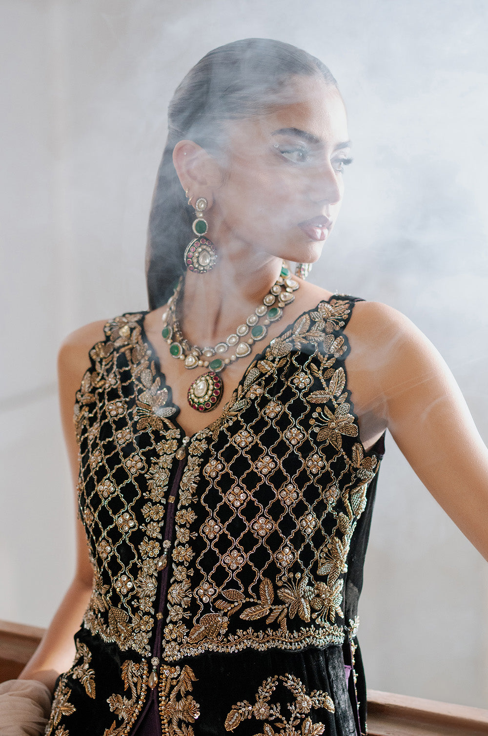 Front open black french velvet long shirt with handwork borders and jaal on the shirt. The back has intricate bunch...