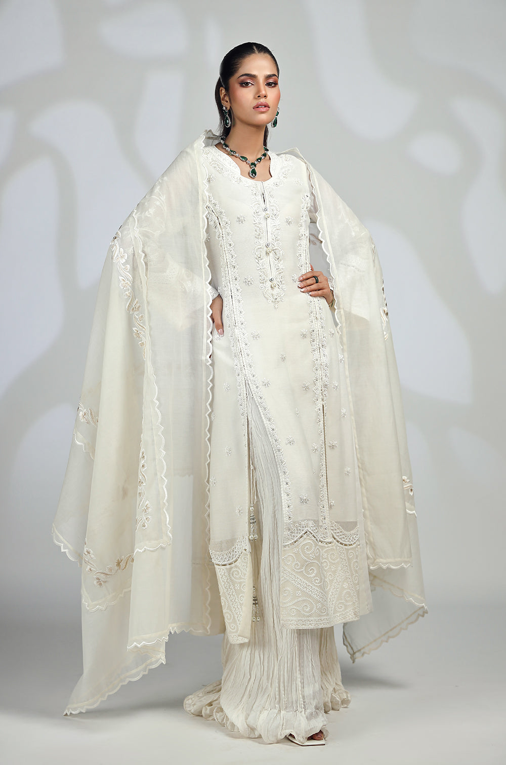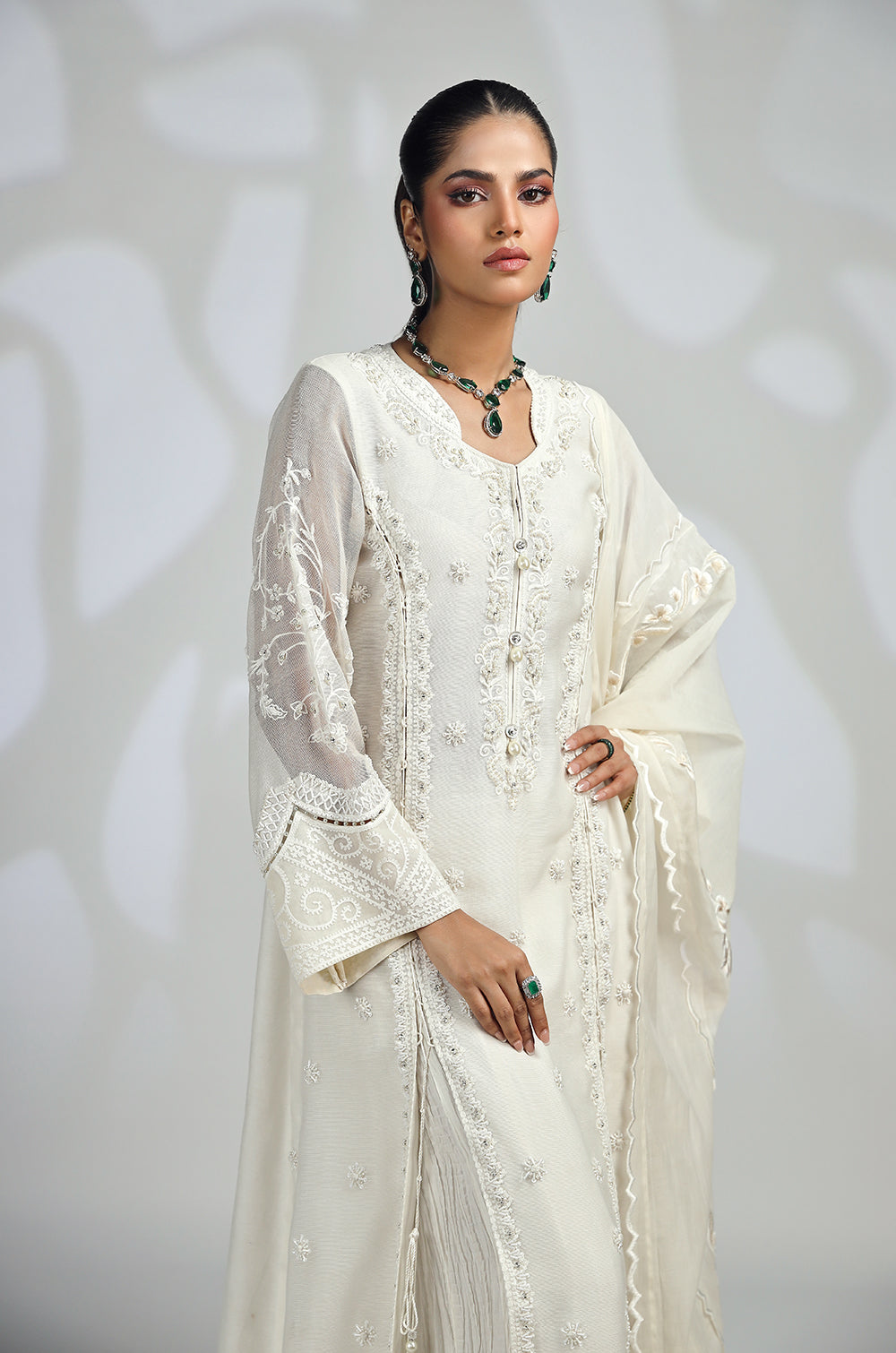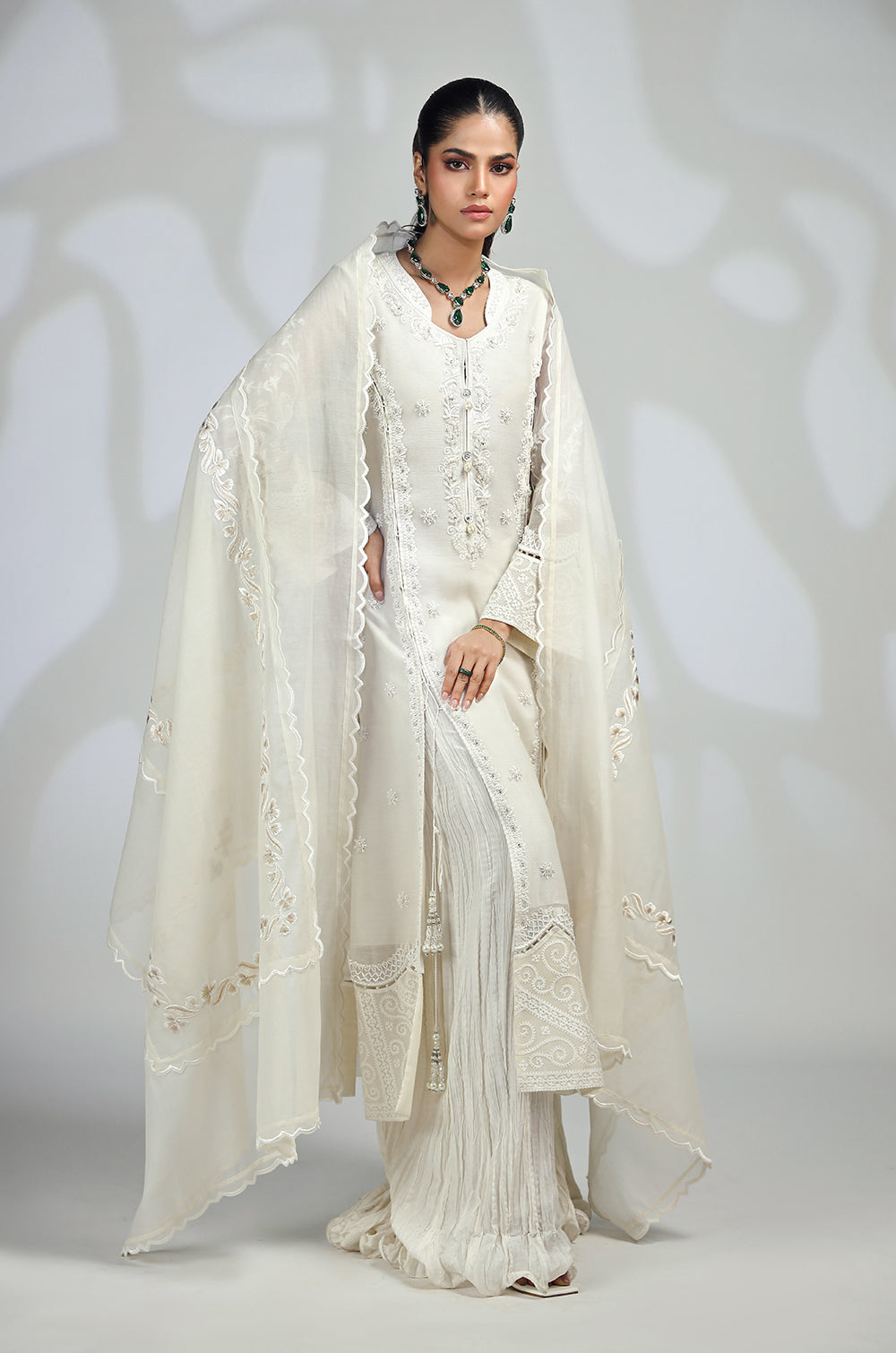 A beautiful ivory coloured cotton net shirt adorned with intricate work and thread embroidery. Featuring dori tassels in front panels. Paired with crushed culottes and organza duppata with scalloped finish and embroidered borders.
