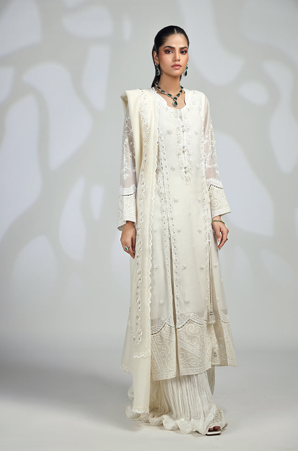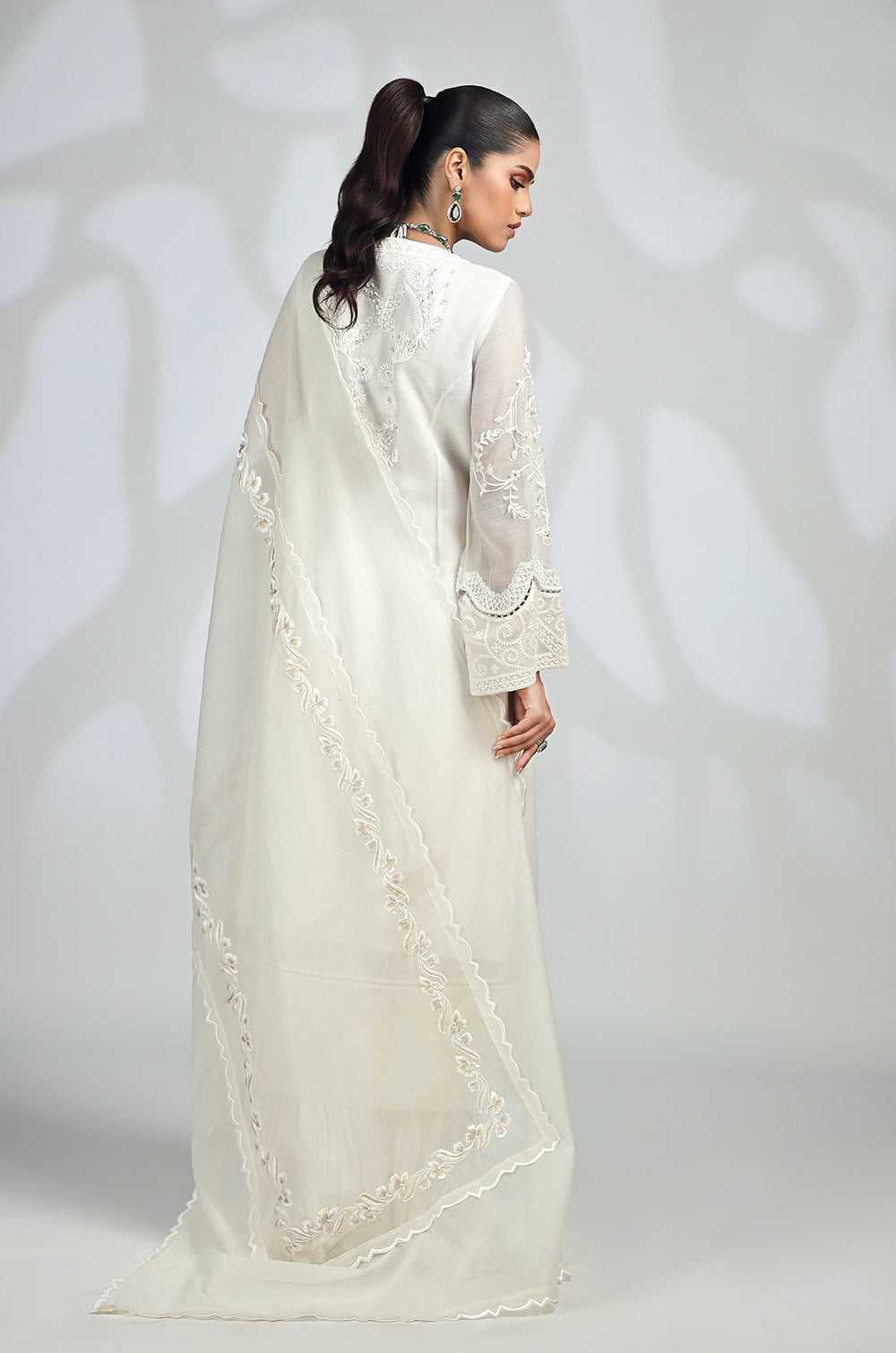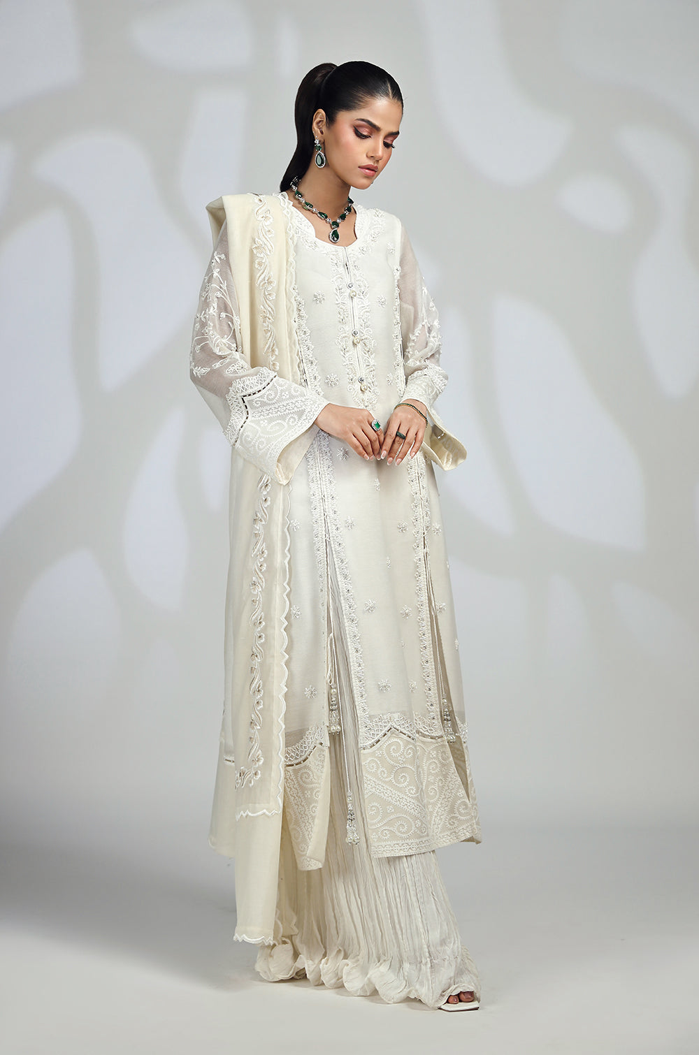 A beautiful ivory coloured cotton net shirt adorned with intricate work and thread embroidery. Featuring dori tassels in front panels. Paired with crushed culottes and organza duppata with scalloped finish and embroidered borders.