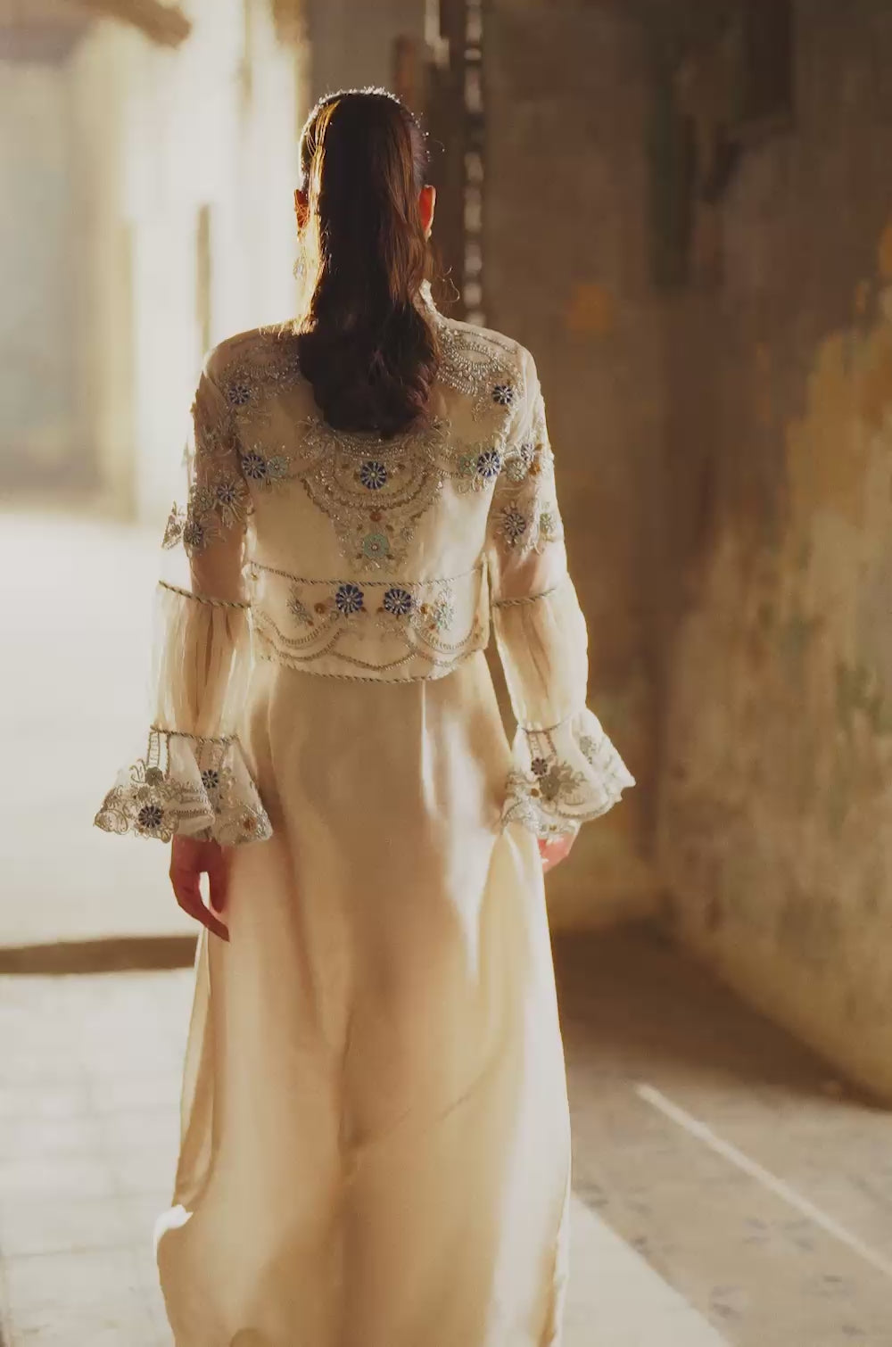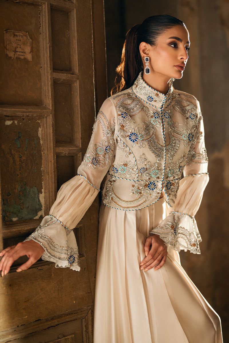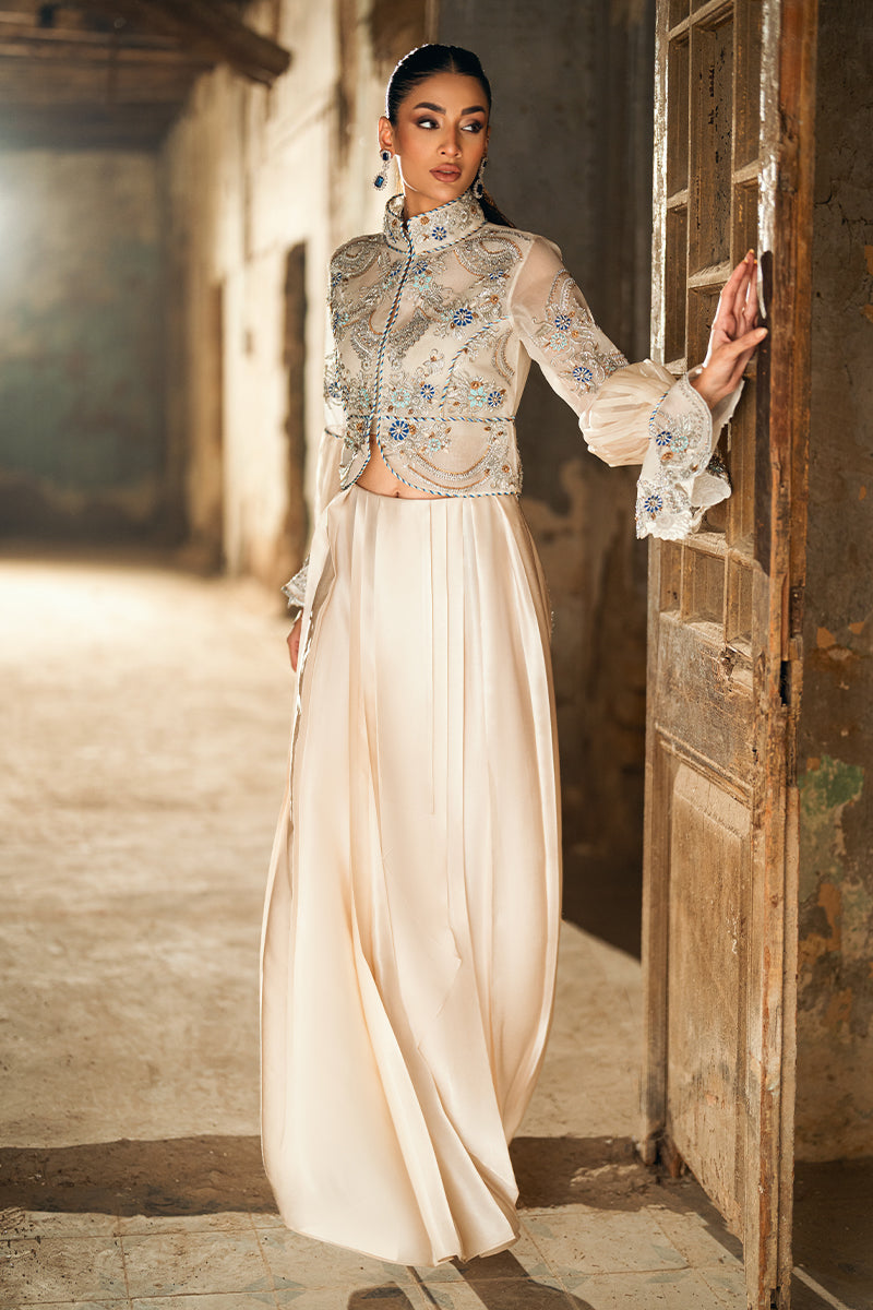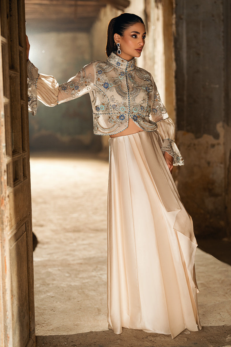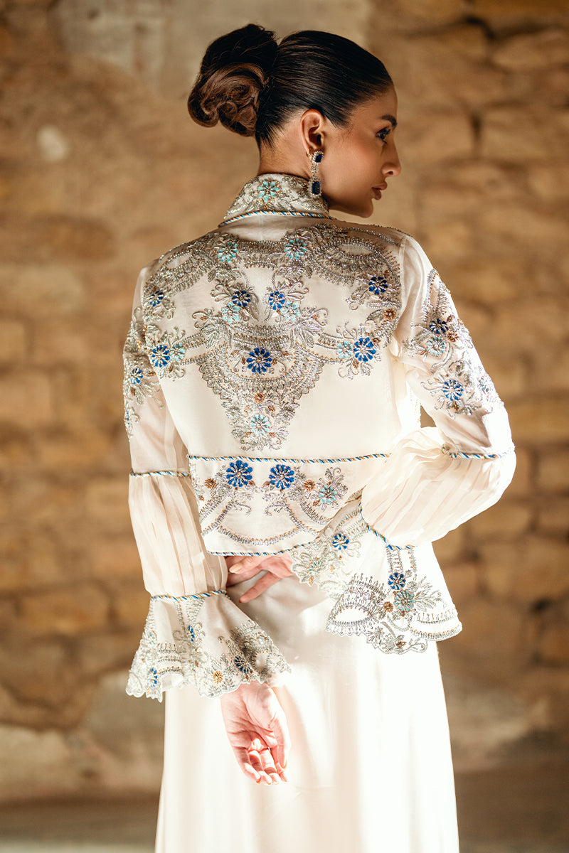 Cream-colored cropped jacket with stunning silver and blue embroidery, adorned with puffy sleeves and ruffled cuffs. Paired with a sarong.