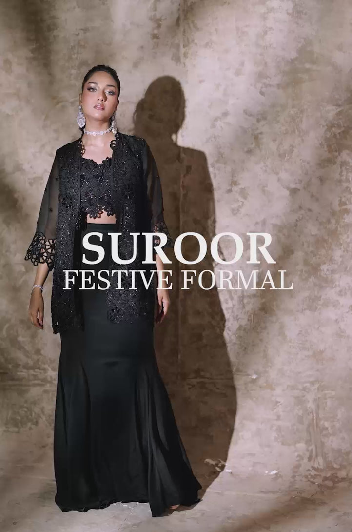 Make a dramatic entrance with this stunning black organza jacket, featuring intricate, all-over self- handwork embroidery and floral cutwork detailing...
