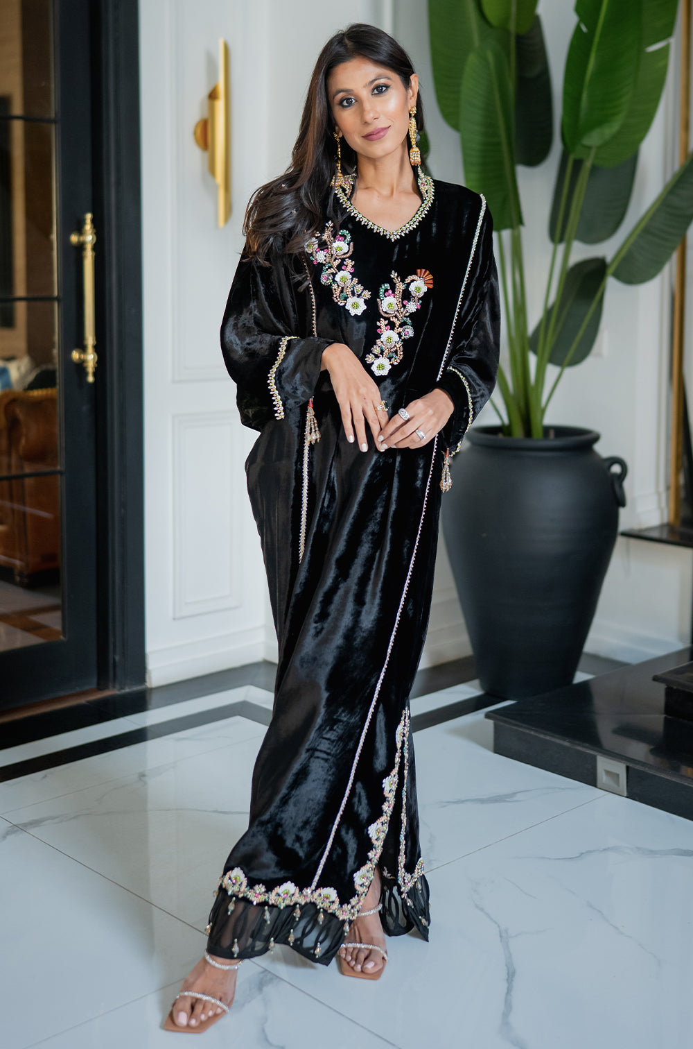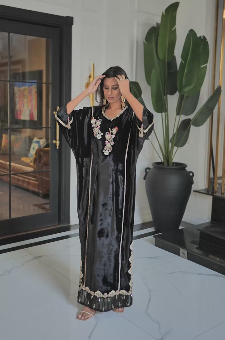 pure French velvet caftan exudes grace, with multi-embroidered motifs and line detailings all over and heavy embellishment on the side...